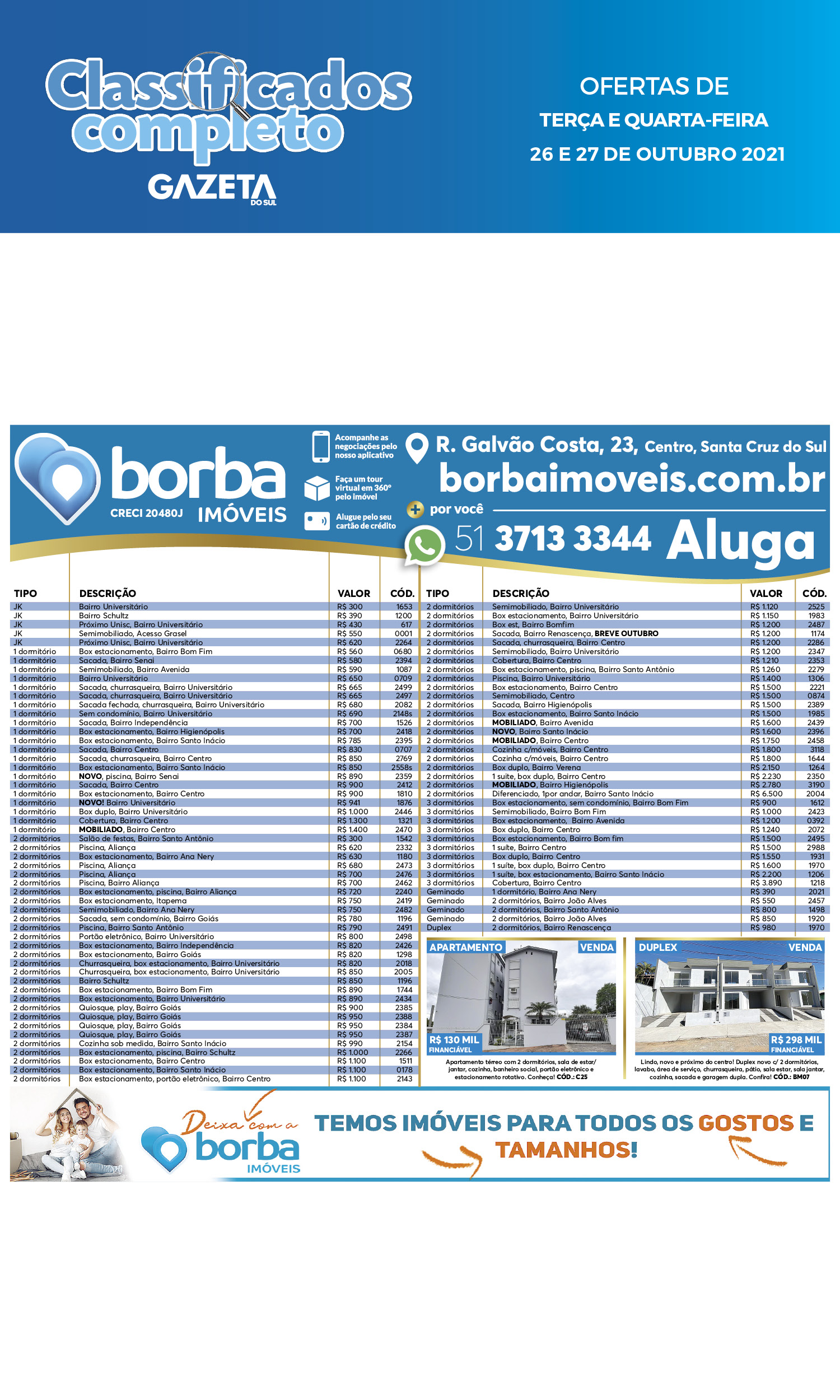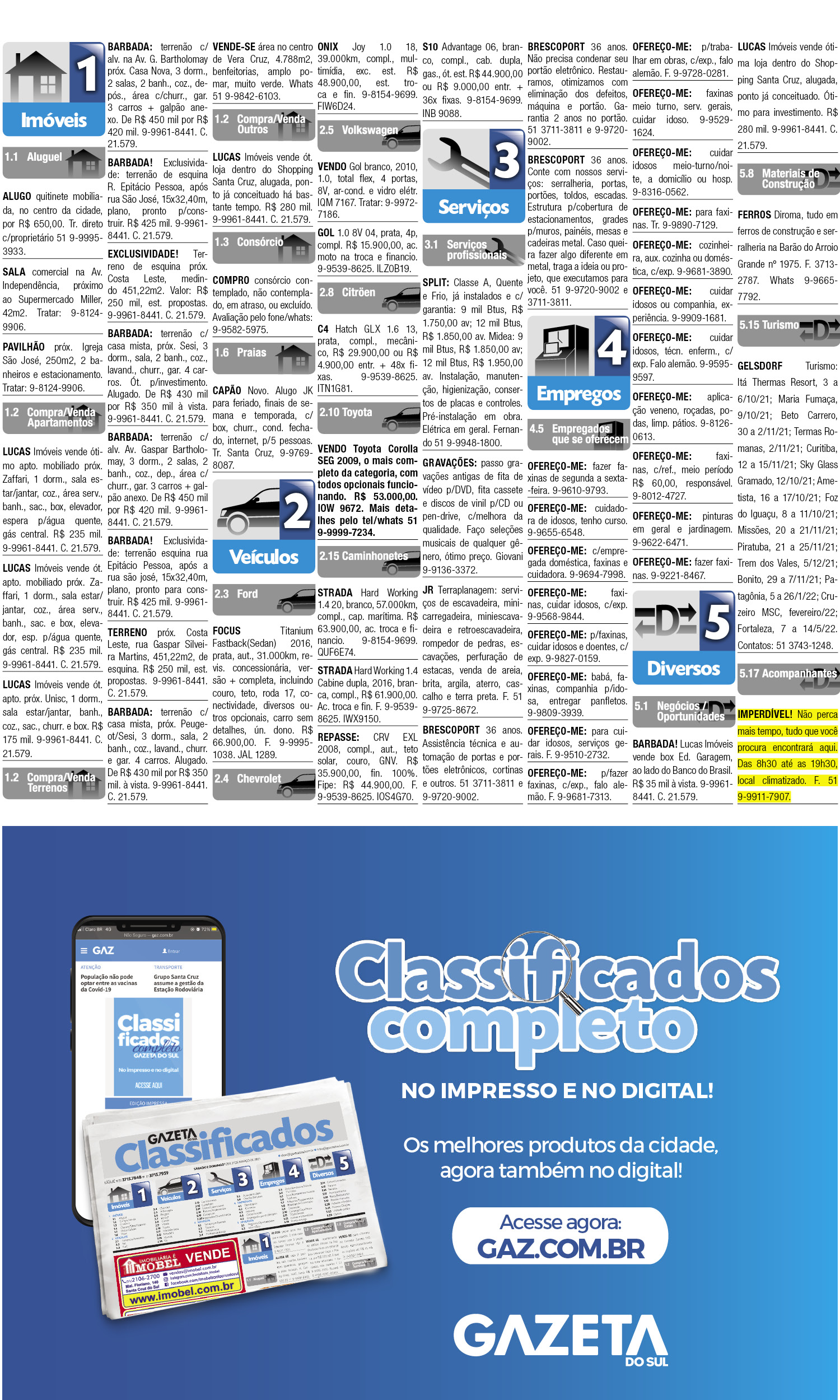 O suplemento de Classificados, que circula nas edições de terças, quintas e sábados, é um dos mais tradicionais da Gazeta do Sul, como vitrine e canal de negócios, de oferta, compra e venda em toda a região central do Rio Grande do Sul. E, para enriquecer pesquisas de produtos e serviços e possibilitar resultado ainda melhor a usuários e parceiros, nos anúncios de clientes cadastrados, o leitor tem acesso direto com link ao site do anunciante, onde poderá verificar mais detalhes sobre os itens. Confira as ofertas: