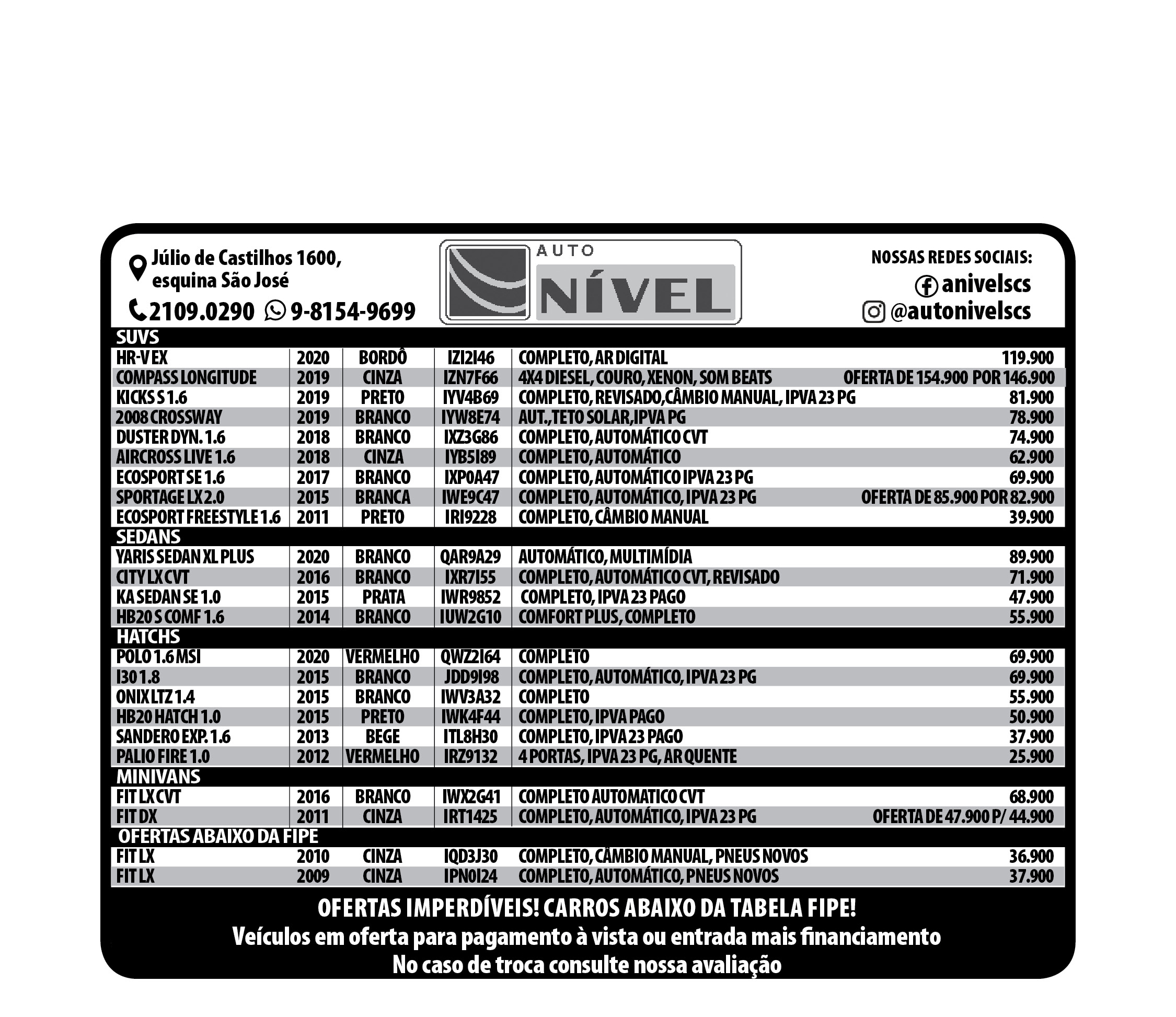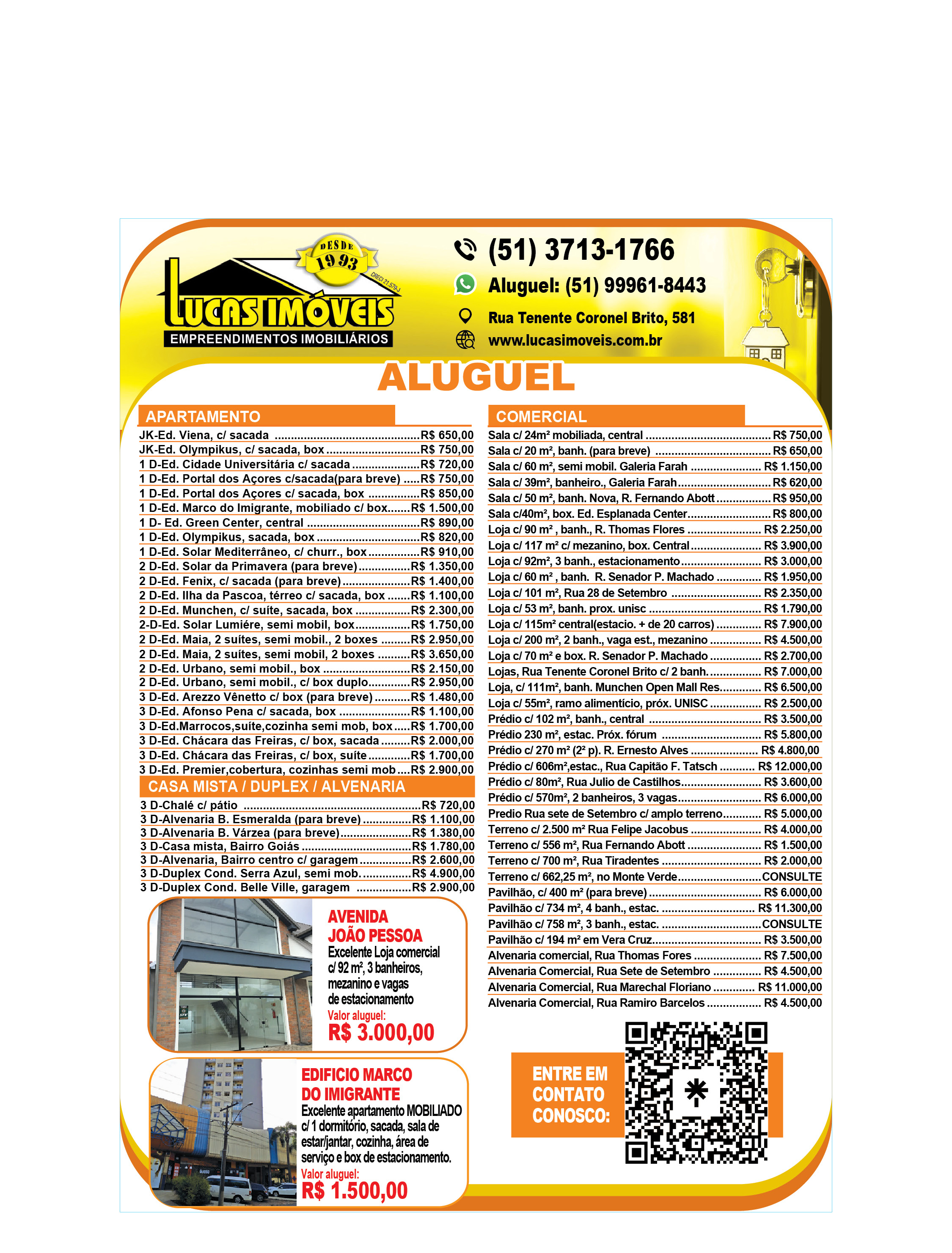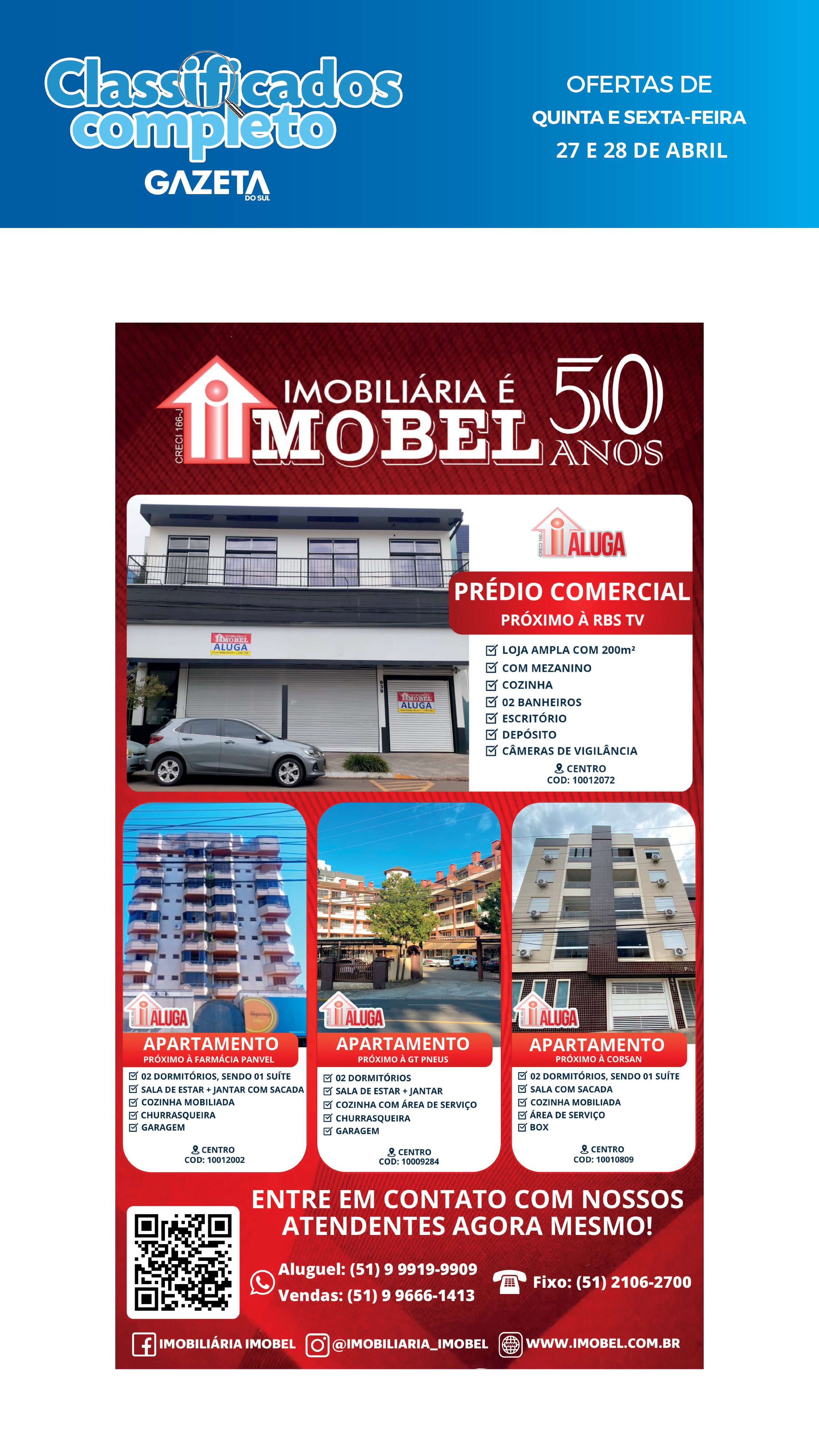 O suplemento de Classificados, que circula nas edições de terças, quintas e sábados, é um dos mais tradicionais da Gazeta do Sul, como vitrine e canal de negócios, de oferta, compra e venda em toda a região central do Rio Grande do Sul. E, para enriquecer pesquisas de produtos e serviços e possibilitar resultado ainda melhor a usuários e parceiros, nos anúncios de clientes cadastrados, o leitor tem acesso direto com link ao site do anunciante, onde poderá verificar mais detalhes sobre os itens. Confira as ofertas: