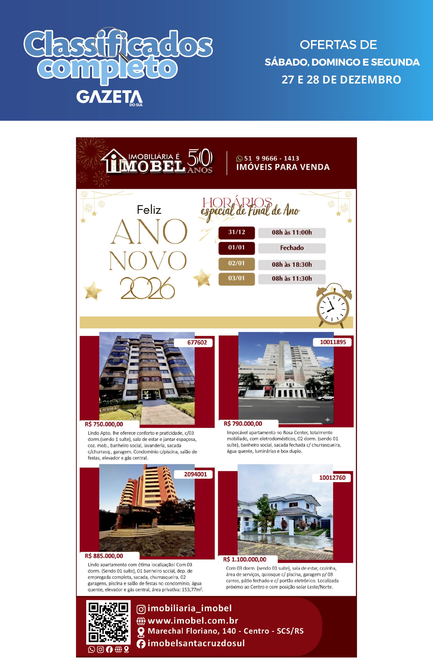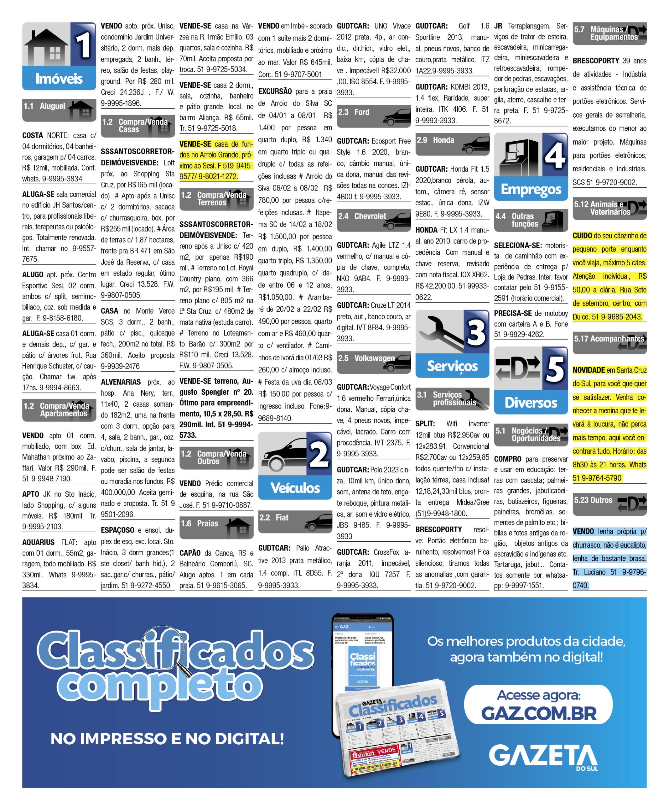 O suplemento de Classificados, que circula nas edições de terças, quintas e sábados, é um dos mais tradicionais da Gazeta do Sul, como vitrine e canal de negócios, de oferta, compra e venda em toda a região central do Rio Grande do Sul. E, para enriquecer pesquisas de produtos e serviços e possibilitar resultado ainda melhor a usuários e parceiros, nos anúncios de clientes cadastrados, o leitor tem acesso direto com link ao site do anunciante, onde poderá verificar mais detalhes sobre os itens. Confira as ofertas: