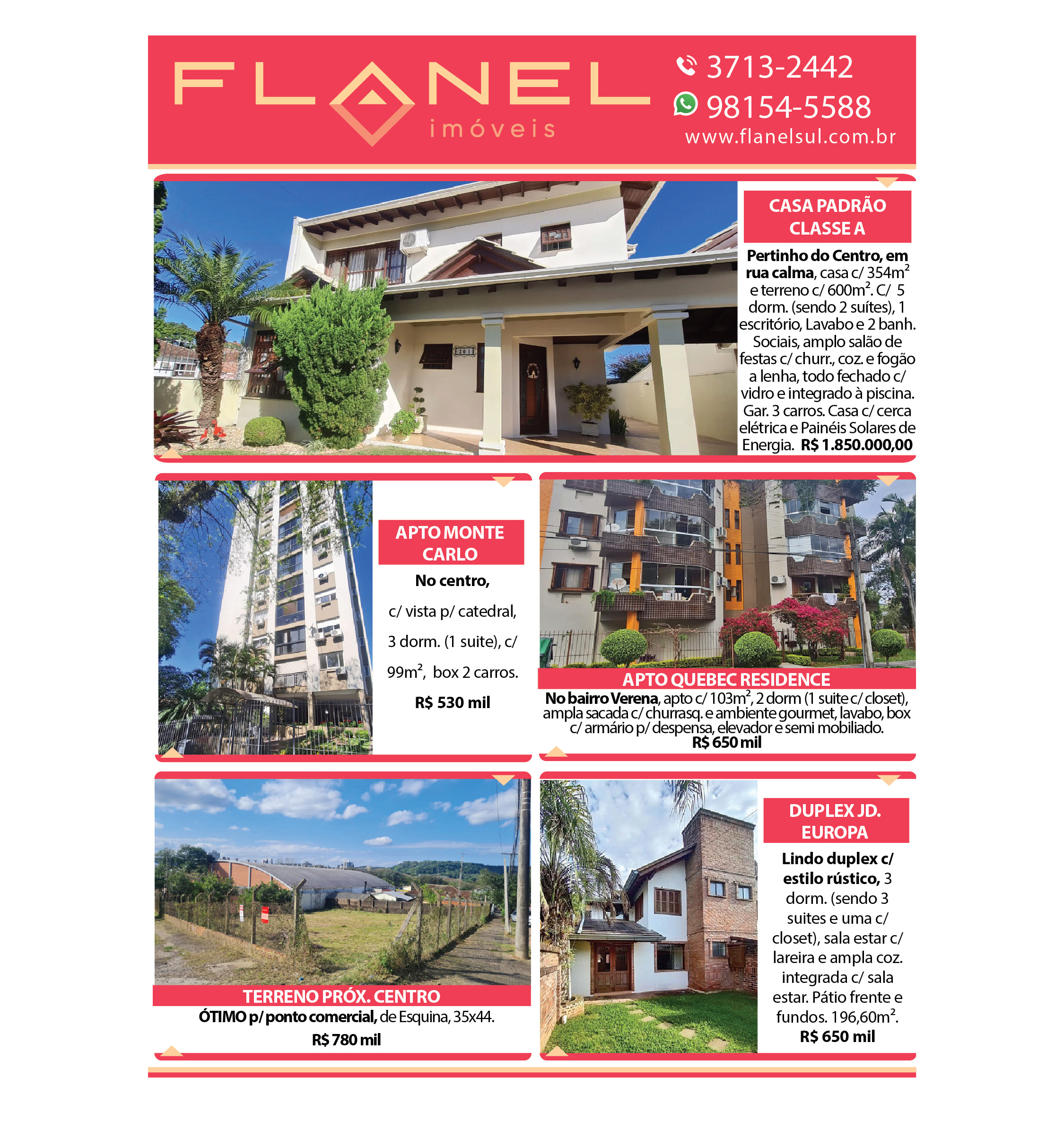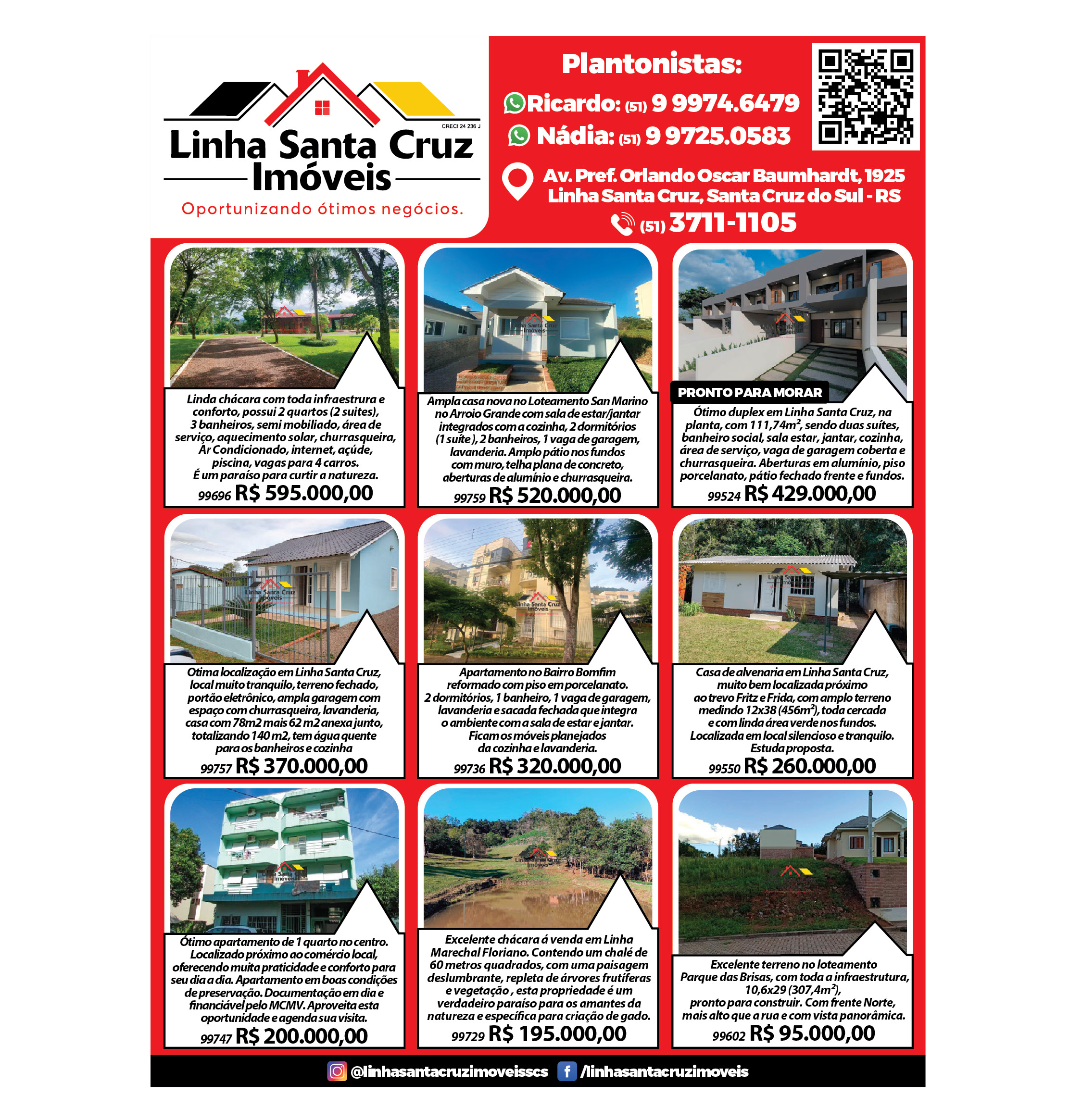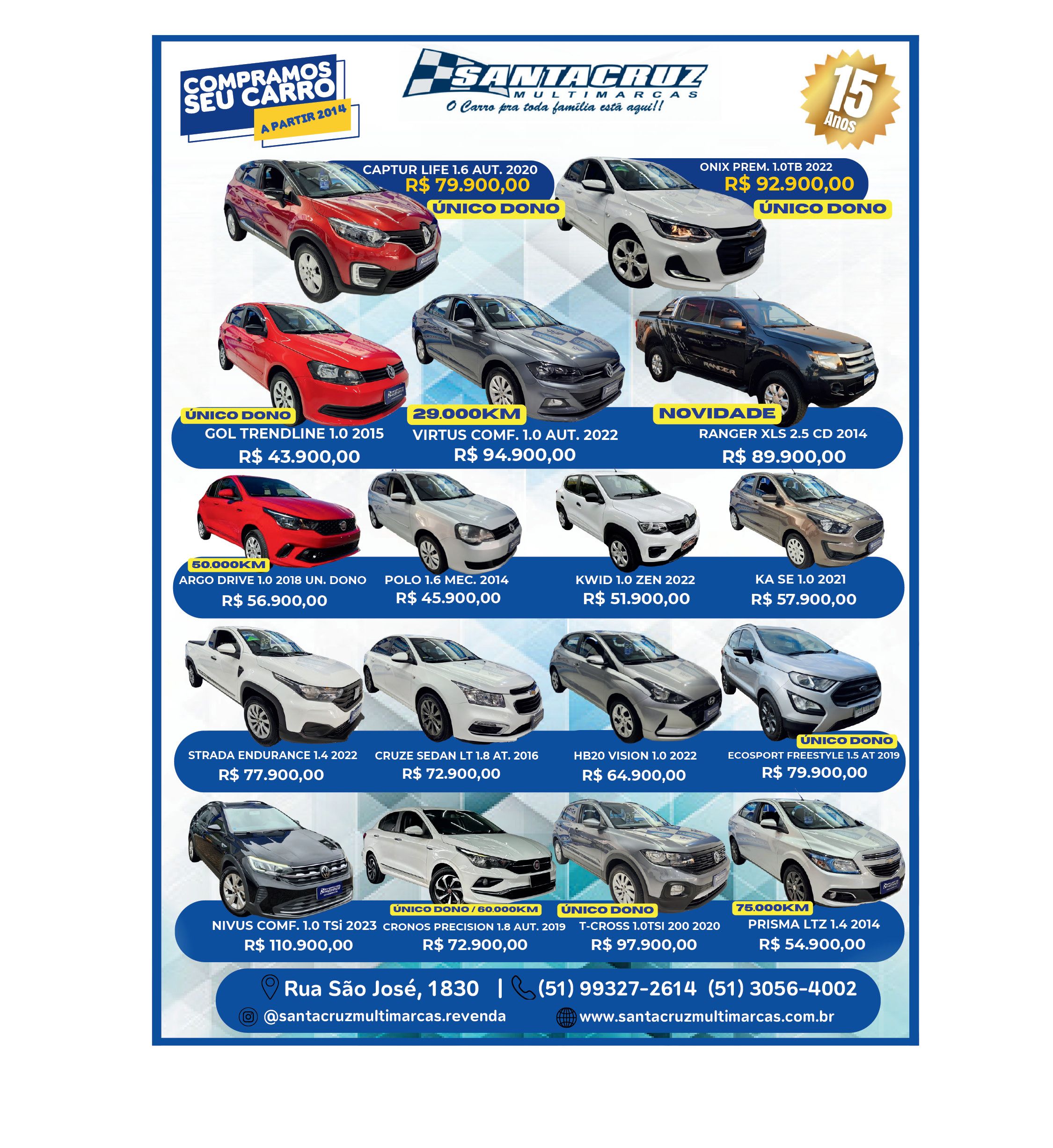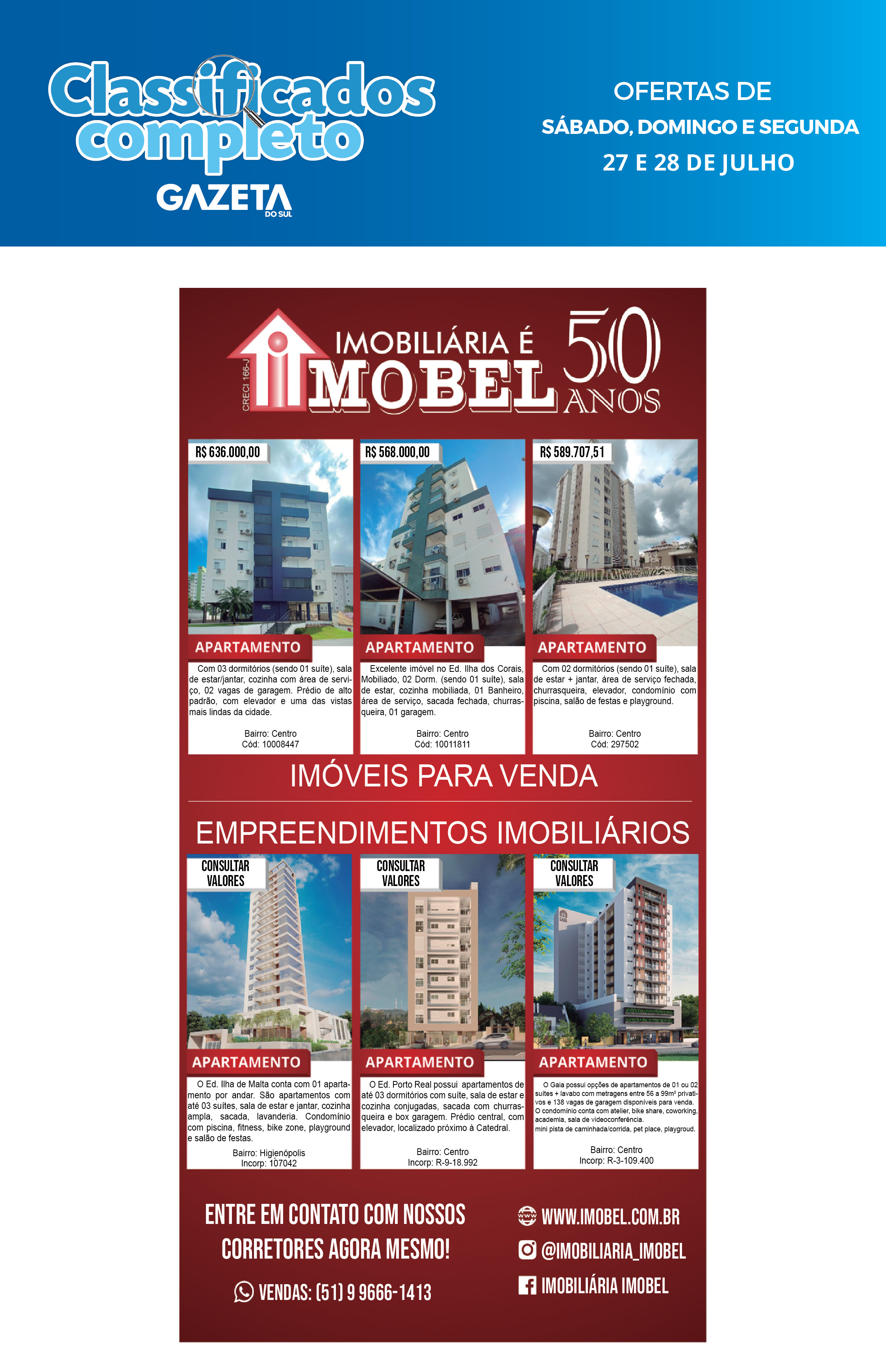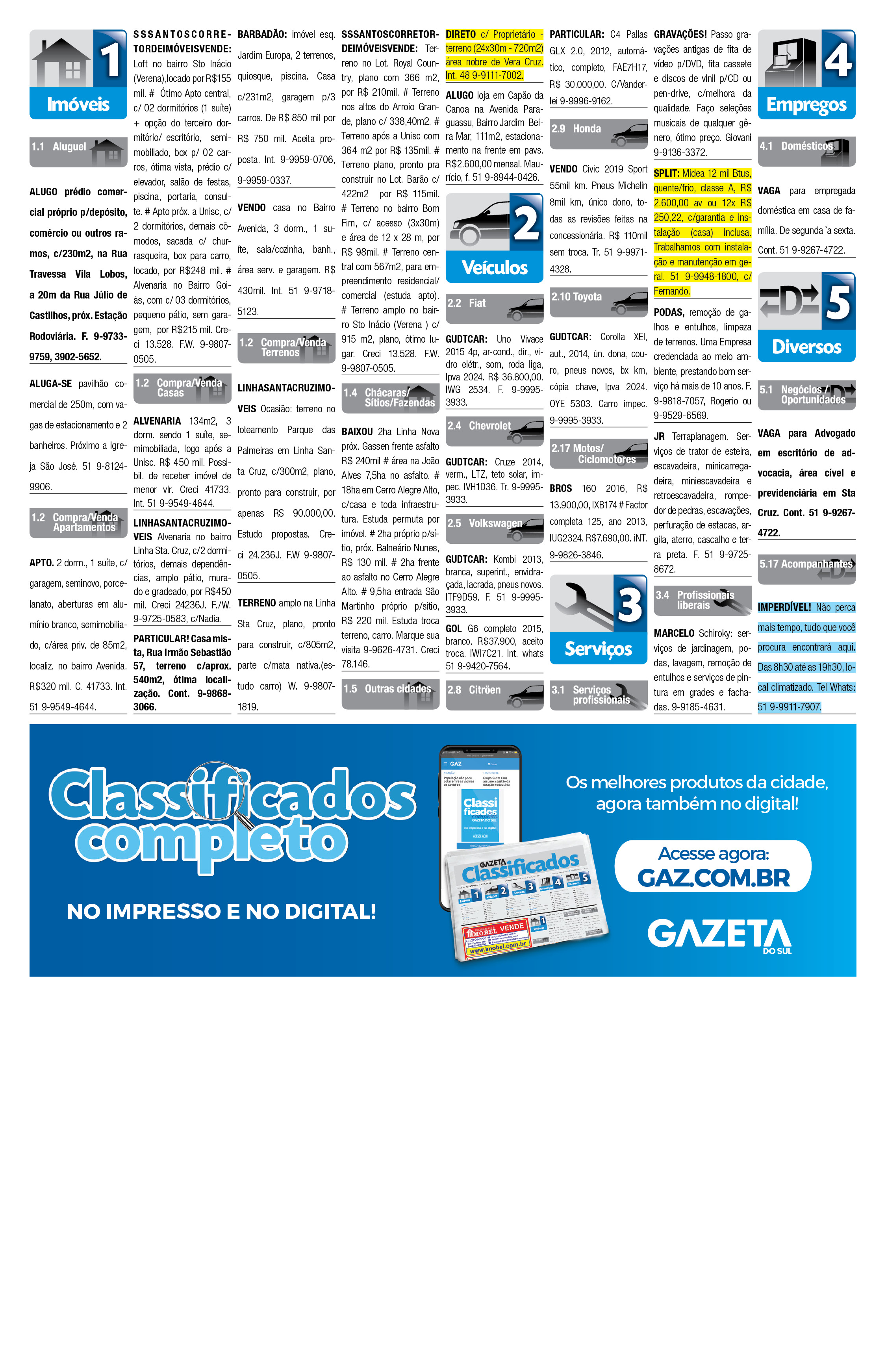 O suplemento de Classificados, que circula nas edições de terças, quintas e sábados, é um dos mais tradicionais da Gazeta do Sul, como vitrine e canal de negócios, de oferta, compra e venda em toda a região central do Rio Grande do Sul. E, para enriquecer pesquisas de produtos e serviços e possibilitar resultado ainda melhor a usuários e parceiros, nos anúncios de clientes cadastrados, o leitor tem acesso direto com link ao site do anunciante, onde poderá verificar mais detalhes sobre os itens. Confira as ofertas:
