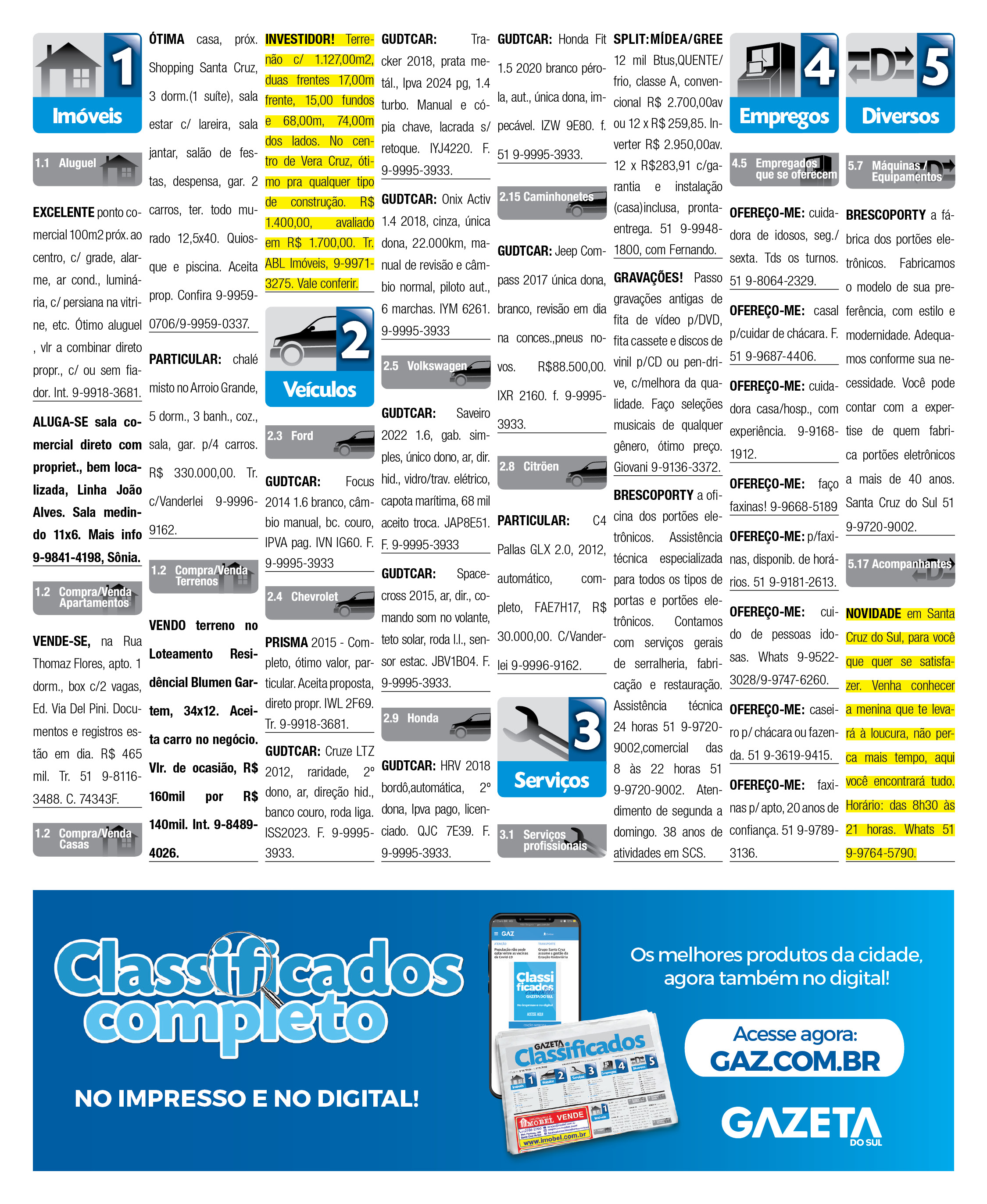 O suplemento de Classificados, que circula nas edições de terças, quintas e sábados, é um dos mais tradicionais da Gazeta do Sul, como vitrine e canal de negócios, de oferta, compra e venda em toda a região central do Rio Grande do Sul. E, para enriquecer pesquisas de produtos e serviços e possibilitar resultado ainda melhor a usuários e parceiros, nos anúncios de clientes cadastrados, o leitor tem acesso direto com link ao site do anunciante, onde poderá verificar mais detalhes sobre os itens. Confira as ofertas:
