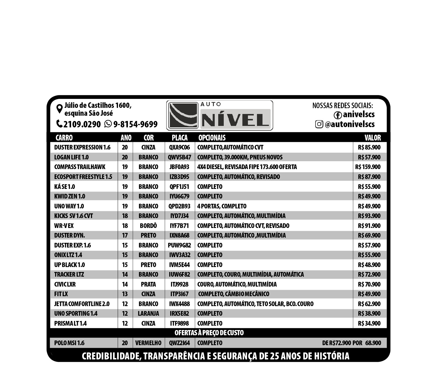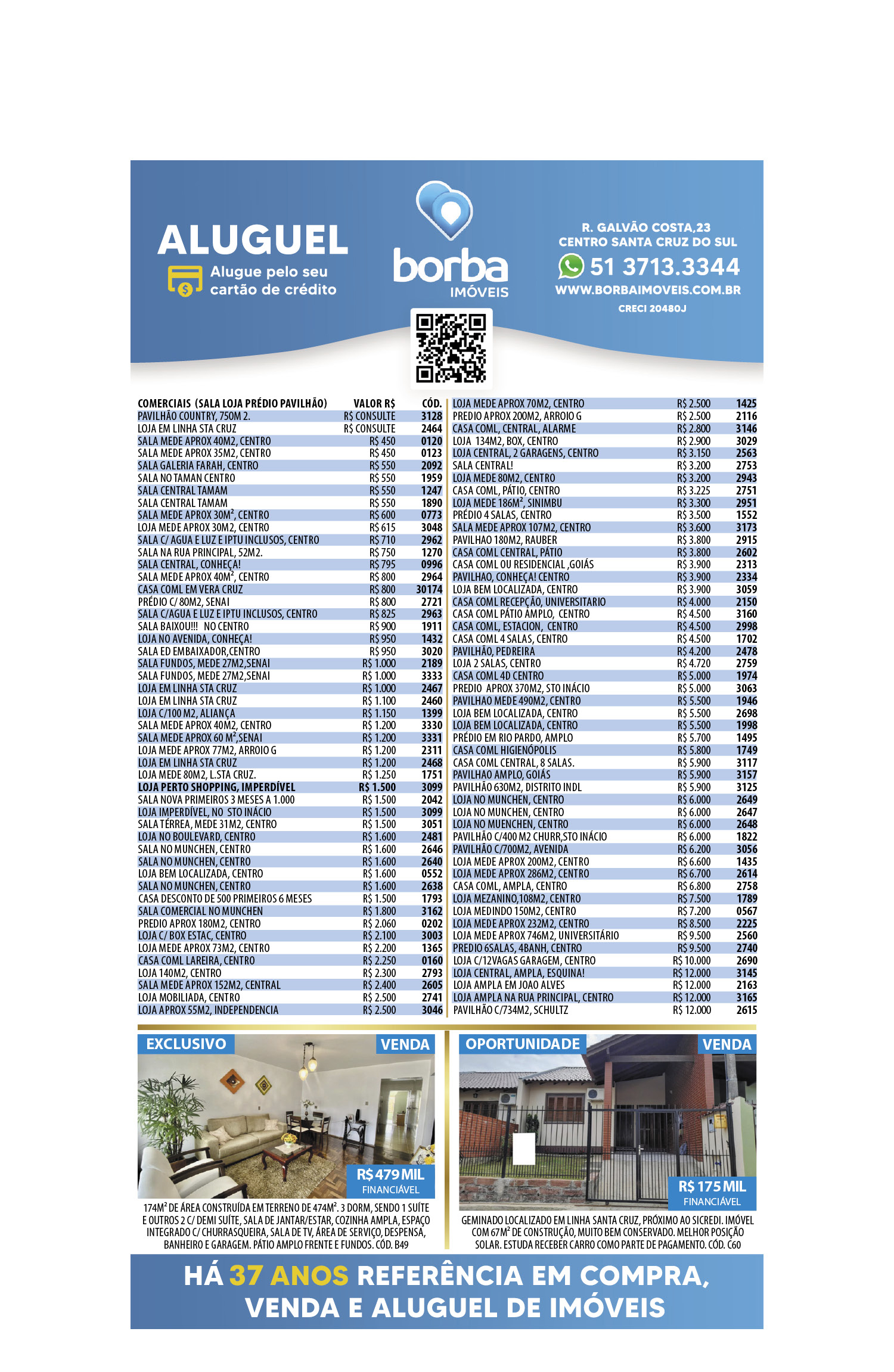 O suplemento de Classificados, que circula nas edições de terças, quintas e sábados, é um dos mais tradicionais da Gazeta do Sul, como vitrine e canal de negócios, de oferta, compra e venda em toda a região central do Rio Grande do Sul. E, para enriquecer pesquisas de produtos e serviços e possibilitar resultado ainda melhor a usuários e parceiros, nos anúncios de clientes cadastrados, o leitor tem acesso direto com link ao site do anunciante, onde poderá verificar mais detalhes sobre os itens. Confira as ofertas: