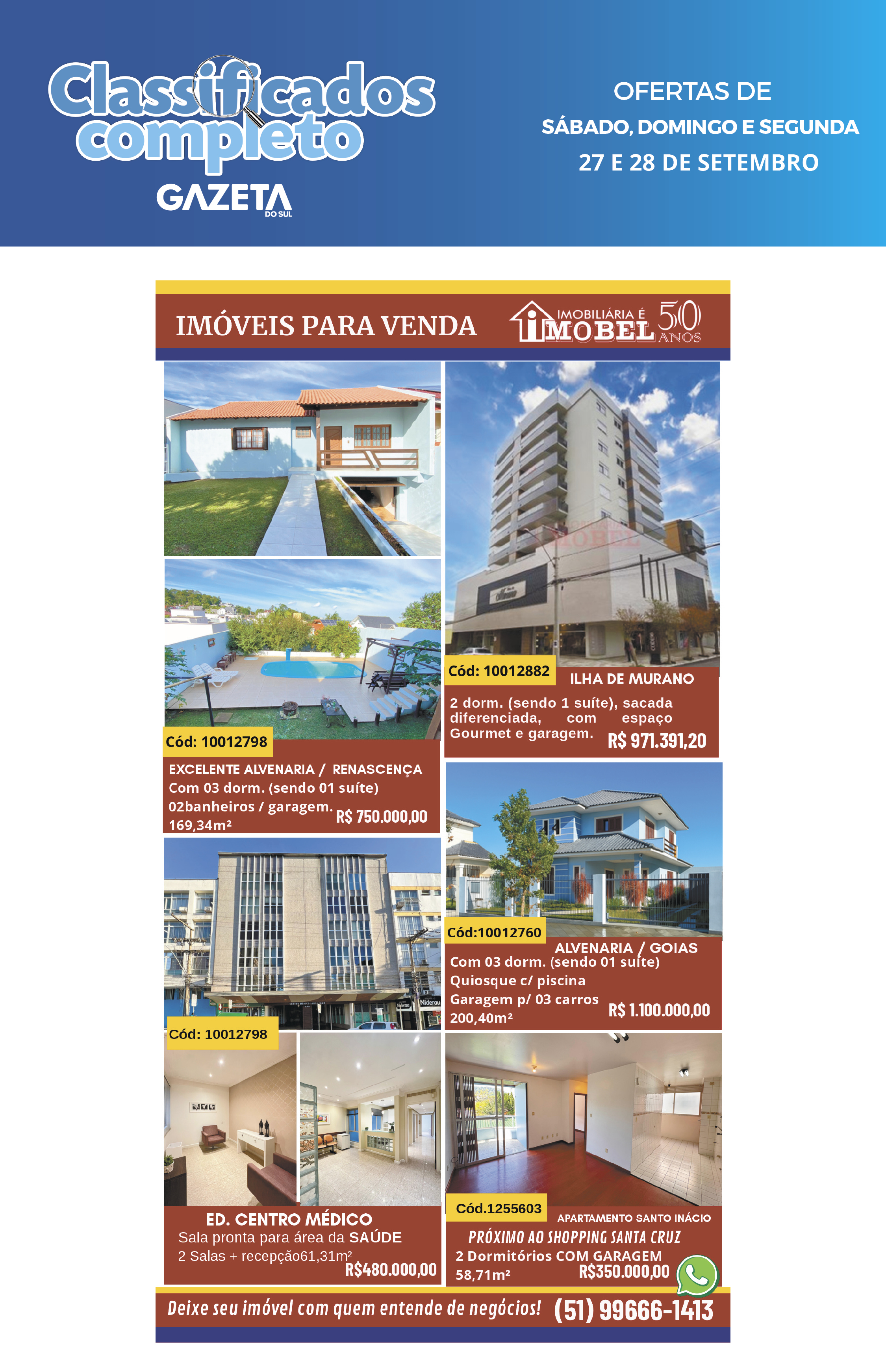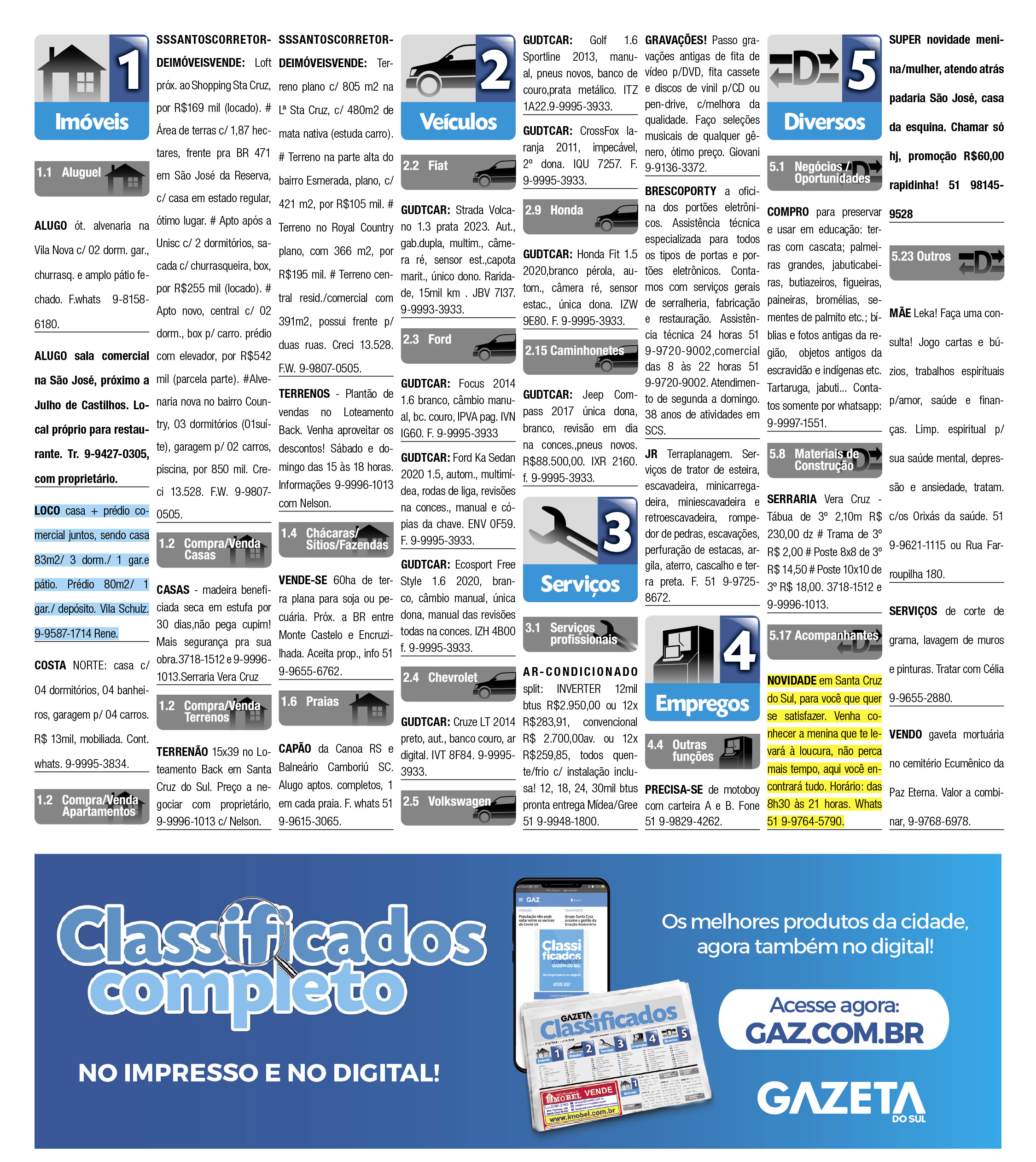 O suplemento de Classificados, que circula nas edições de terças, quintas e sábados, é um dos mais tradicionais da Gazeta do Sul, como vitrine e canal de negócios, de oferta, compra e venda em toda a região central do Rio Grande do Sul. E, para enriquecer pesquisas de produtos e serviços e possibilitar resultado ainda melhor a usuários e parceiros, nos anúncios de clientes cadastrados, o leitor tem acesso direto com link ao site do anunciante, onde poderá verificar mais detalhes sobre os itens. Confira as ofertas: