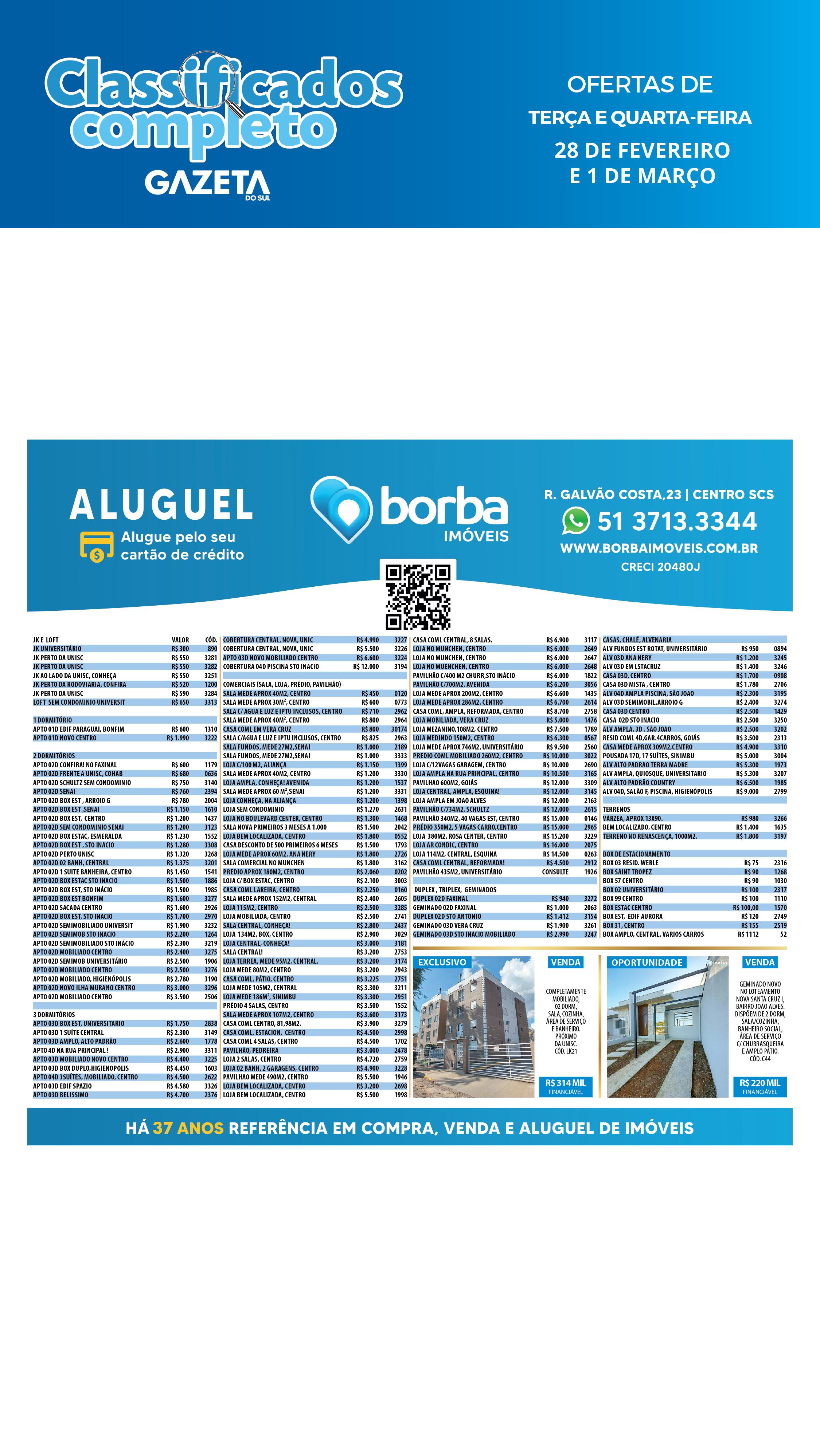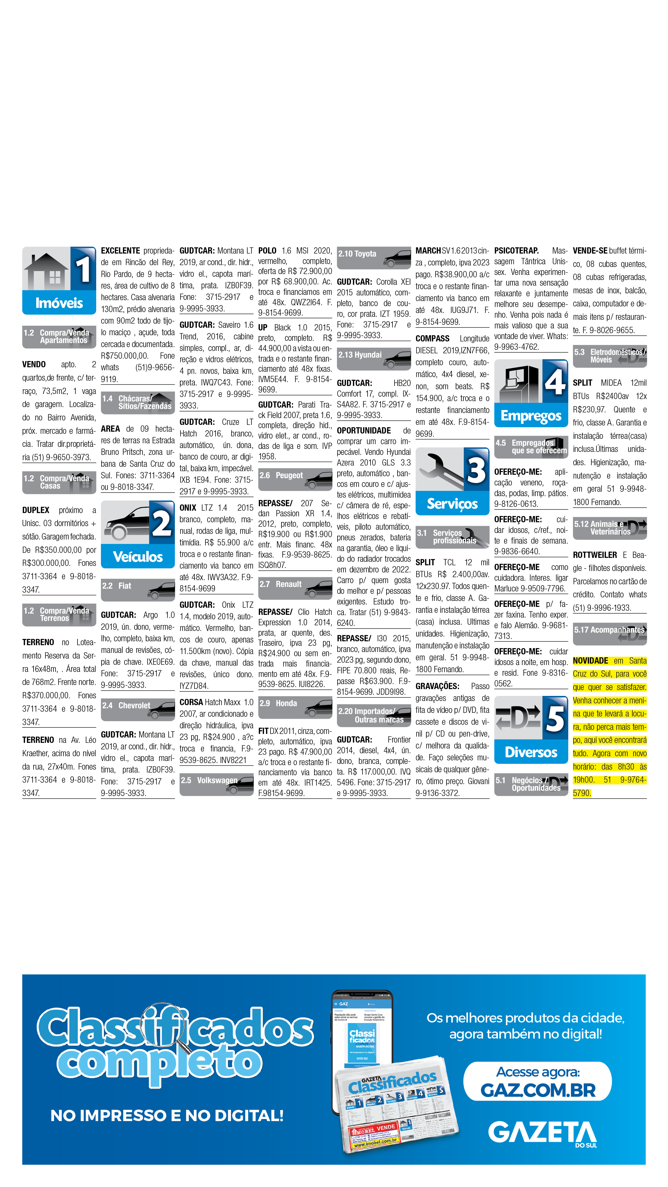O suplemento de Classificados, que circula nas edições de terças, quintas e sábados, é um dos mais tradicionais da Gazeta do Sul, como vitrine e canal de negócios, de oferta, compra e venda em toda a região central do Rio Grande do Sul. E, para enriquecer pesquisas de produtos e serviços e possibilitar resultado ainda melhor a usuários e parceiros, nos anúncios de clientes cadastrados, o leitor tem acesso direto com link ao site do anunciante, onde poderá verificar mais detalhes sobre os itens. Confira as ofertas: