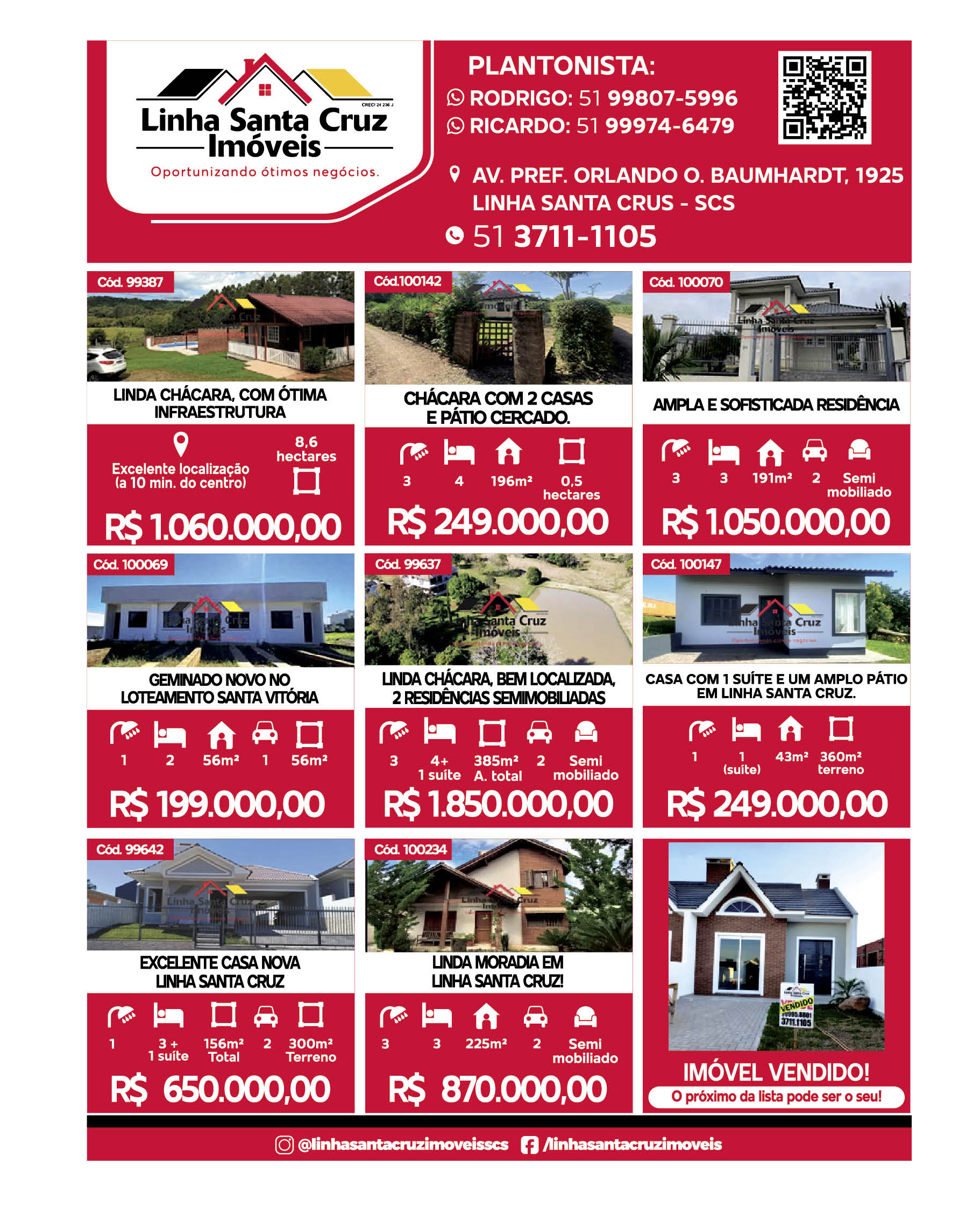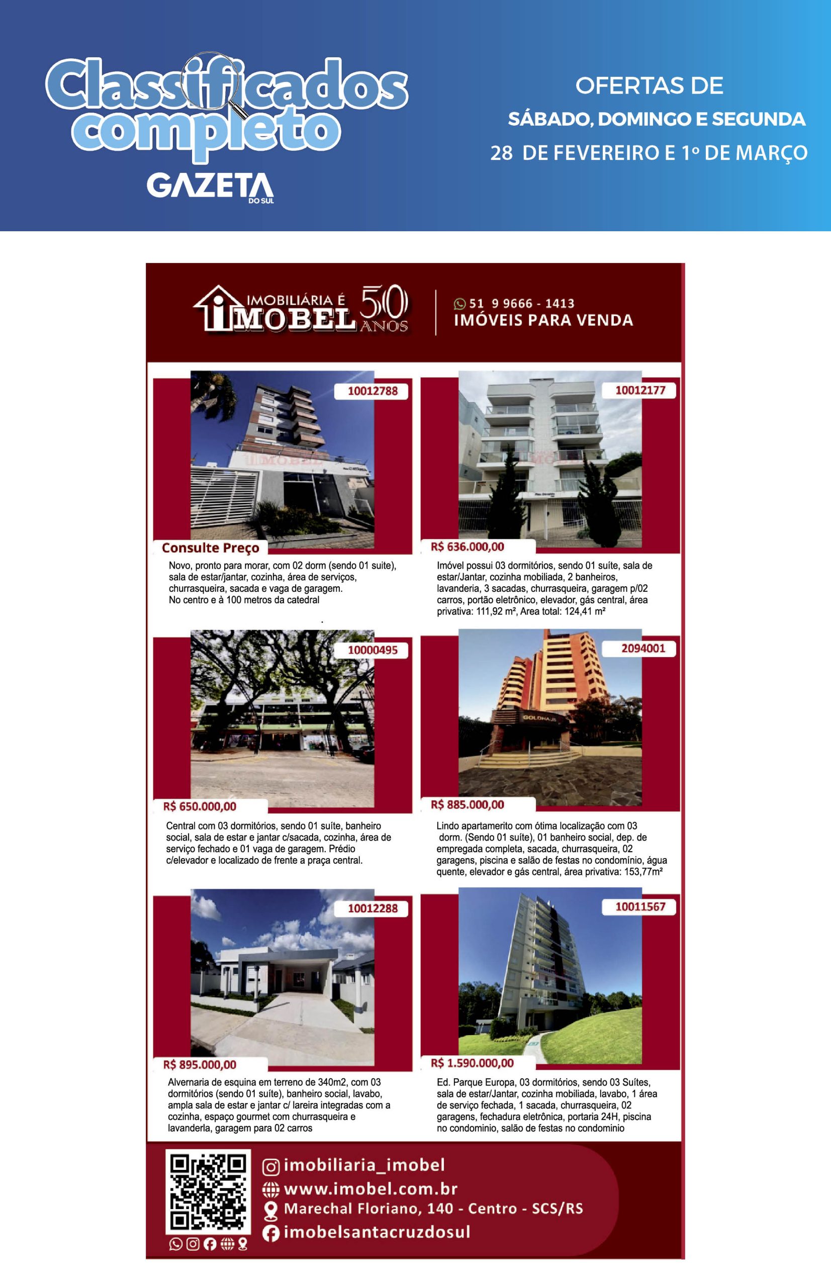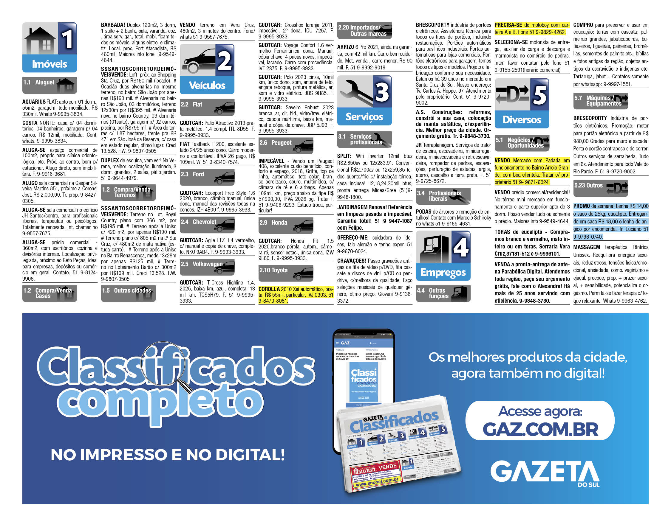 O suplemento de Classificados, que circula nas edições de terças, quintas e sábados, é um dos mais tradicionais da Gazeta do Sul, como vitrine e canal de negócios, de oferta, compra e venda em toda a região central do Rio Grande do Sul. E, para enriquecer pesquisas de produtos e serviços e possibilitar resultado ainda melhor a usuários e parceiros, nos anúncios de clientes cadastrados, o leitor tem acesso direto com link ao site do anunciante, onde poderá verificar mais detalhes sobre os itens. Confira as ofertas: