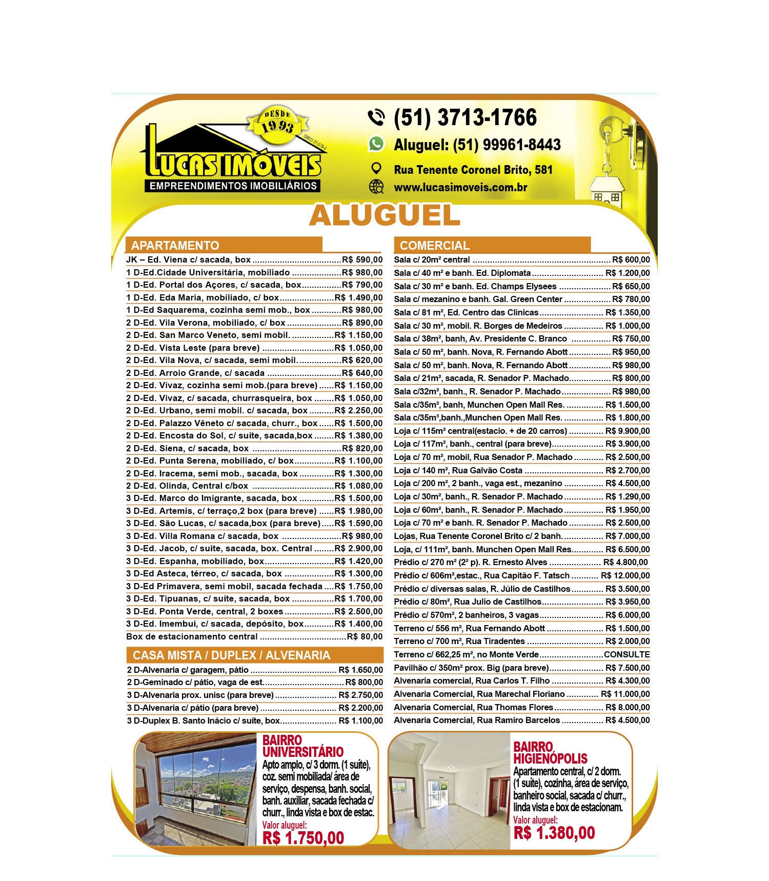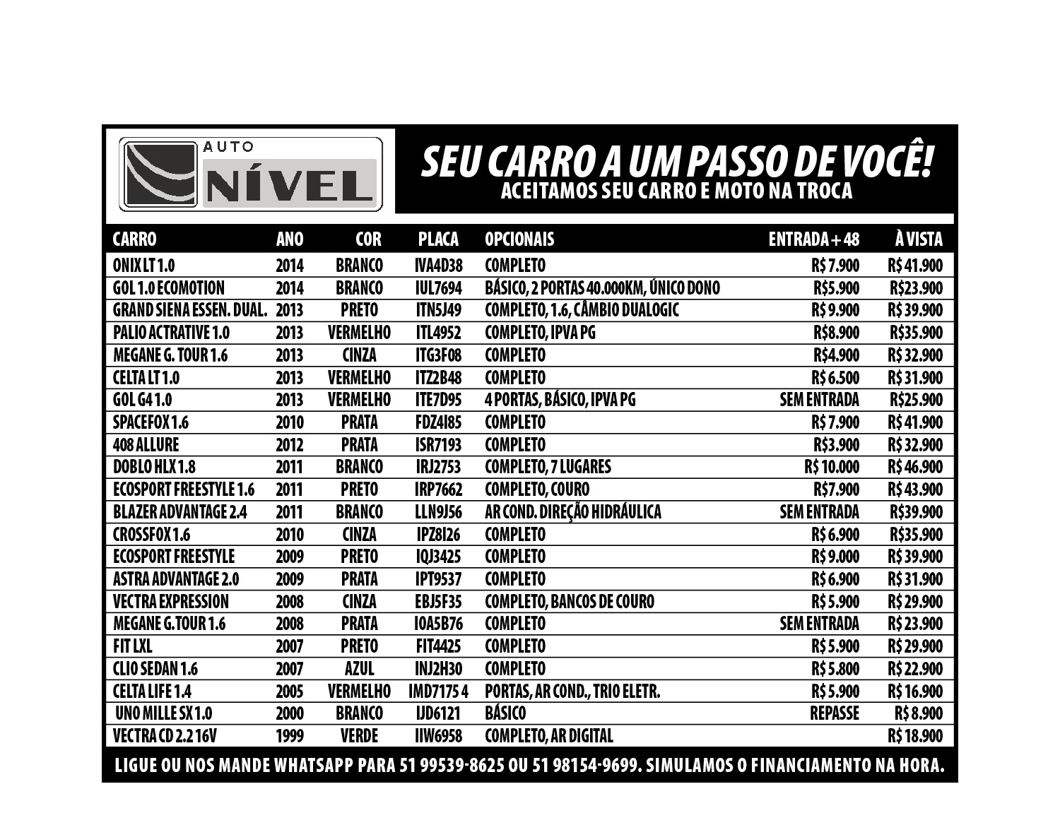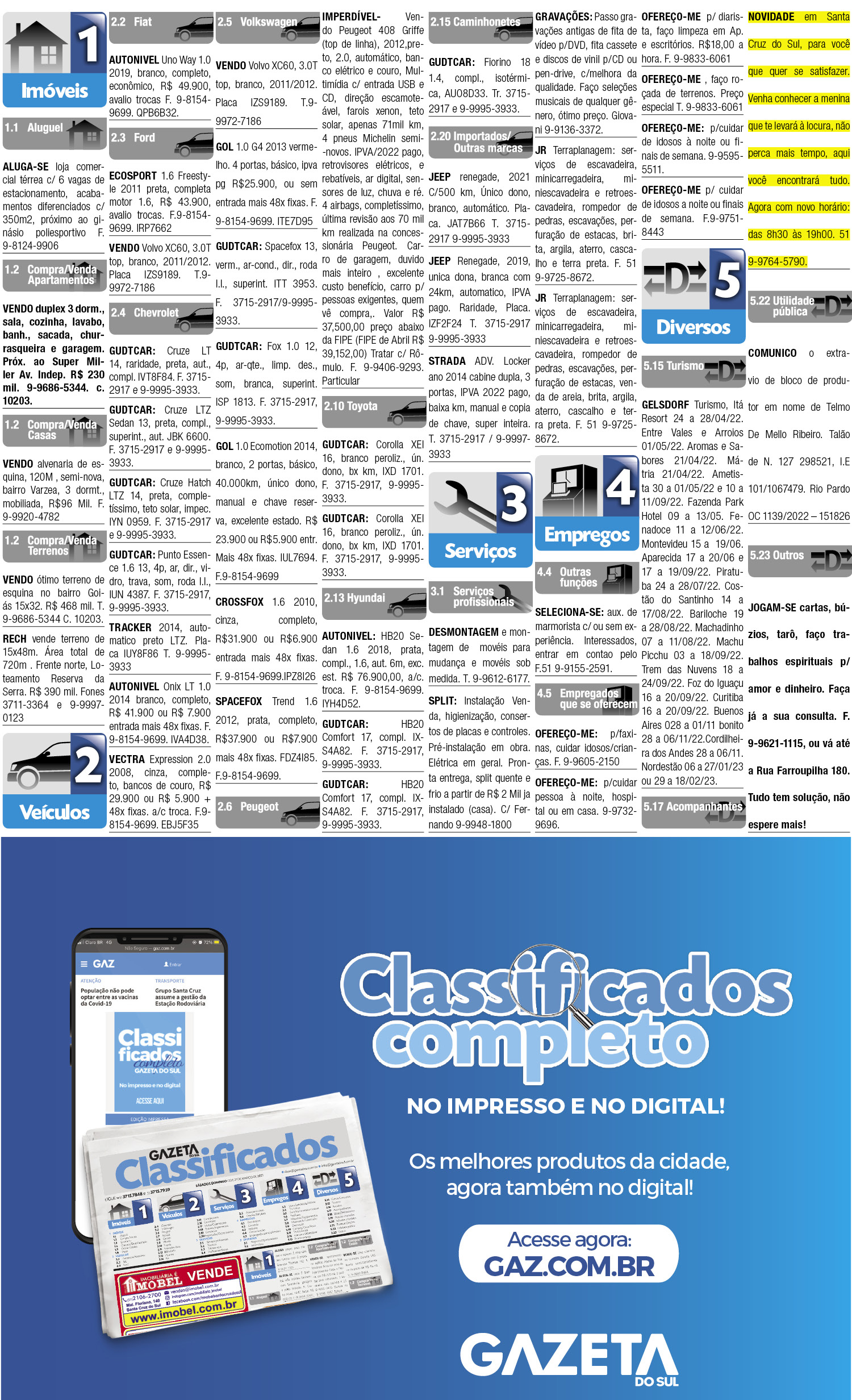 O suplemento de Classificados, que circula nas edições de terças, quintas e sábados, é um dos mais tradicionais da Gazeta do Sul, como vitrine e canal de negócios, de oferta, compra e venda em toda a região central do Rio Grande do Sul. E, para enriquecer pesquisas de produtos e serviços e possibilitar resultado ainda melhor a usuários e parceiros, nos anúncios de clientes cadastrados, o leitor tem acesso direto com link ao site do anunciante, onde poderá verificar mais detalhes sobre os itens. Confira as ofertas: