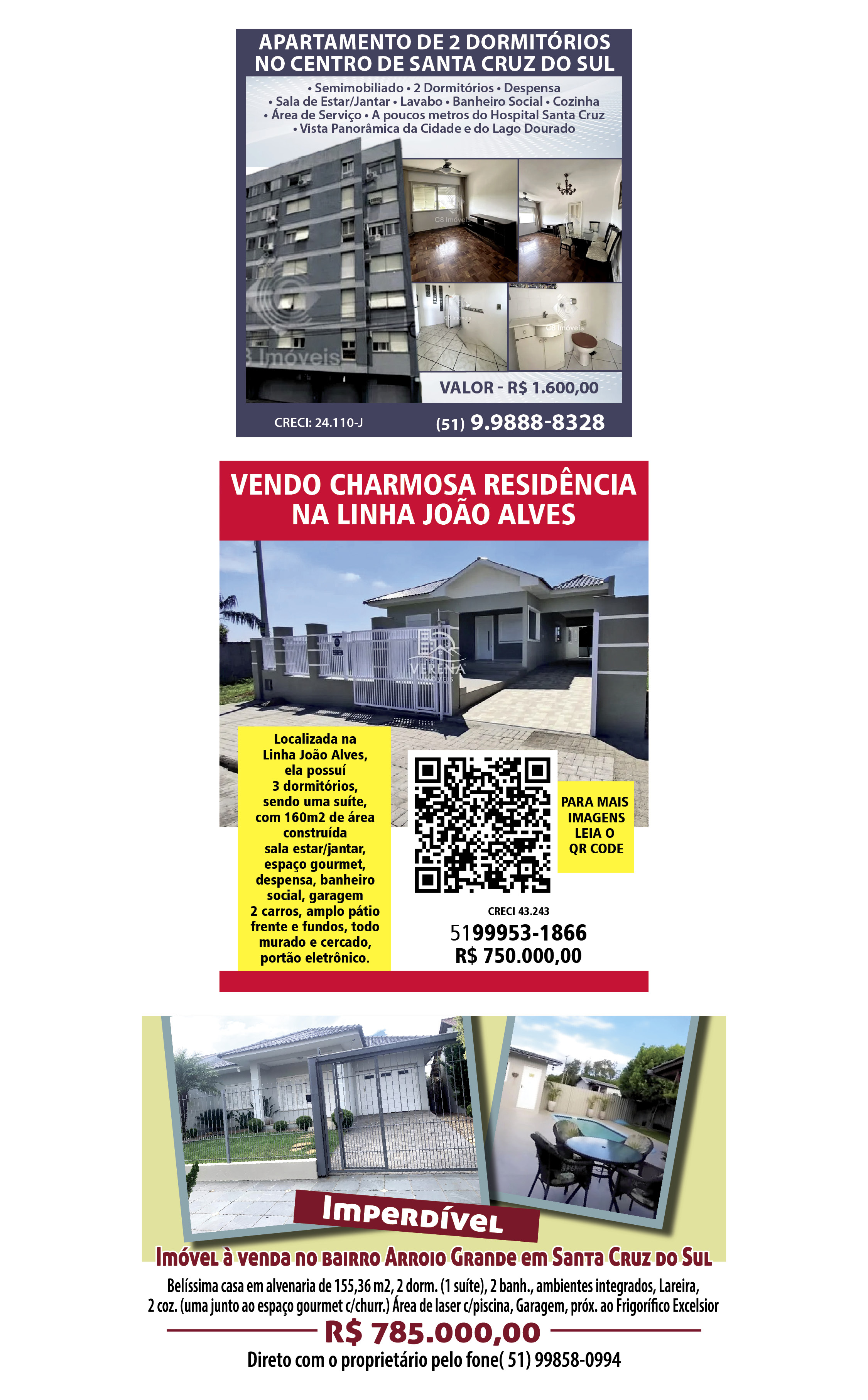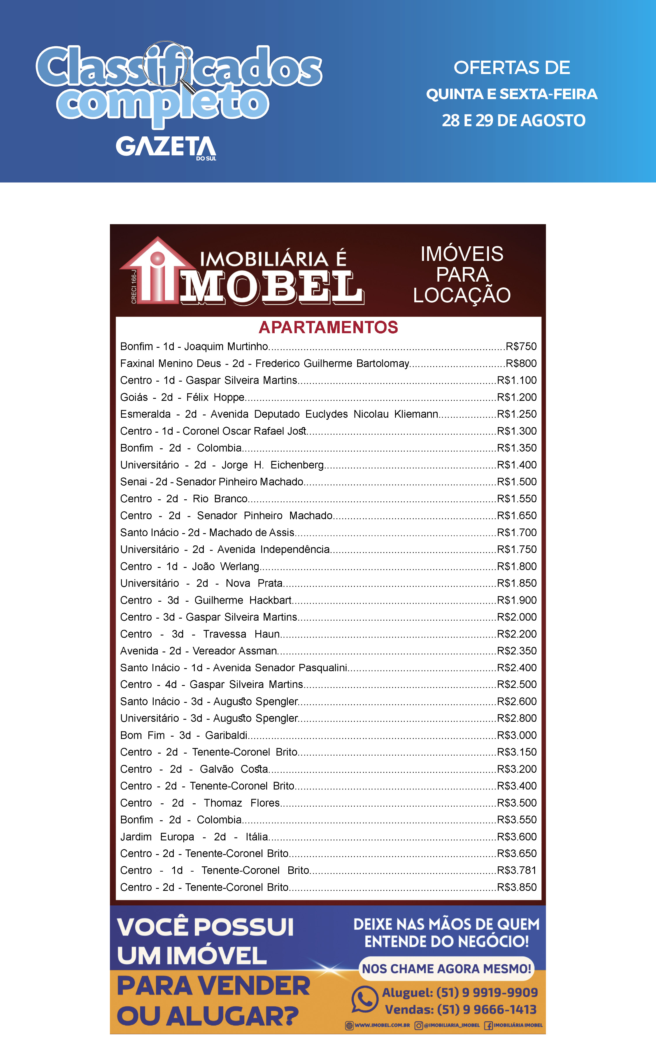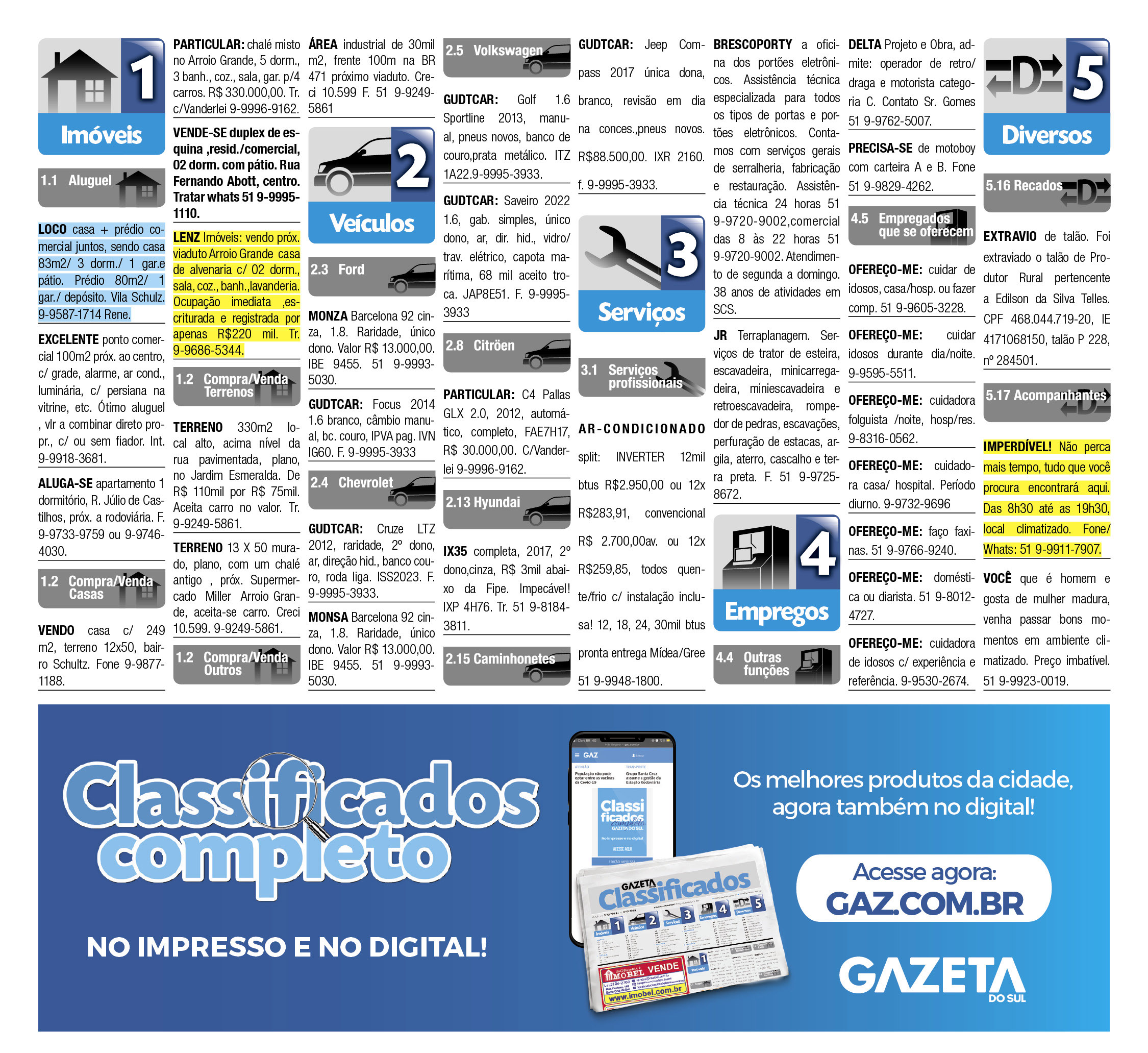 O suplemento de Classificados, que circula nas edições de terças, quintas e sábados, é um dos mais tradicionais da Gazeta do Sul, como vitrine e canal de negócios, de oferta, compra e venda em toda a região central do Rio Grande do Sul. E, para enriquecer pesquisas de produtos e serviços e possibilitar resultado ainda melhor a usuários e parceiros, nos anúncios de clientes cadastrados, o leitor tem acesso direto com link ao site do anunciante, onde poderá verificar mais detalhes sobre os itens. Confira as ofertas:
