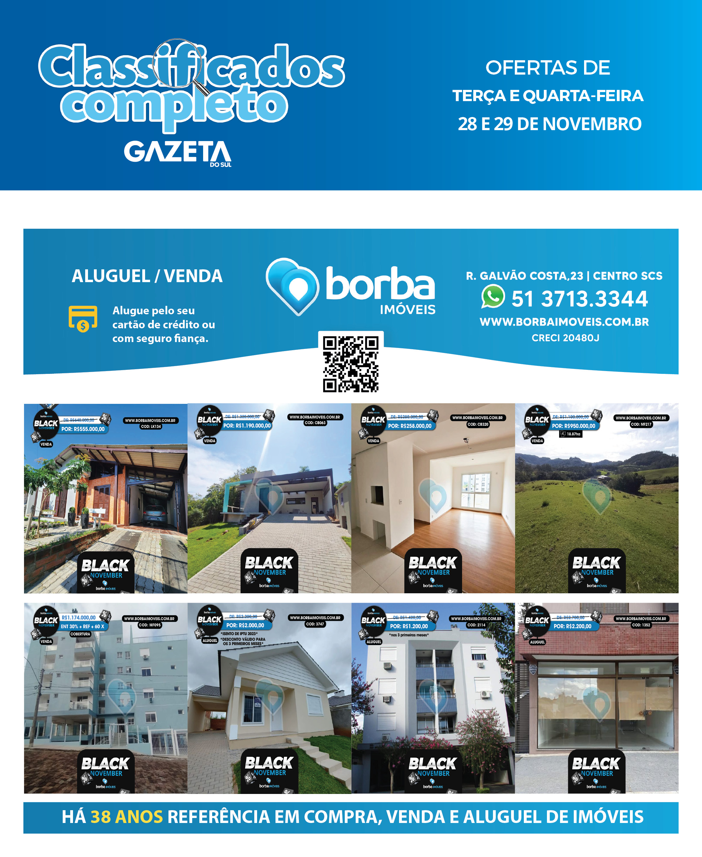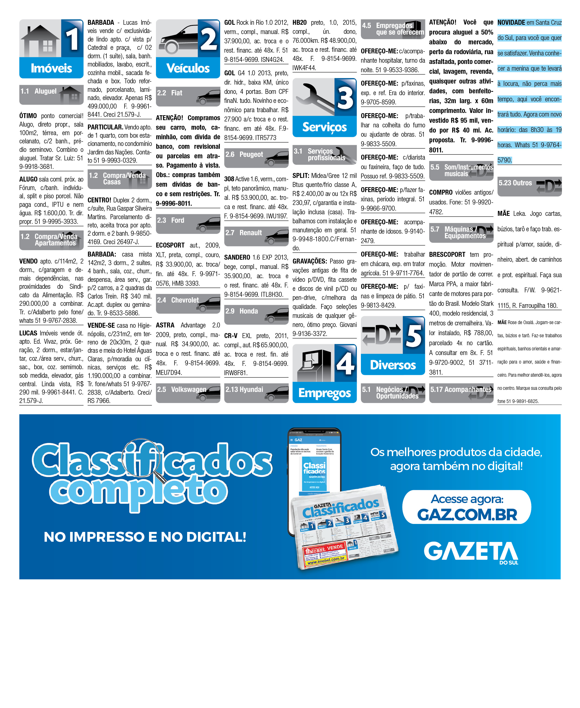 O suplemento de Classificados, que circula nas edições de terças, quintas e sábados, é um dos mais tradicionais da Gazeta do Sul, como vitrine e canal de negócios, de oferta, compra e venda em toda a região central do Rio Grande do Sul. E, para enriquecer pesquisas de produtos e serviços e possibilitar resultado ainda melhor a usuários e parceiros, nos anúncios de clientes cadastrados, o leitor tem acesso direto com link ao site do anunciante, onde poderá verificar mais detalhes sobre os itens. Confira as ofertas: