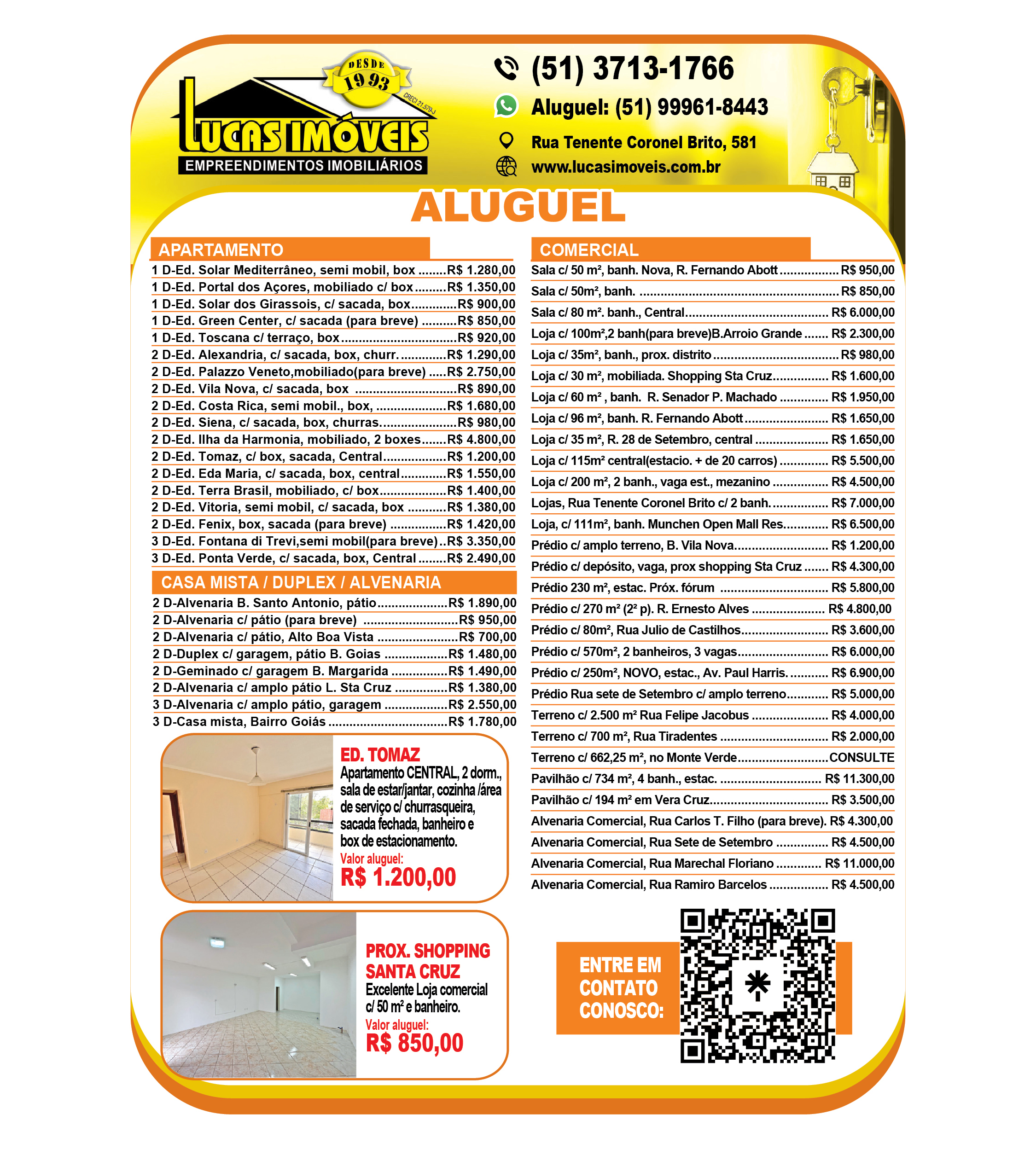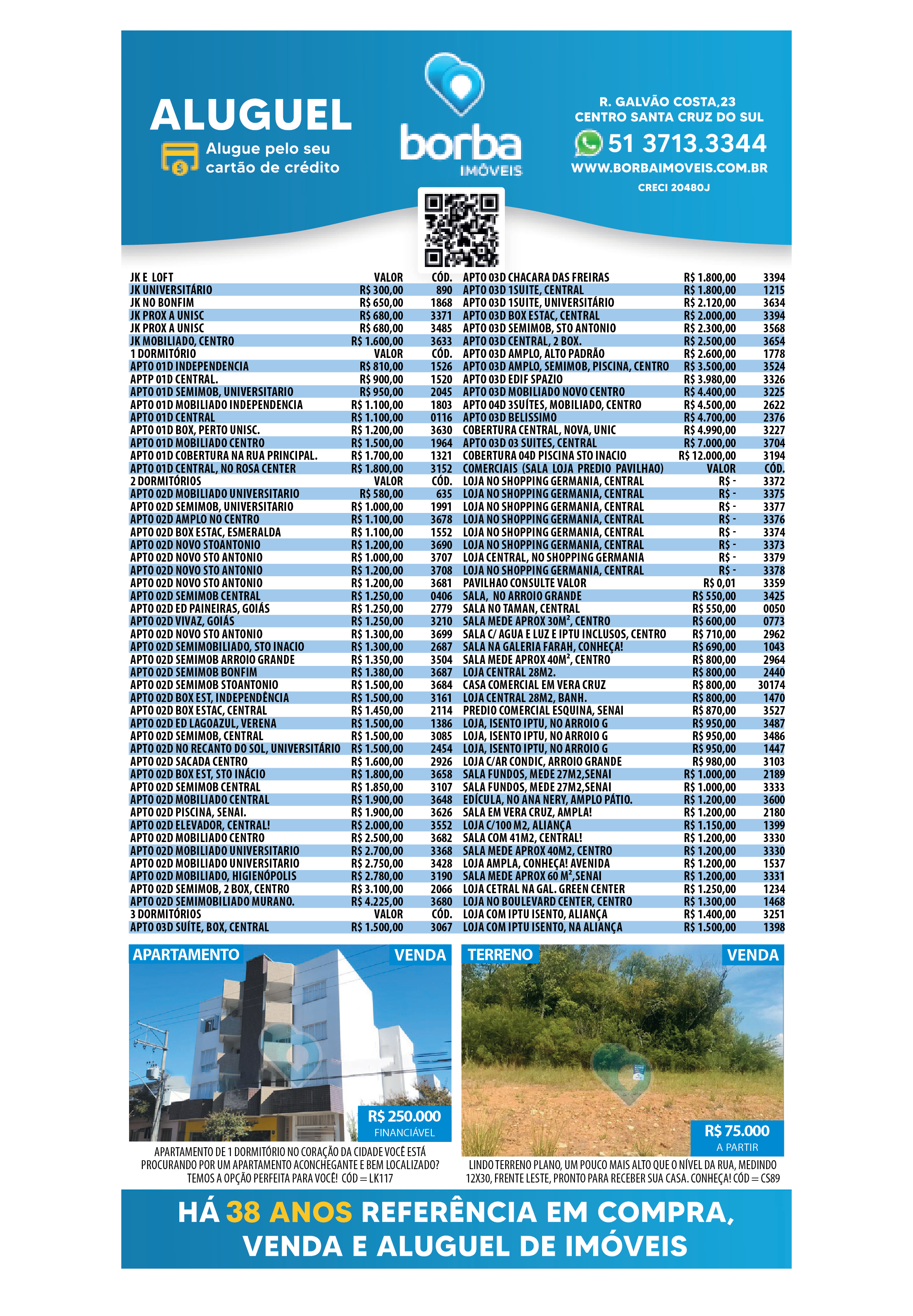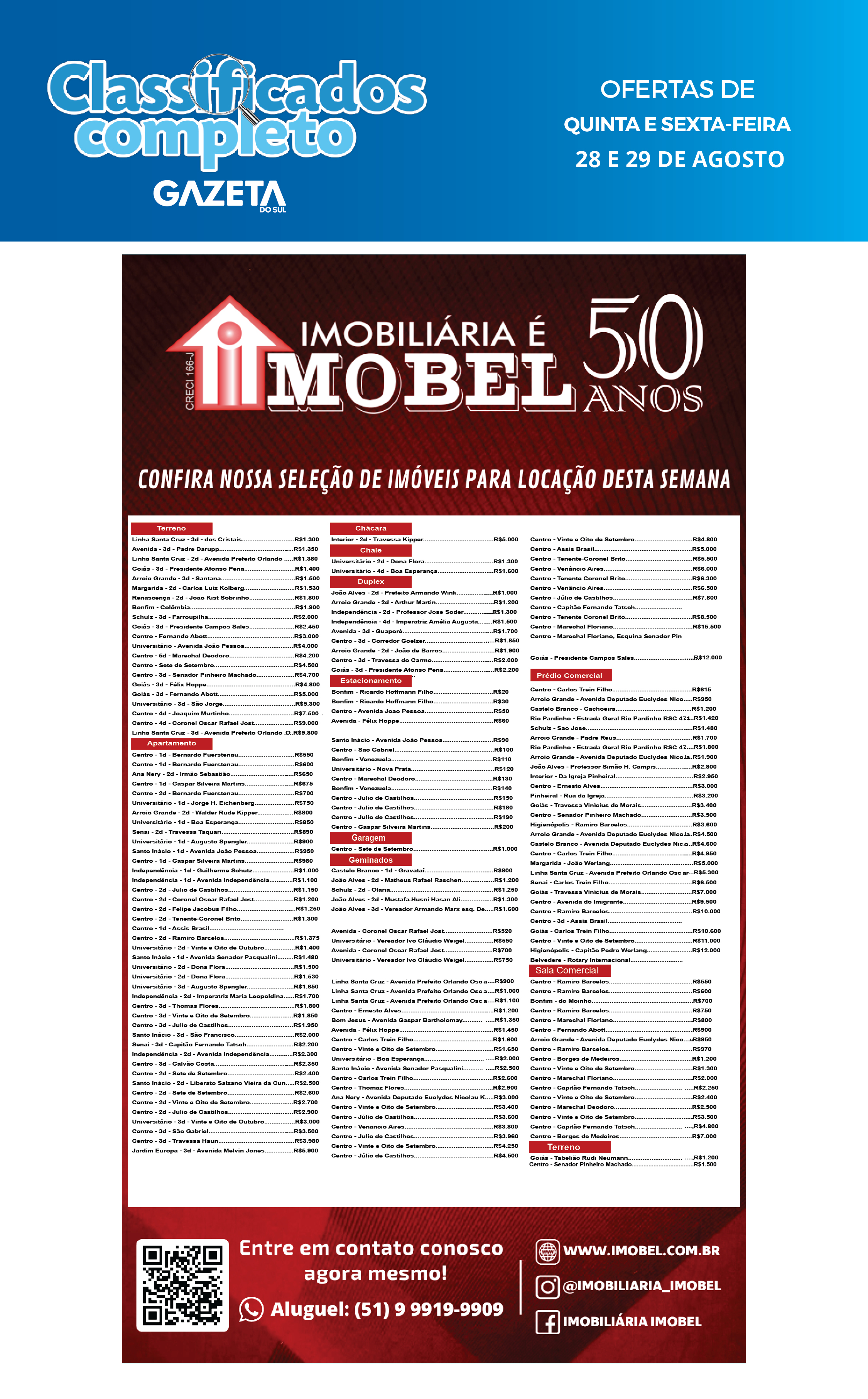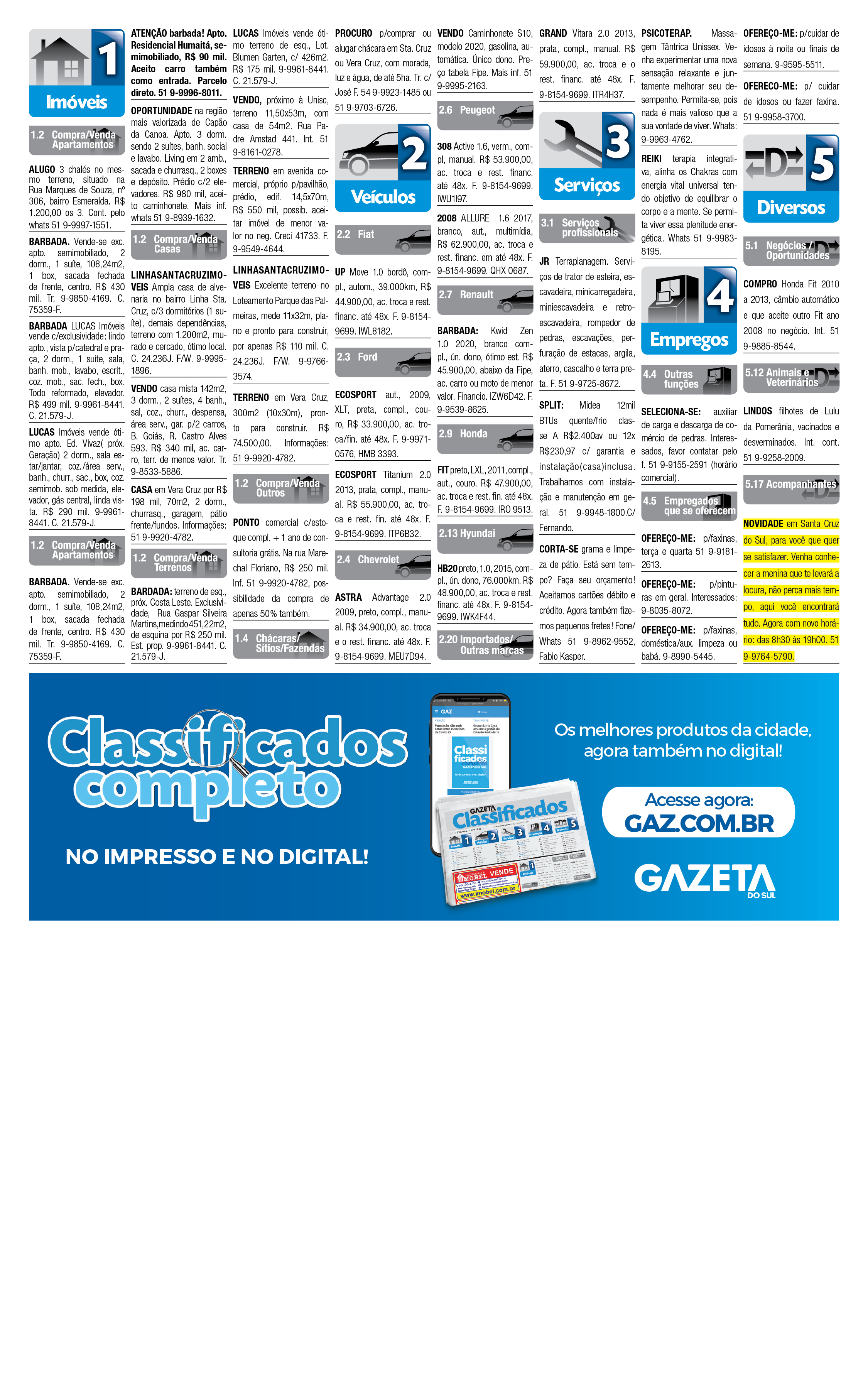 O suplemento de Classificados, que circula nas edições de terças, quintas e sábados, é um dos mais tradicionais da Gazeta do Sul, como vitrine e canal de negócios, de oferta, compra e venda em toda a região central do Rio Grande do Sul. E, para enriquecer pesquisas de produtos e serviços e possibilitar resultado ainda melhor a usuários e parceiros, nos anúncios de clientes cadastrados, o leitor tem acesso direto com link ao site do anunciante, onde poderá verificar mais detalhes sobre os itens. Confira as ofertas: