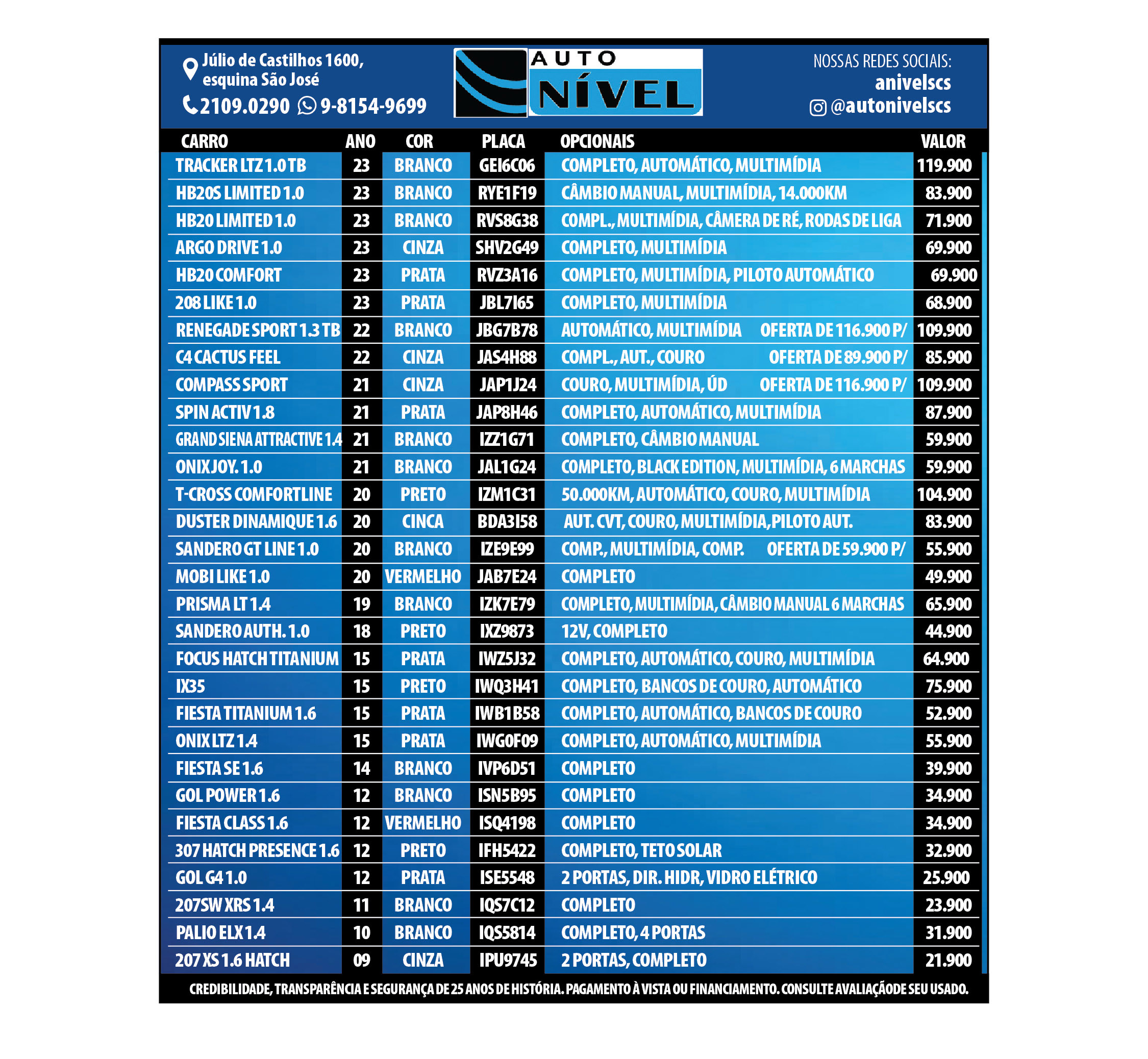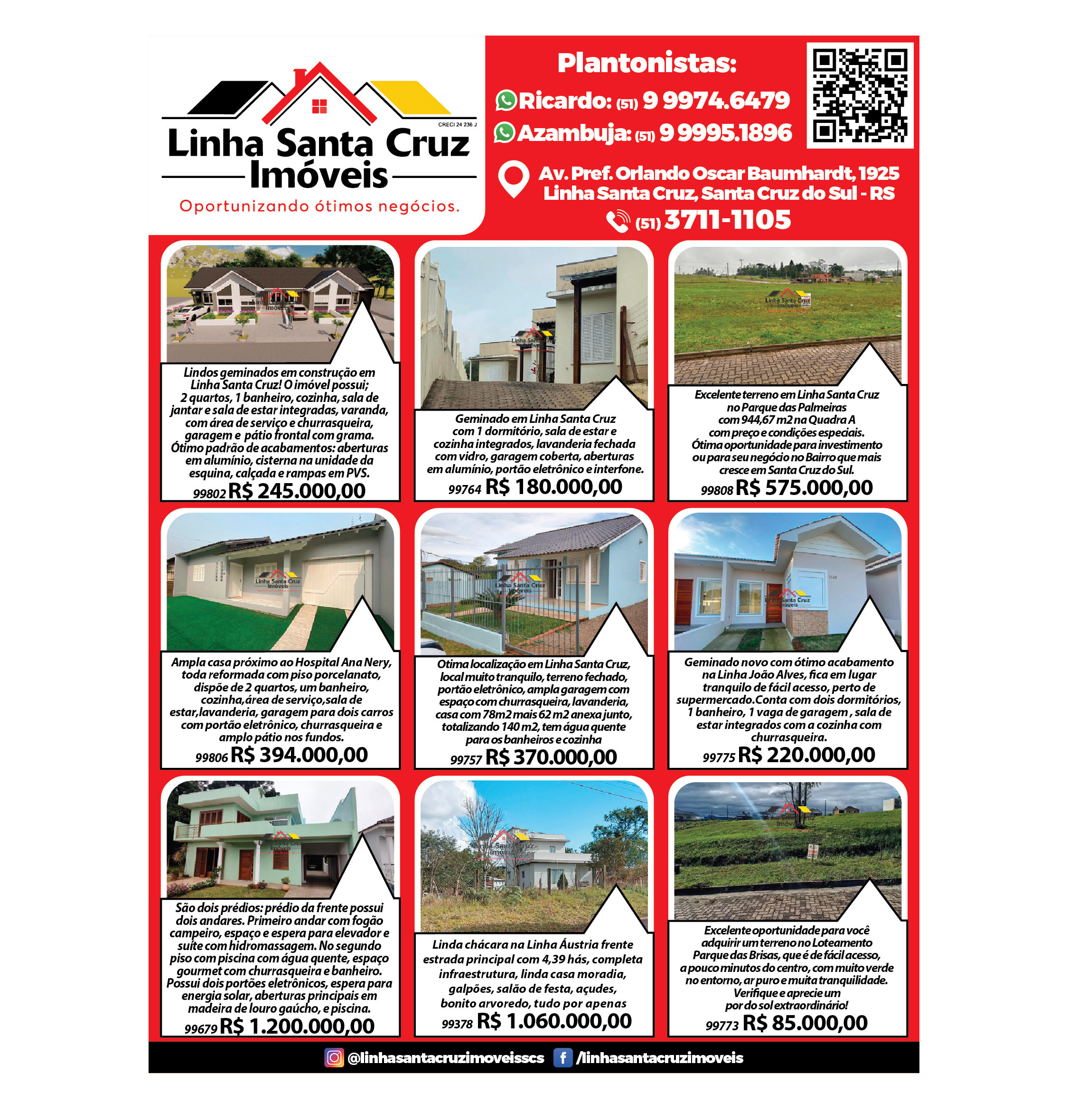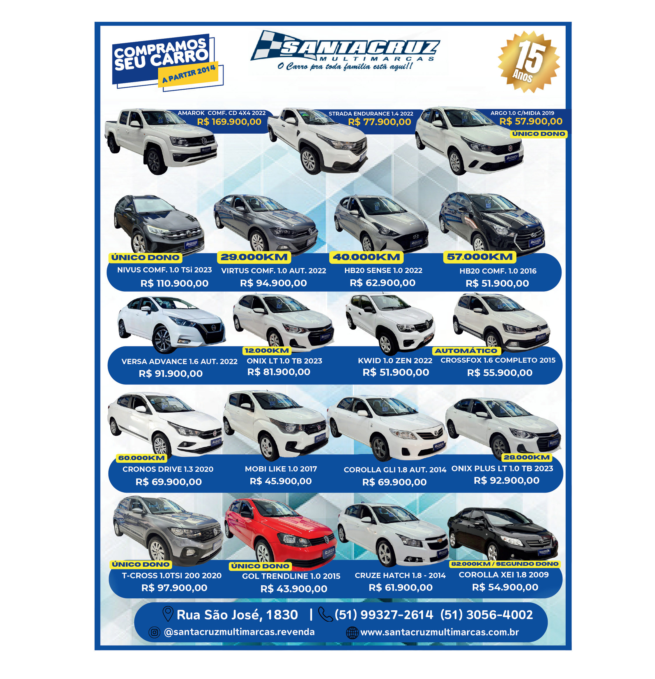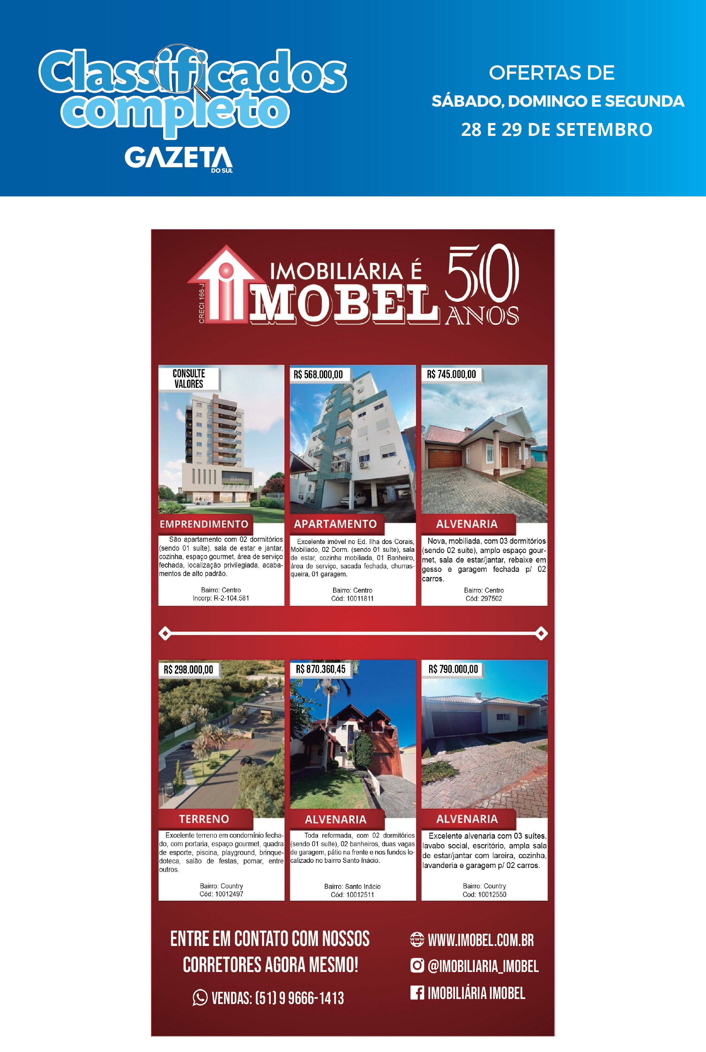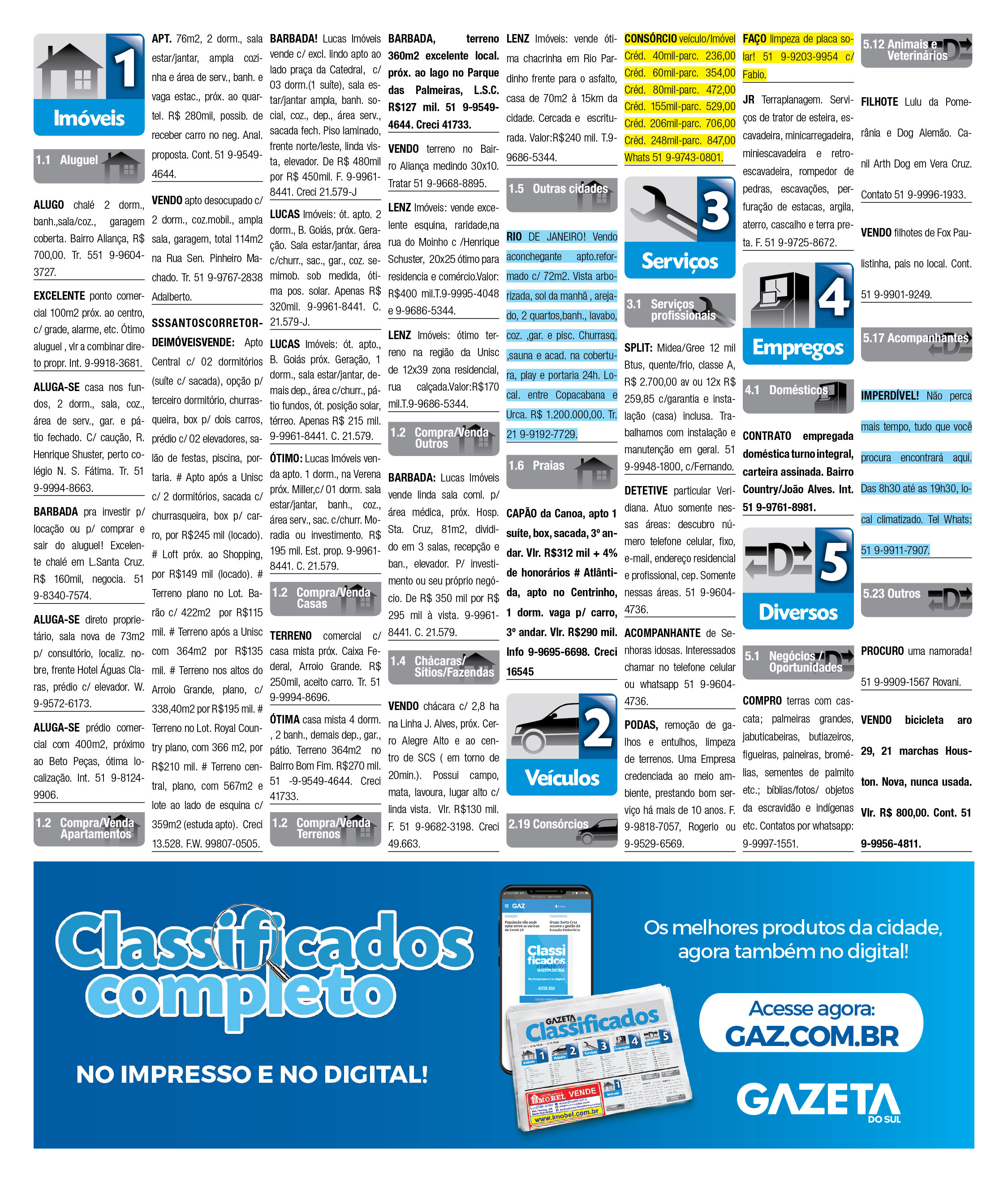 O suplemento de Classificados, que circula nas edições de terças, quintas e sábados, é um dos mais tradicionais da Gazeta do Sul, como vitrine e canal de negócios, de oferta, compra e venda em toda a região central do Rio Grande do Sul. E, para enriquecer pesquisas de produtos e serviços e possibilitar resultado ainda melhor a usuários e parceiros, nos anúncios de clientes cadastrados, o leitor tem acesso direto com link ao site do anunciante, onde poderá verificar mais detalhes sobre os itens. Confira as ofertas: