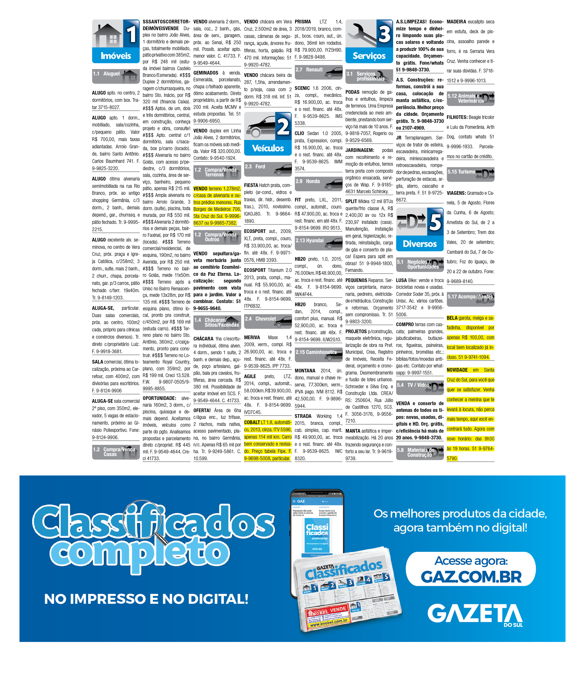 O suplemento de Classificados, que circula nas edições de terças, quintas e sábados, é um dos mais tradicionais da Gazeta do Sul, como vitrine e canal de negócios, de oferta, compra e venda em toda a região central do Rio Grande do Sul. E, para enriquecer pesquisas de produtos e serviços e possibilitar resultado ainda melhor a usuários e parceiros, nos anúncios de clientes cadastrados, o leitor tem acesso direto com link ao site do anunciante, onde poderá verificar mais detalhes sobre os itens. Confira as ofertas: