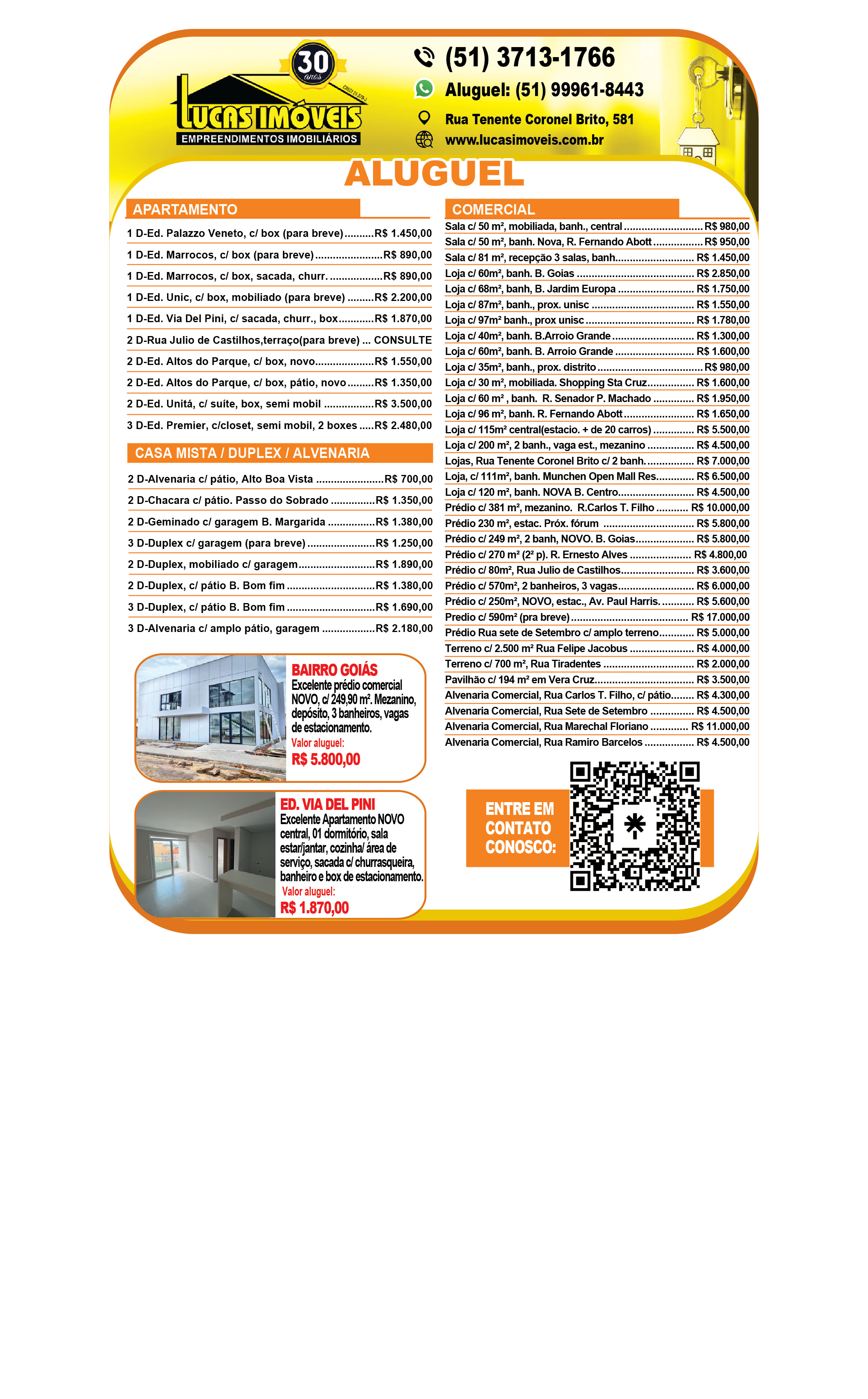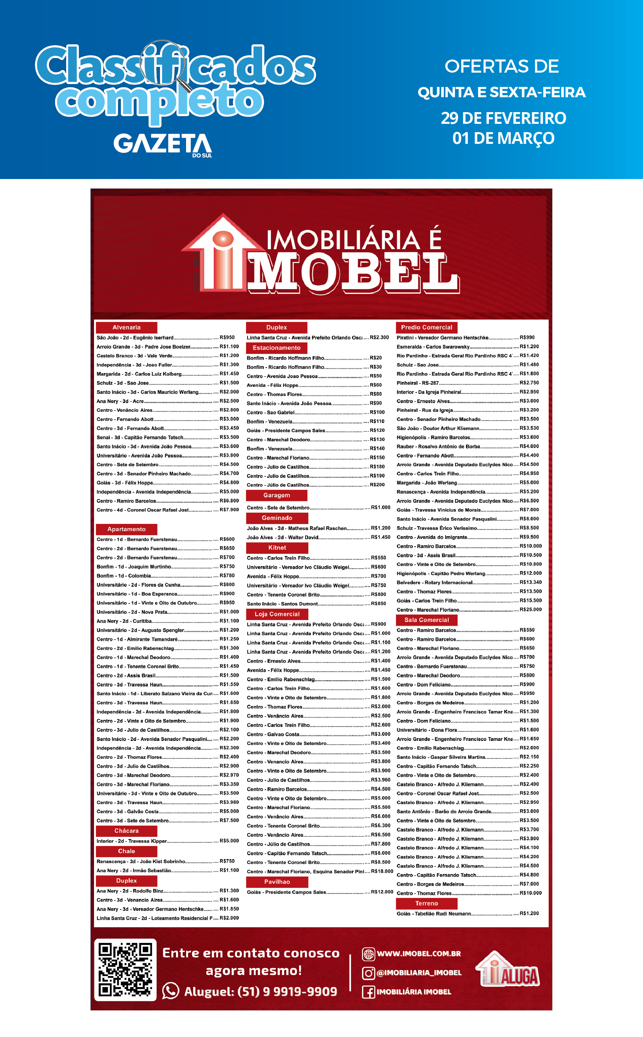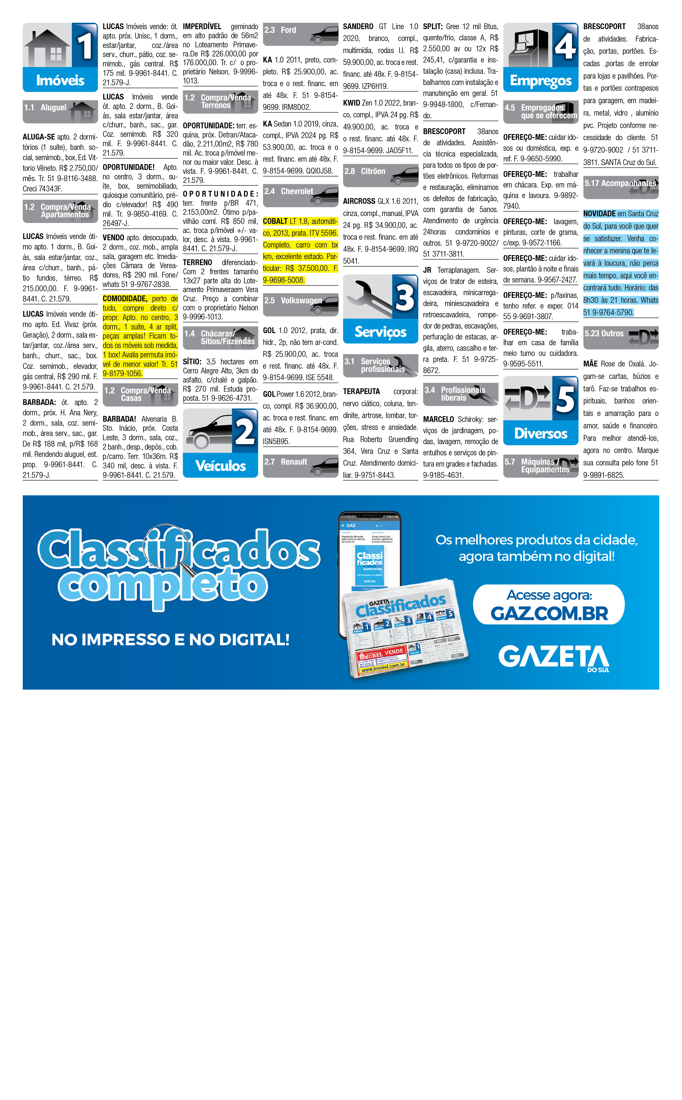 O suplemento de Classificados, que circula nas edições de terças, quintas e sábados, é um dos mais tradicionais da Gazeta do Sul, como vitrine e canal de negócios, de oferta, compra e venda em toda a região central do Rio Grande do Sul. E, para enriquecer pesquisas de produtos e serviços e possibilitar resultado ainda melhor a usuários e parceiros, nos anúncios de clientes cadastrados, o leitor tem acesso direto com link ao site do anunciante, onde poderá verificar mais detalhes sobre os itens. Confira as ofertas: