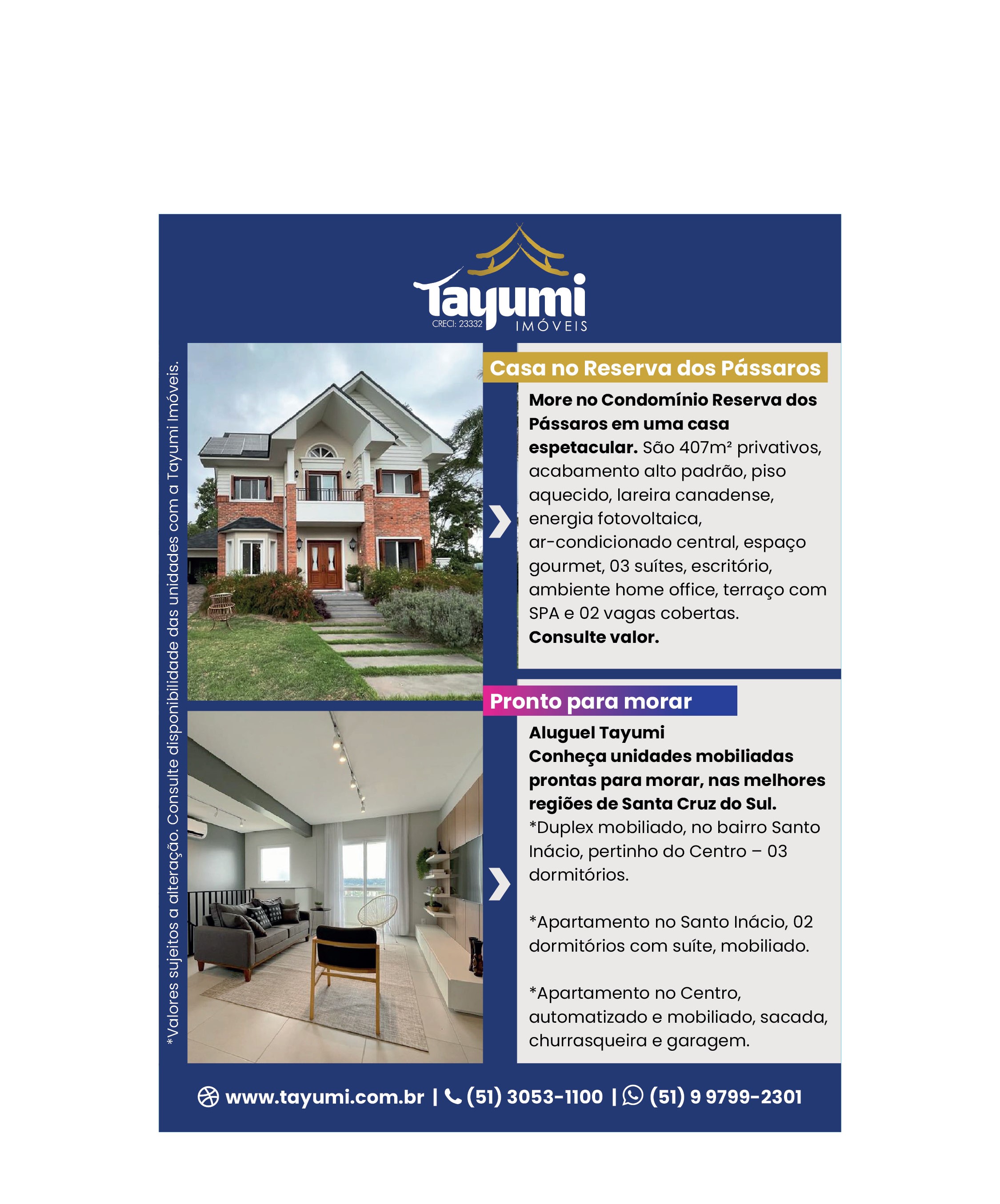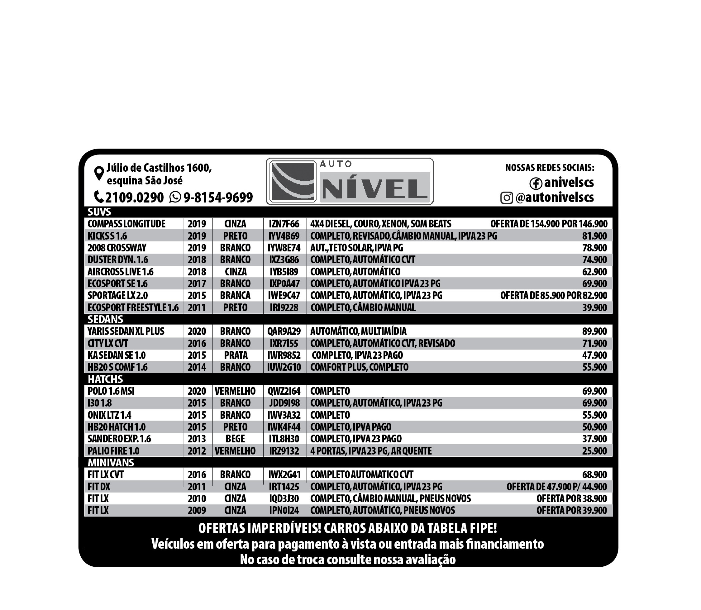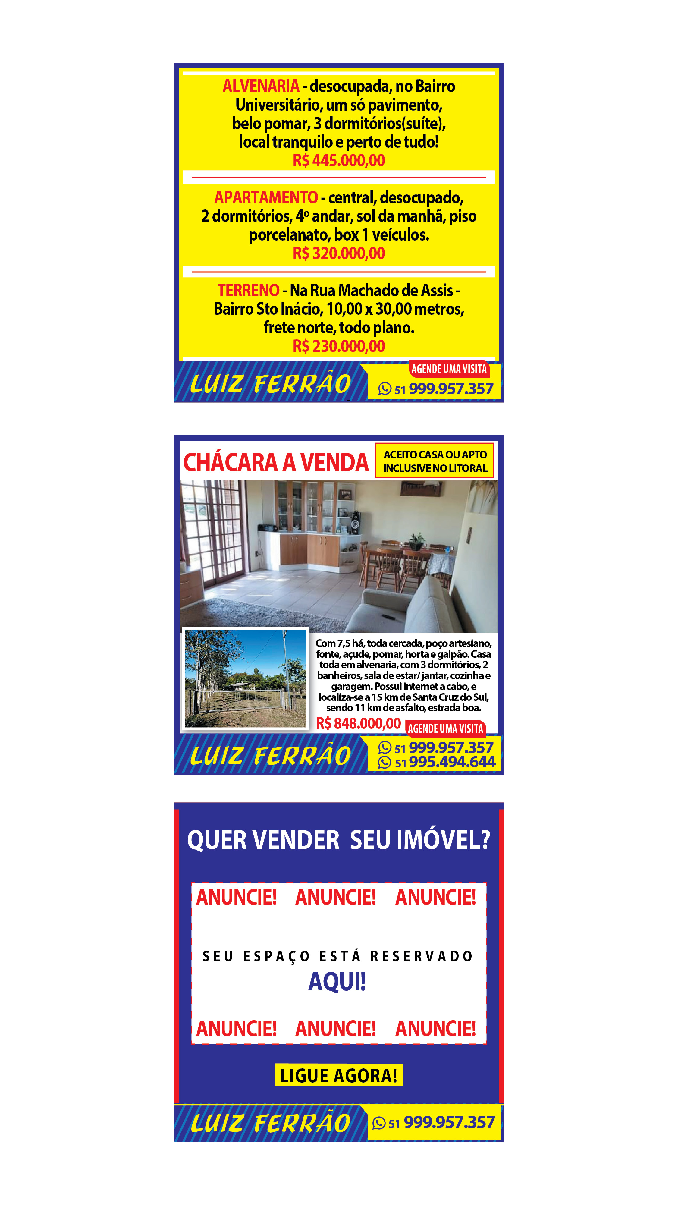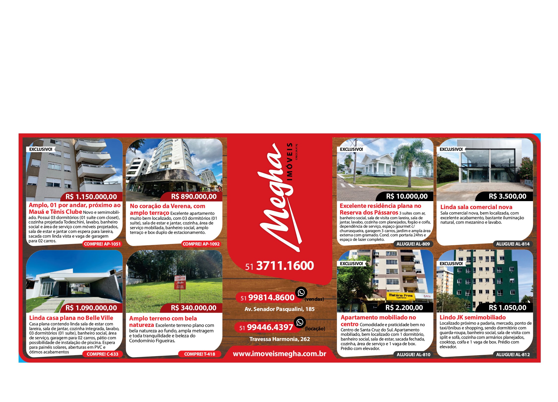 O suplemento de Classificados, que circula nas edições de terças, quintas e sábados, é um dos mais tradicionais da Gazeta do Sul, como vitrine e canal de negócios, de oferta, compra e venda em toda a região central do Rio Grande do Sul. E, para enriquecer pesquisas de produtos e serviços e possibilitar resultado ainda melhor a usuários e parceiros, nos anúncios de clientes cadastrados, o leitor tem acesso direto com link ao site do anunciante, onde poderá verificar mais detalhes sobre os itens. Confira as ofertas: