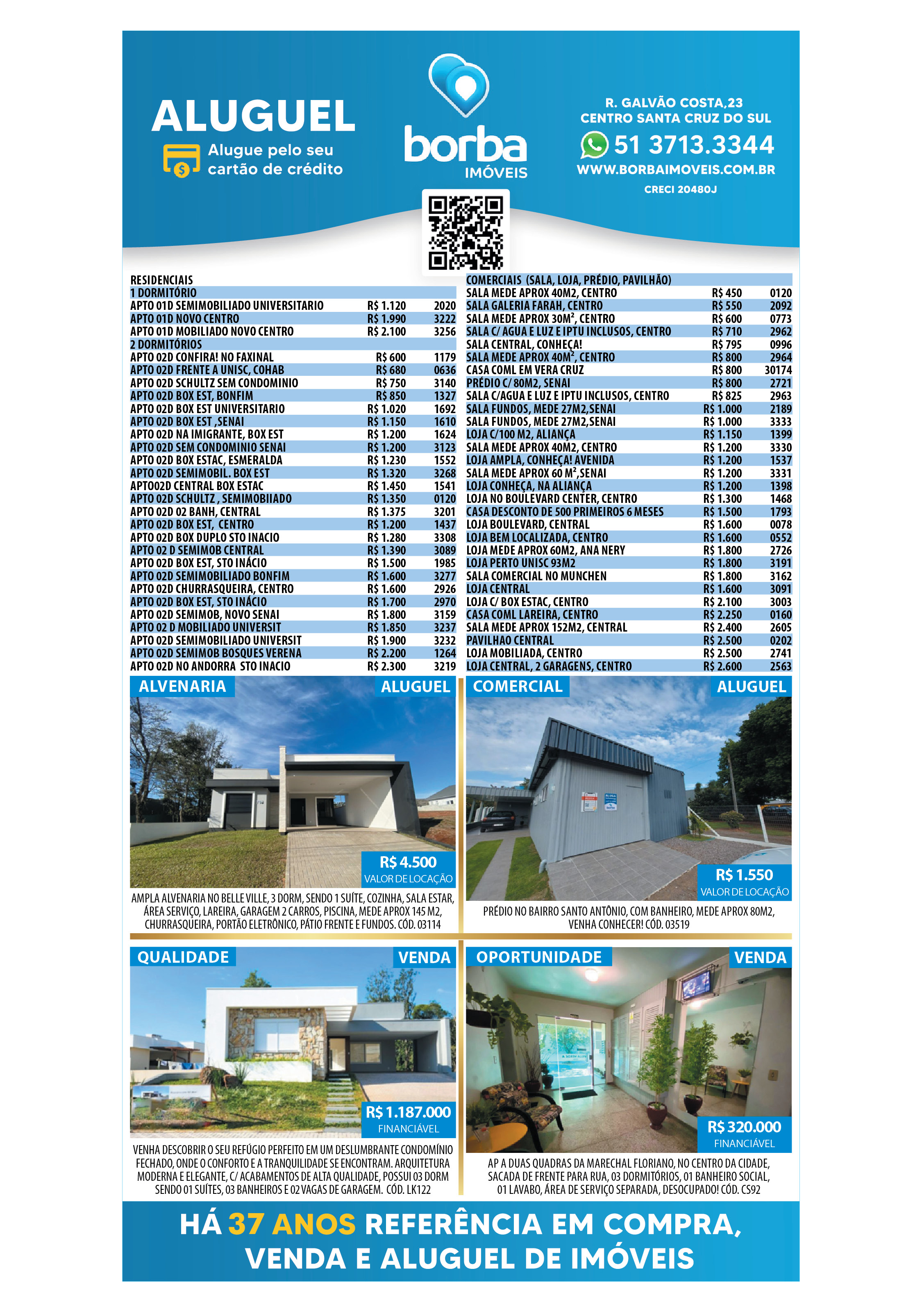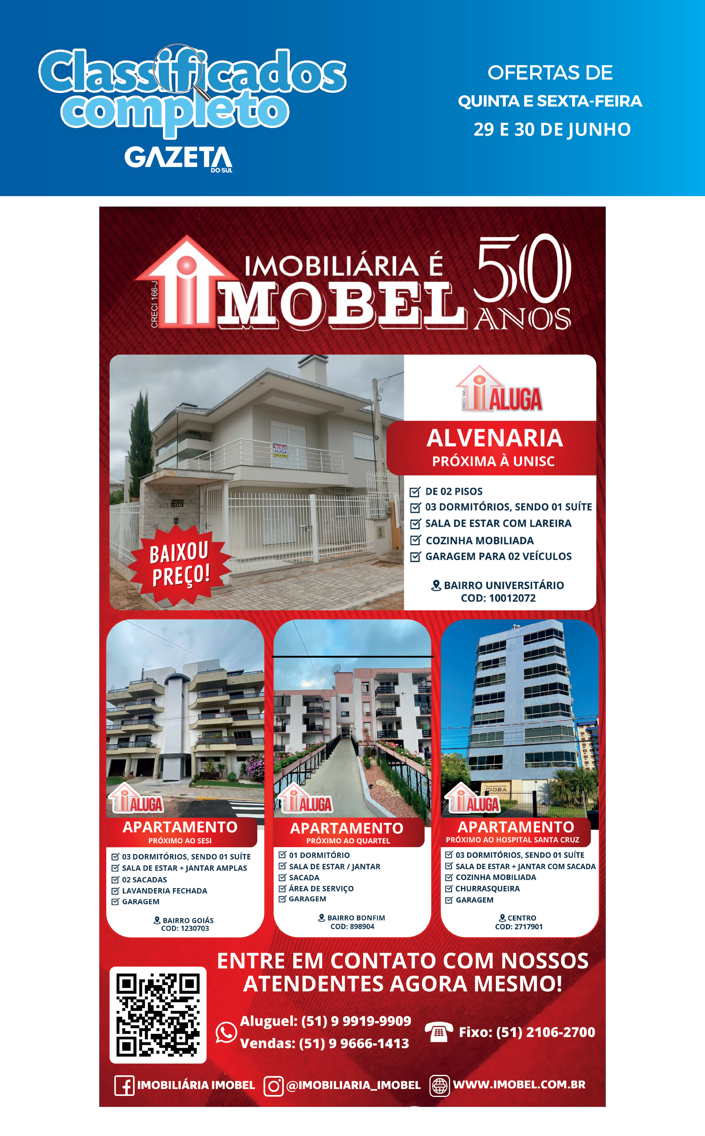 O suplemento de Classificados, que circula nas edições de terças, quintas e sábados, é um dos mais tradicionais da Gazeta do Sul, como vitrine e canal de negócios, de oferta, compra e venda em toda a região central do Rio Grande do Sul. E, para enriquecer pesquisas de produtos e serviços e possibilitar resultado ainda melhor a usuários e parceiros, nos anúncios de clientes cadastrados, o leitor tem acesso direto com link ao site do anunciante, onde poderá verificar mais detalhes sobre os itens. Confira as ofertas: