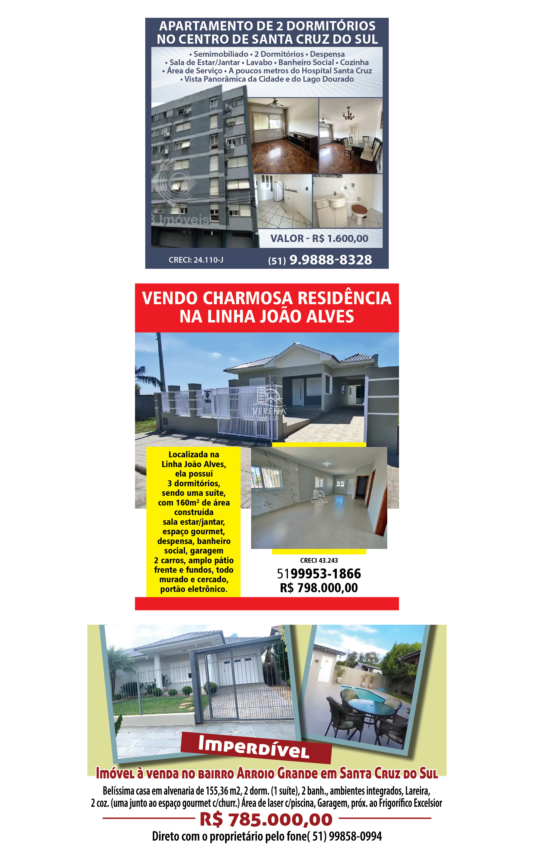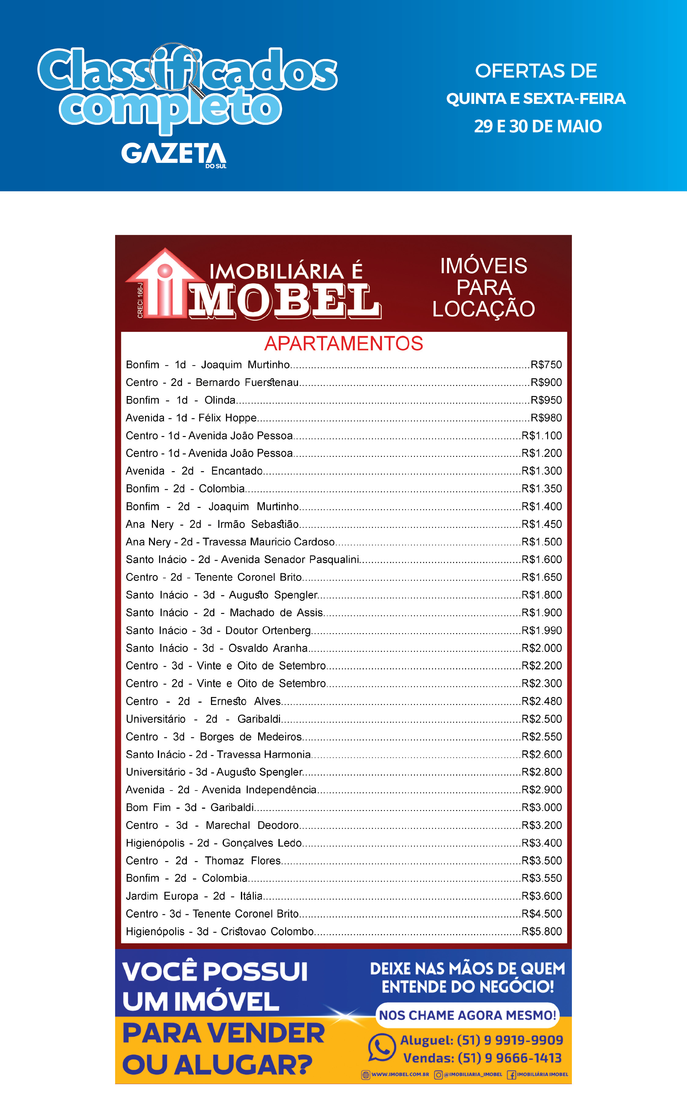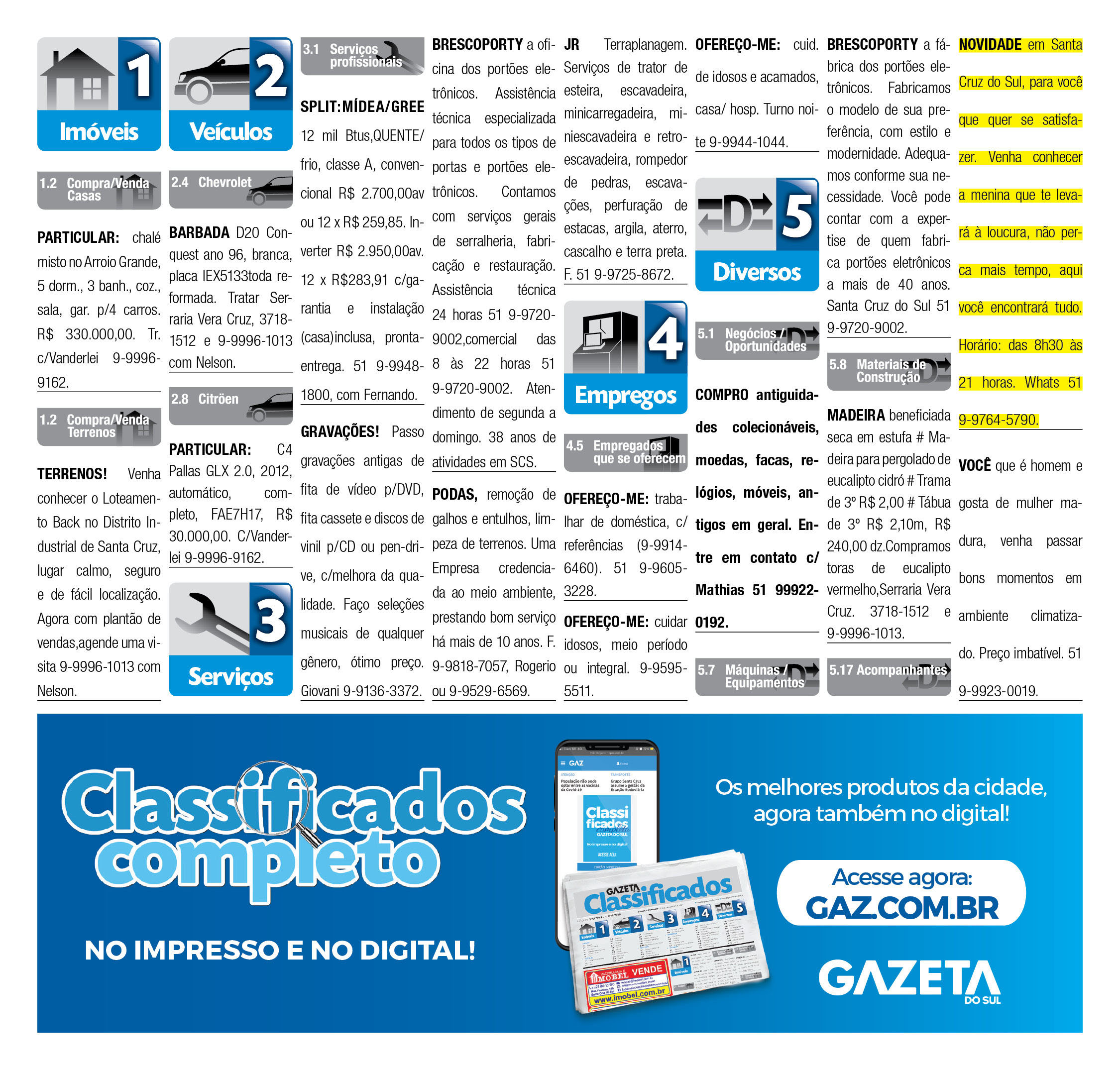O suplemento de Classificados, que circula nas edições de terças, quintas e sábados, é um dos mais tradicionais da Gazeta do Sul, como vitrine e canal de negócios, de oferta, compra e venda em toda a região central do Rio Grande do Sul. E, para enriquecer pesquisas de produtos e serviços e possibilitar resultado ainda melhor a usuários e parceiros, nos anúncios de clientes cadastrados, o leitor tem acesso direto com link ao site do anunciante, onde poderá verificar mais detalhes sobre os itens. Confira as ofertas: