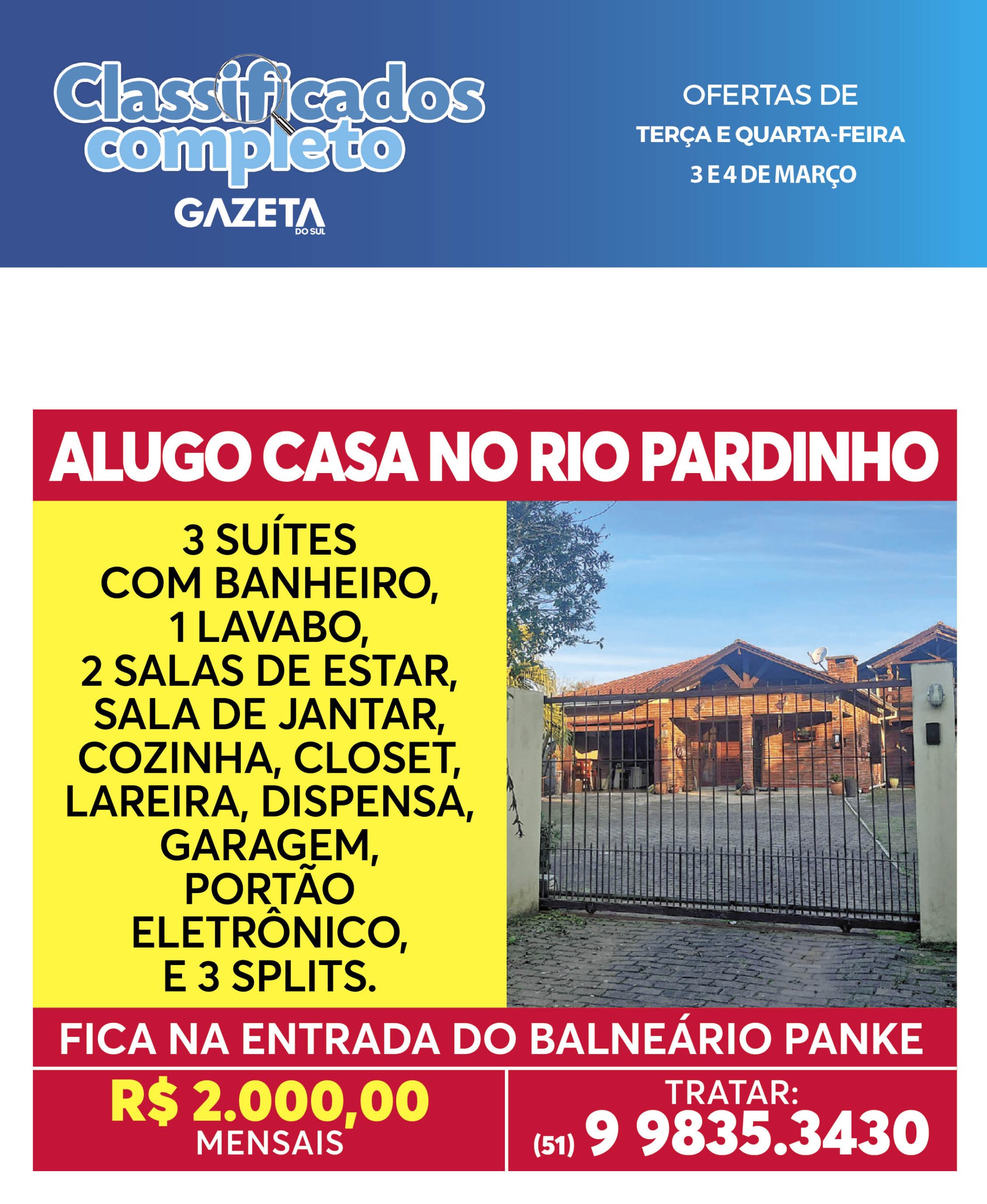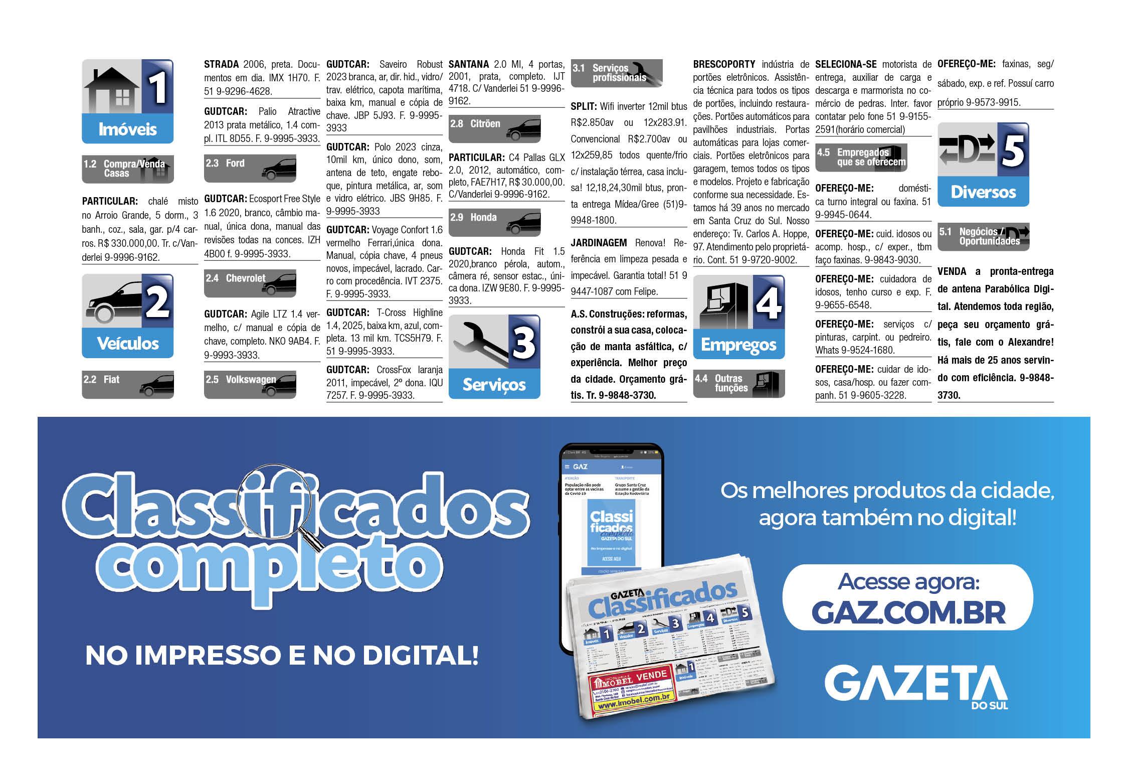 O suplemento de Classificados, que circula nas edições de terças, quintas e sábados, é um dos mais tradicionais da Gazeta do Sul, como vitrine e canal de negócios, de oferta, compra e venda em toda a região central do Rio Grande do Sul. E, para enriquecer pesquisas de produtos e serviços e possibilitar resultado ainda melhor a usuários e parceiros, nos anúncios de clientes cadastrados, o leitor tem acesso direto com link ao site do anunciante, onde poderá verificar mais detalhes sobre os itens. Confira as ofertas: