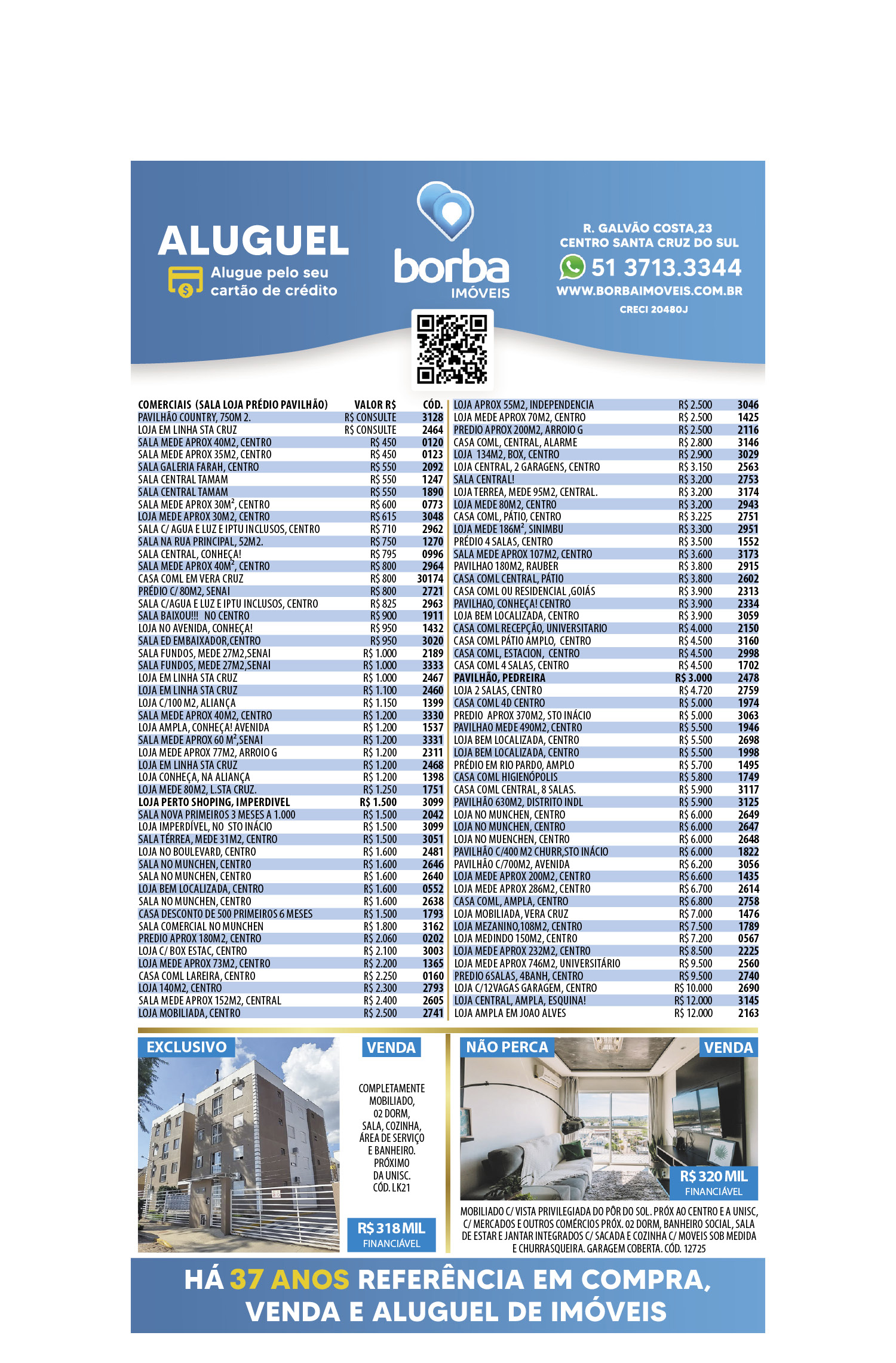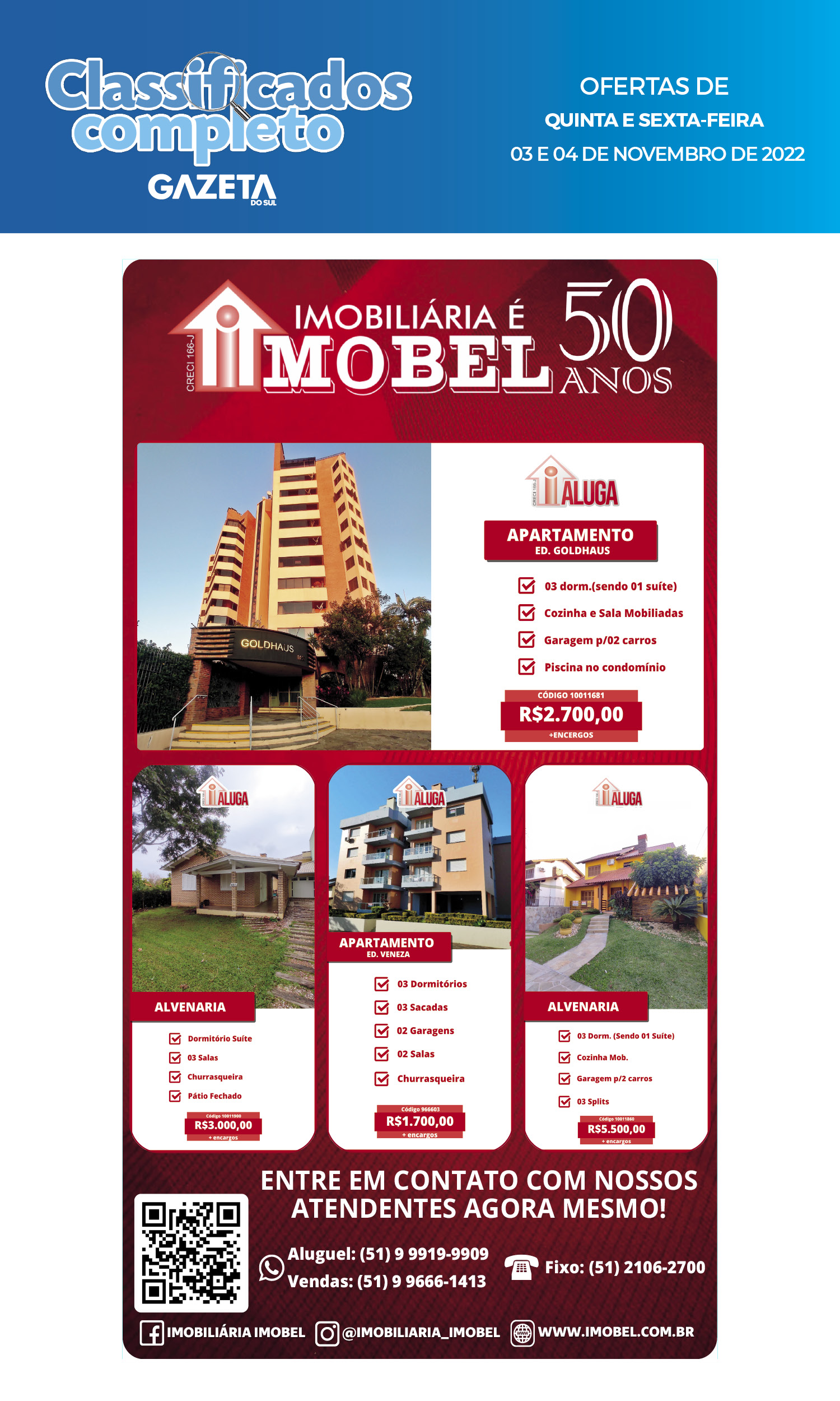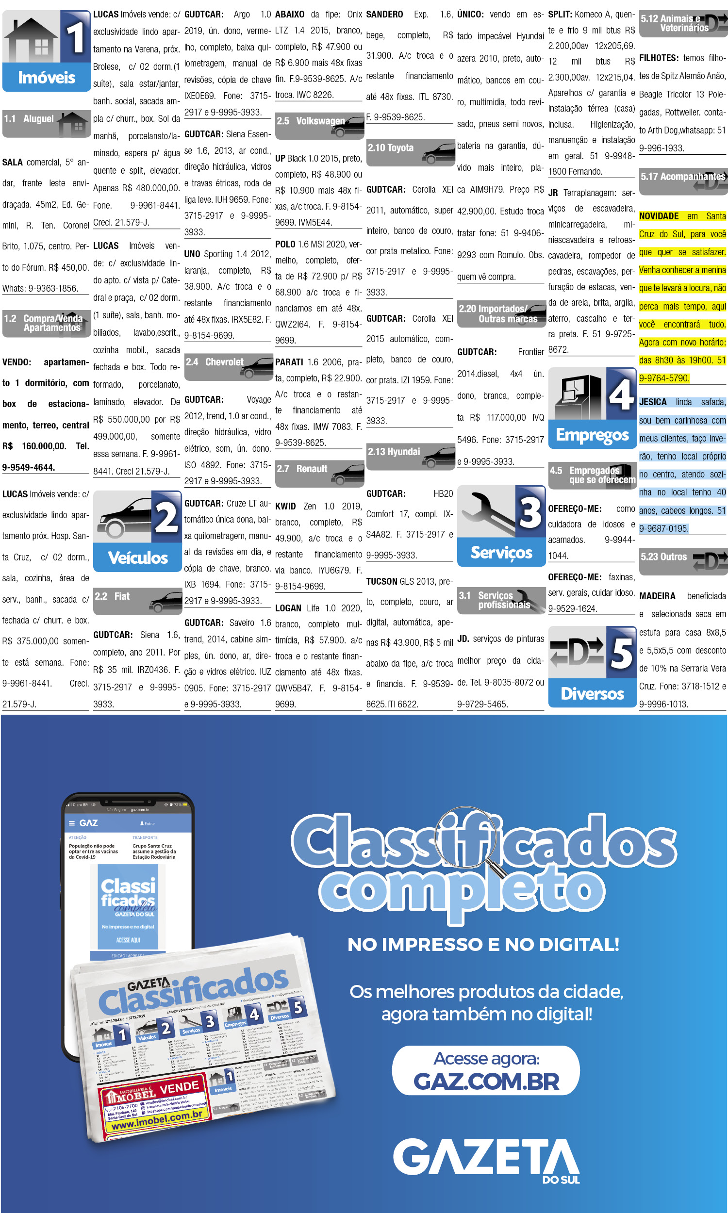 O suplemento de Classificados, que circula nas edições de terças, quintas e sábados, é um dos mais tradicionais da Gazeta do Sul, como vitrine e canal de negócios, de oferta, compra e venda em toda a região central do Rio Grande do Sul. E, para enriquecer pesquisas de produtos e serviços e possibilitar resultado ainda melhor a usuários e parceiros, nos anúncios de clientes cadastrados, o leitor tem acesso direto com link ao site do anunciante, onde poderá verificar mais detalhes sobre os itens. Confira as ofertas: