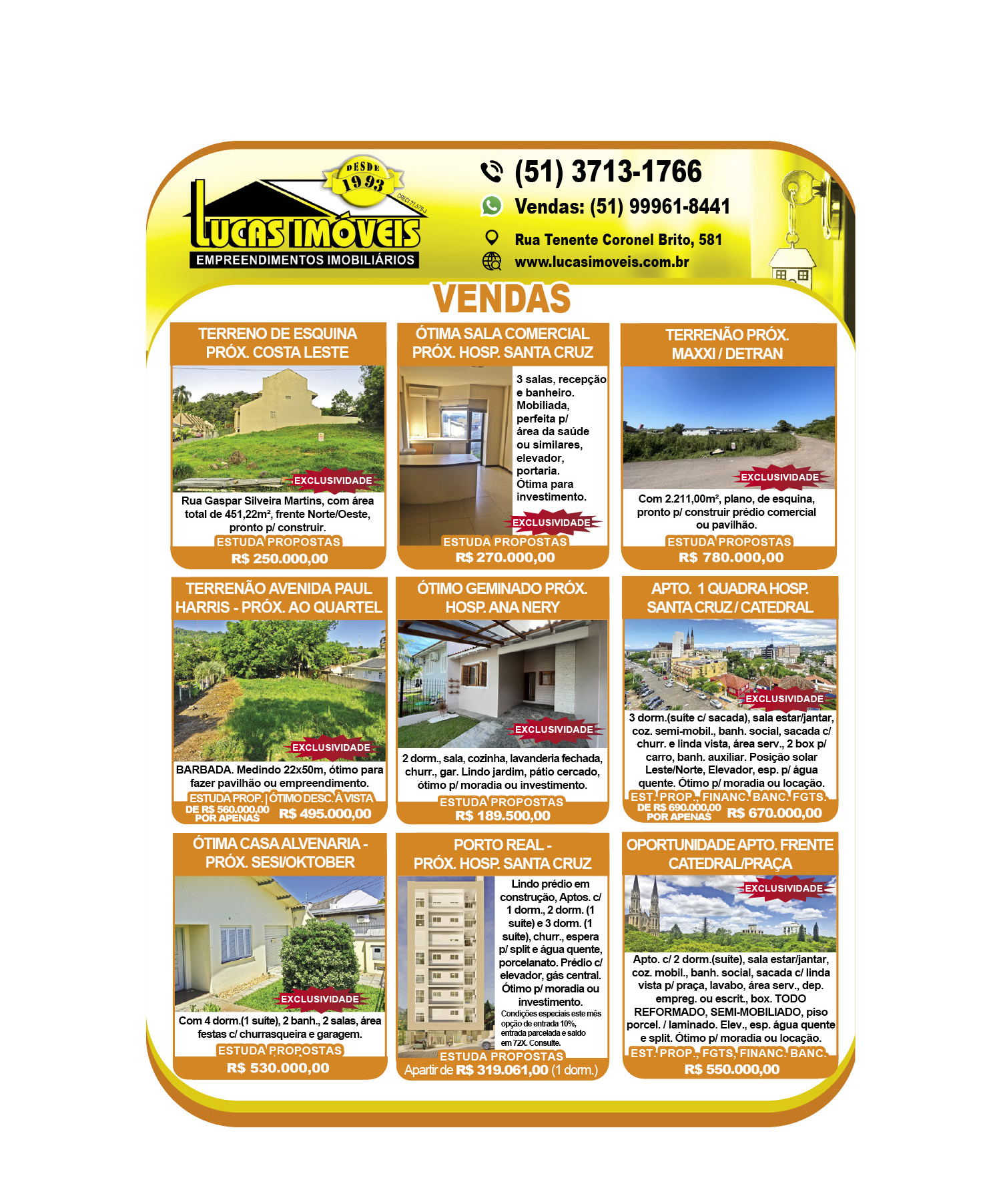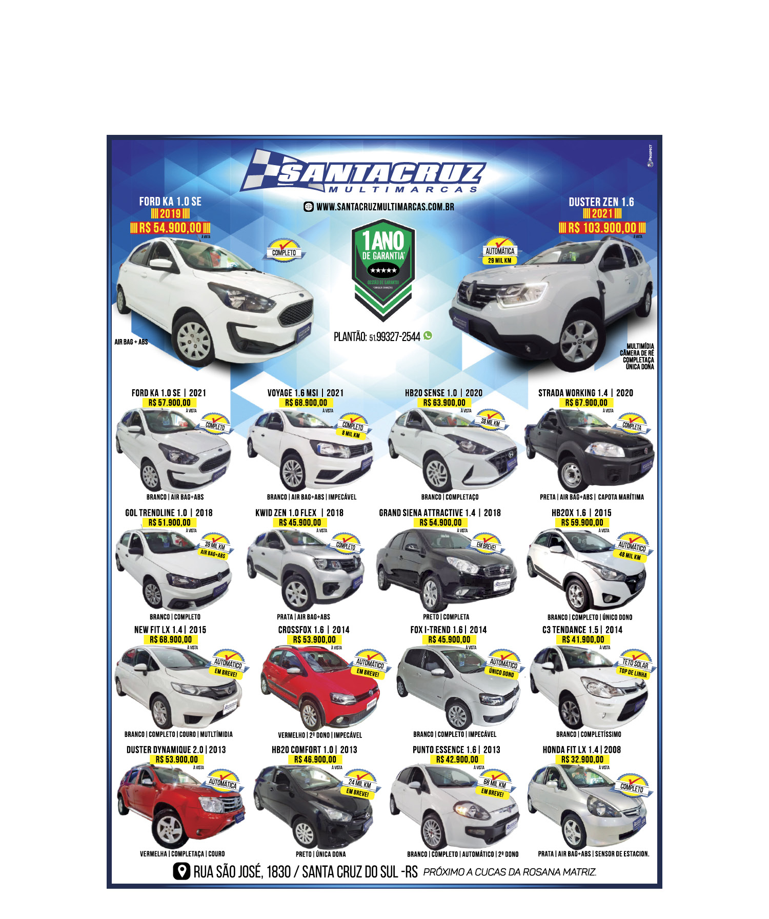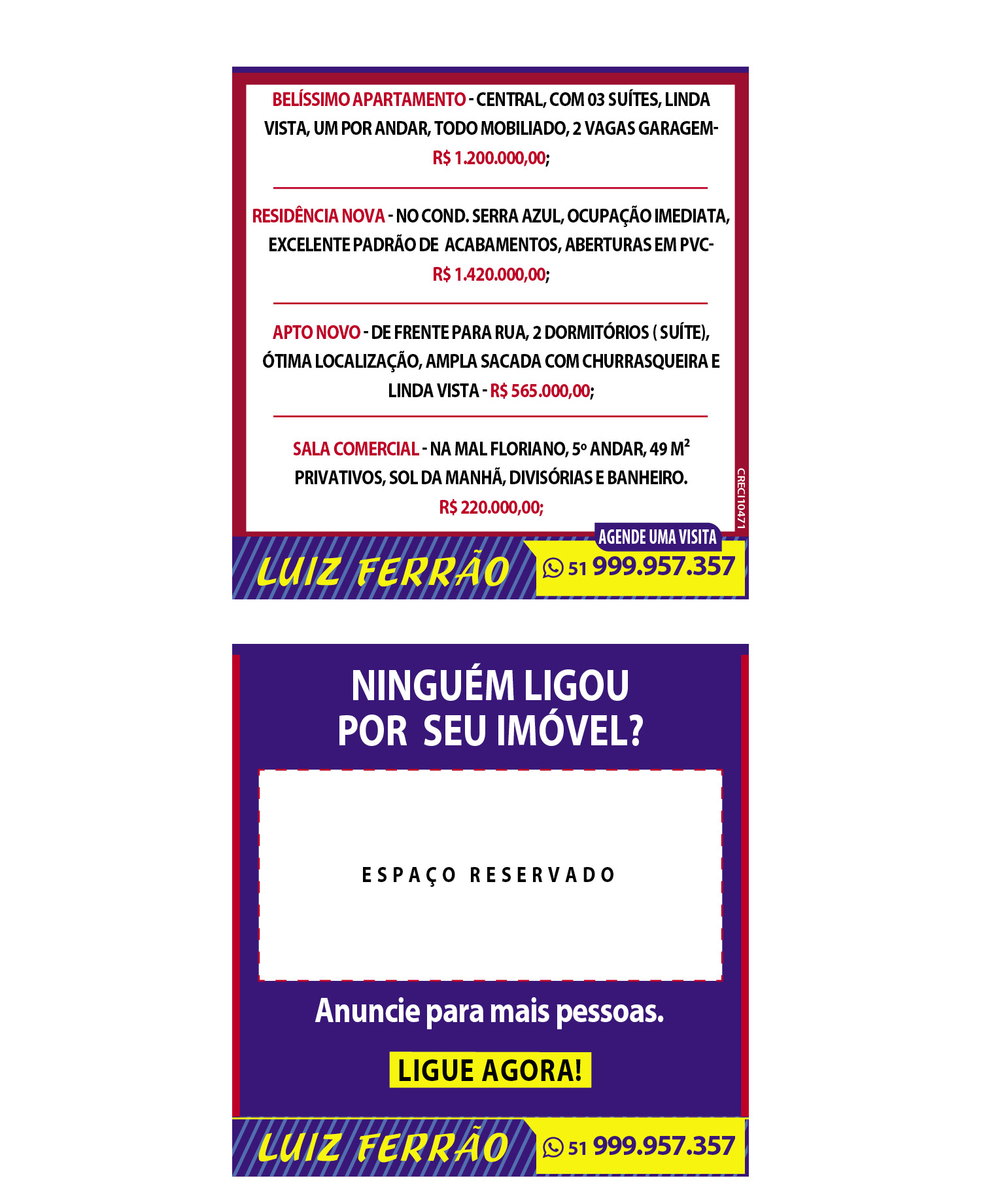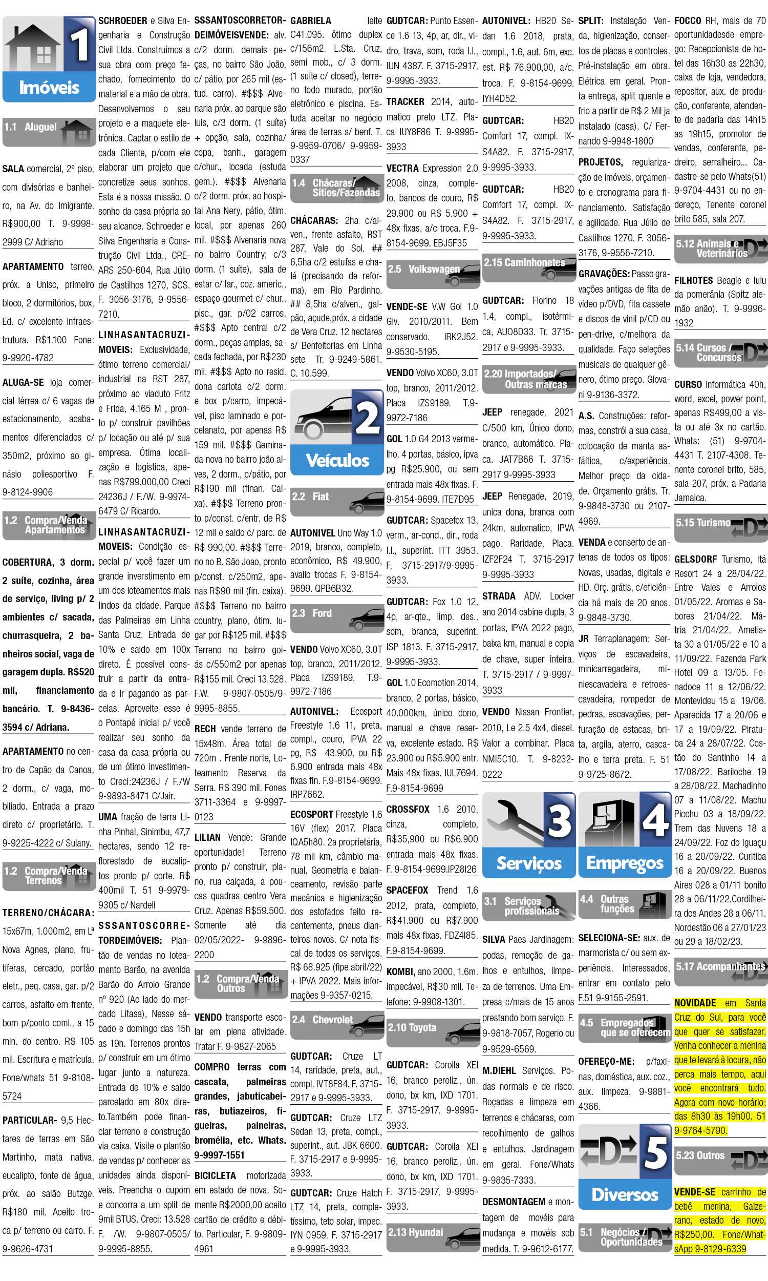 O suplemento de Classificados, que circula nas edições de terças, quintas e sábados, é um dos mais tradicionais da Gazeta do Sul, como vitrine e canal de negócios, de oferta, compra e venda em toda a região central do Rio Grande do Sul. E, para enriquecer pesquisas de produtos e serviços e possibilitar resultado ainda melhor a usuários e parceiros, nos anúncios de clientes cadastrados, o leitor tem acesso direto com link ao site do anunciante, onde poderá verificar mais detalhes sobre os itens. Confira as ofertas: