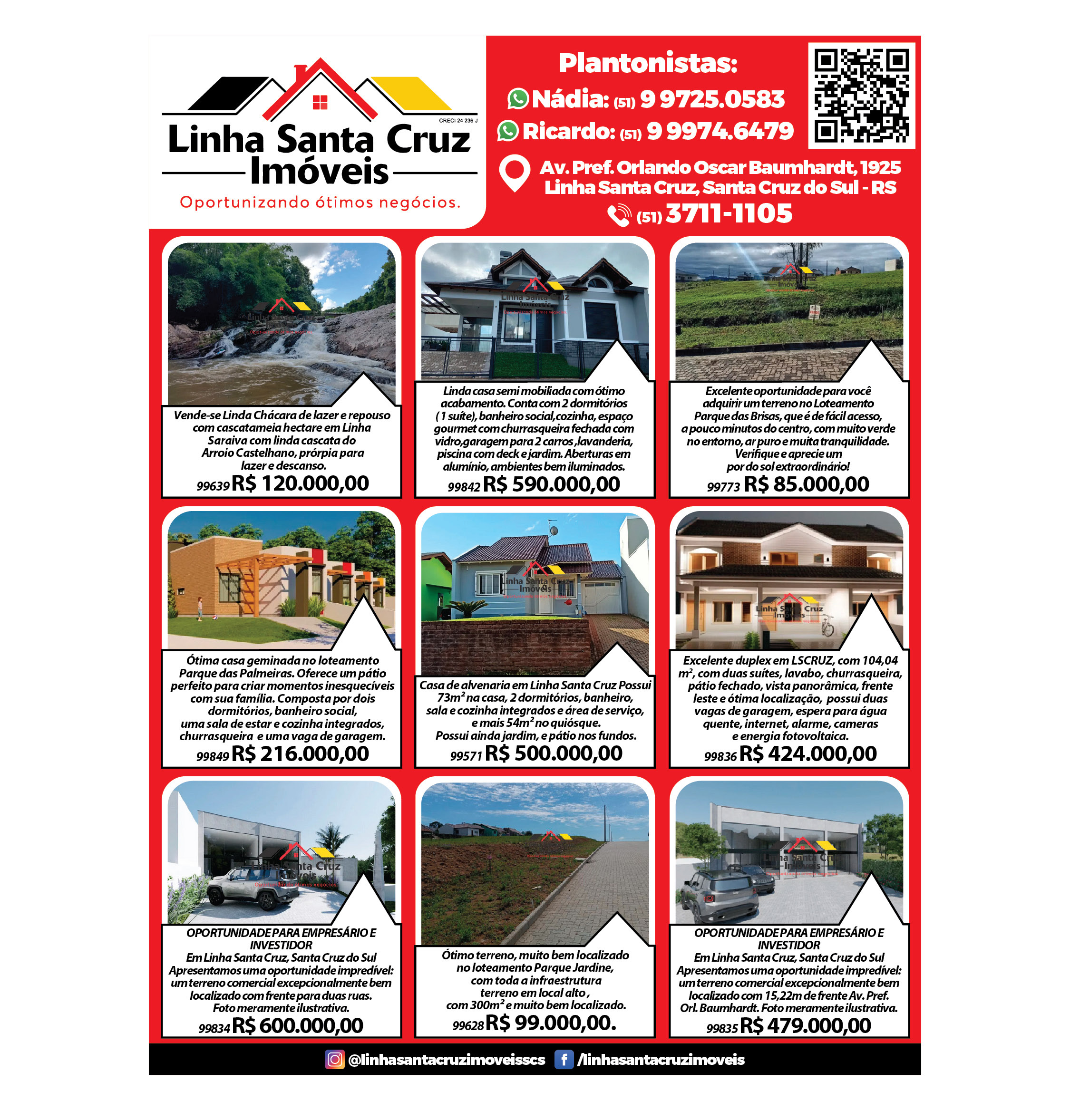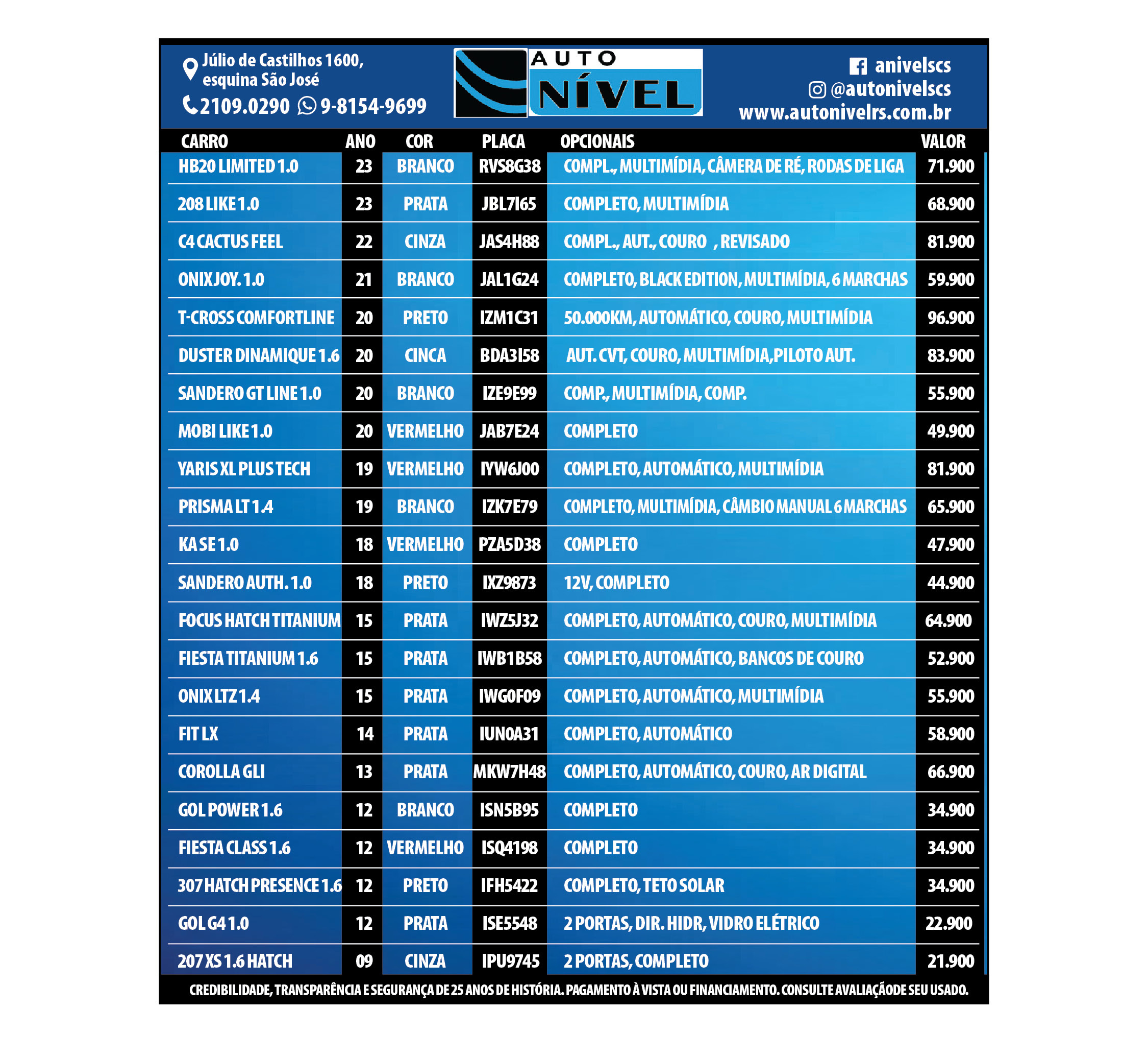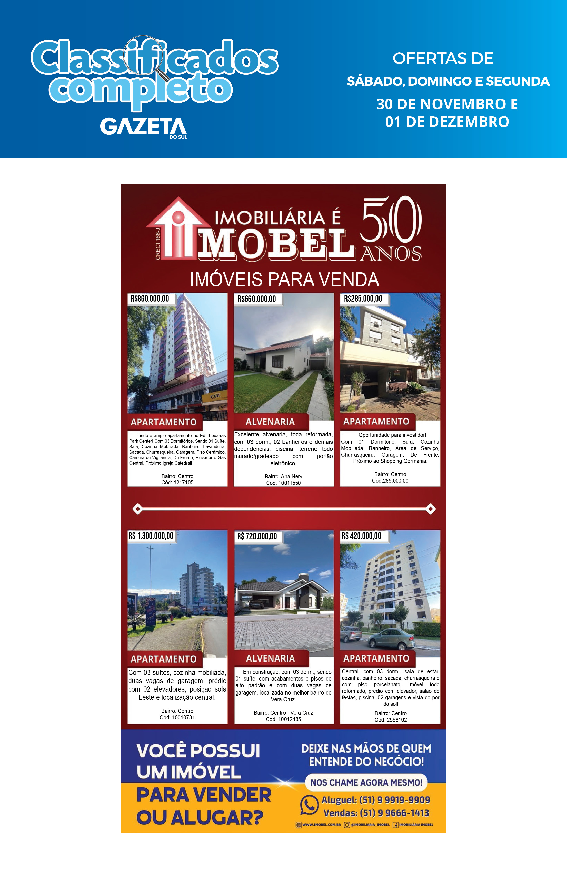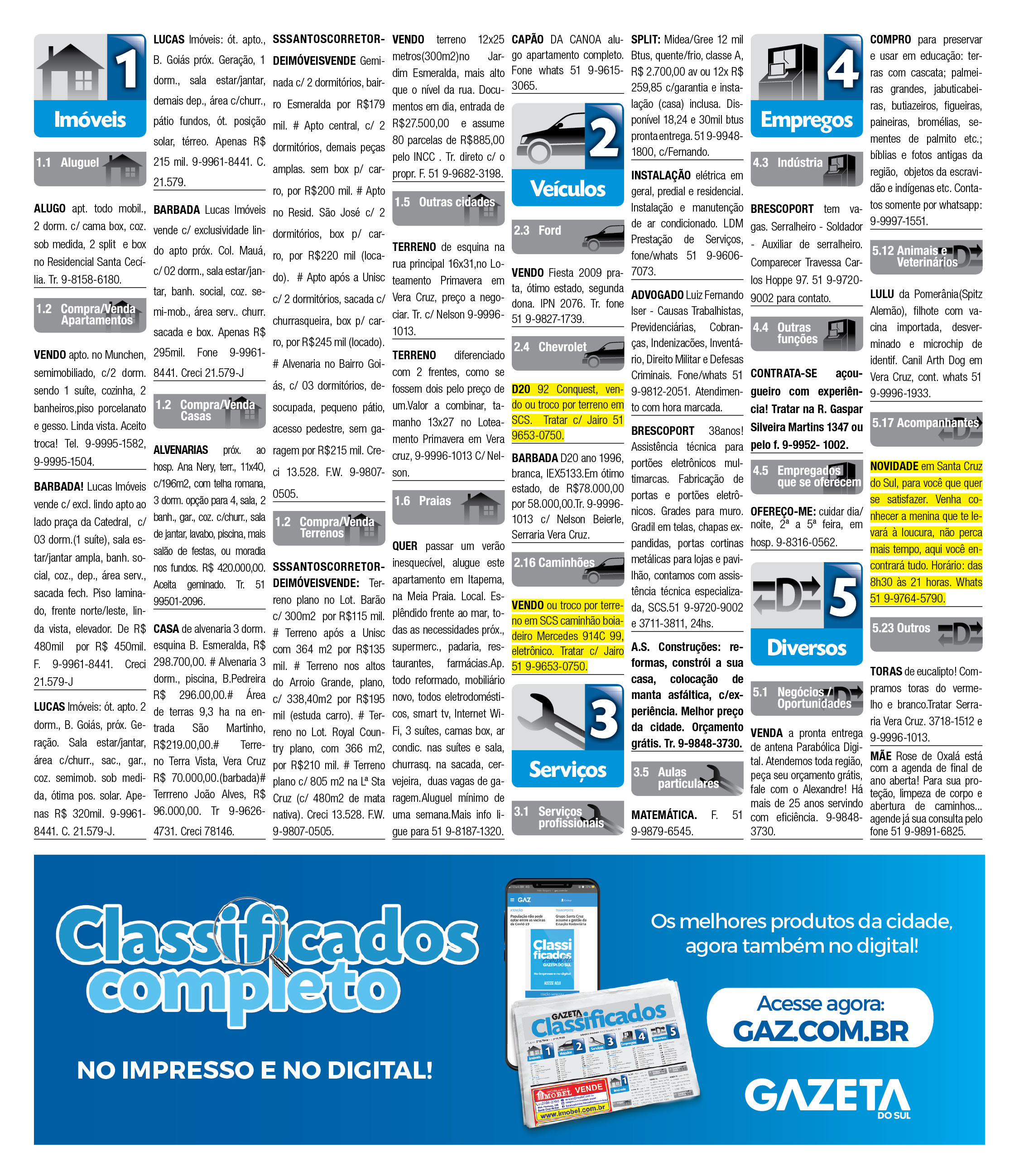 O suplemento de Classificados, que circula nas edições de terças, quintas e sábados, é um dos mais tradicionais da Gazeta do Sul, como vitrine e canal de negócios, de oferta, compra e venda em toda a região central do Rio Grande do Sul. E, para enriquecer pesquisas de produtos e serviços e possibilitar resultado ainda melhor a usuários e parceiros, nos anúncios de clientes cadastrados, o leitor tem acesso direto com link ao site do anunciante, onde poderá verificar mais detalhes sobre os itens. Confira as ofertas: