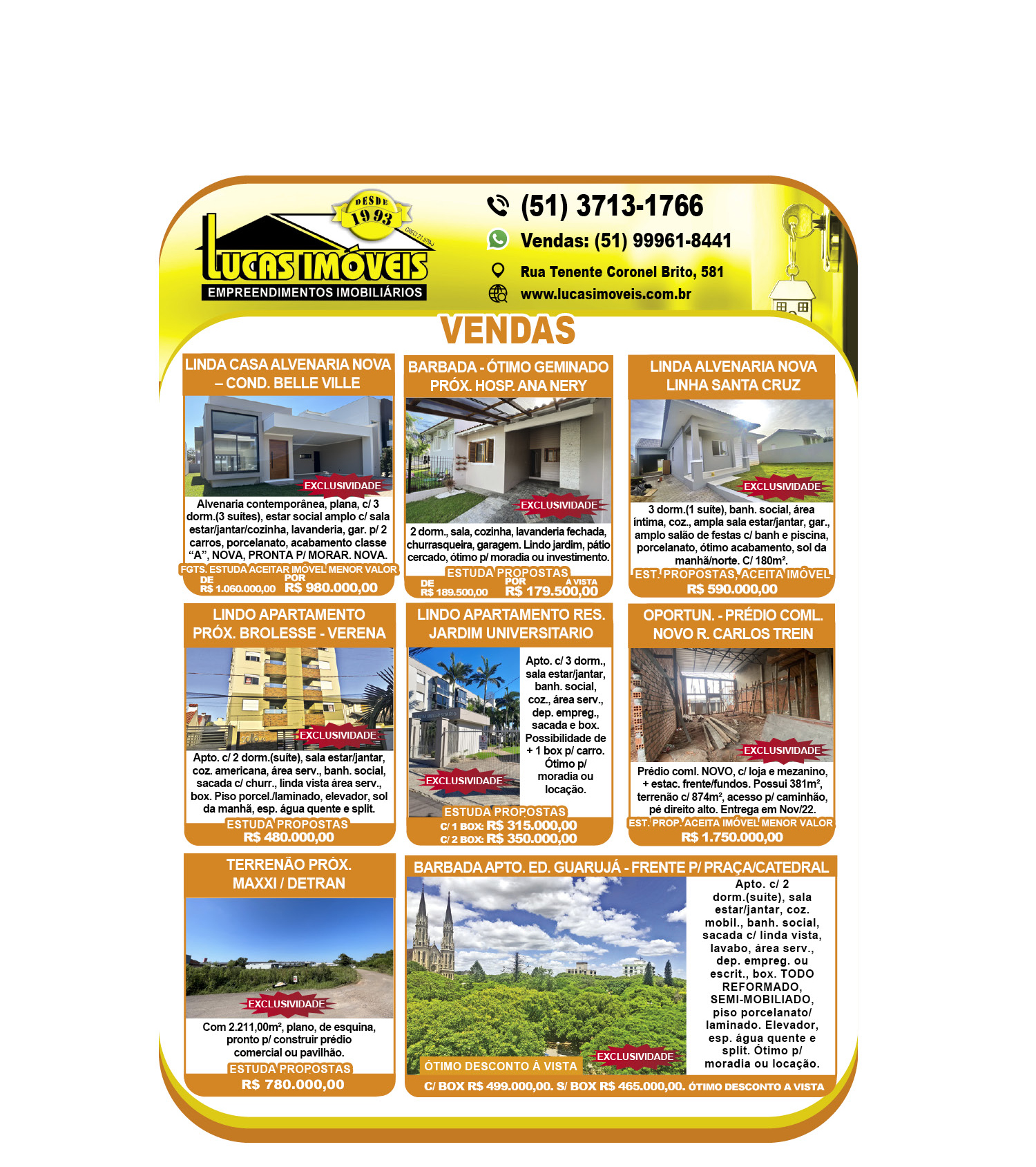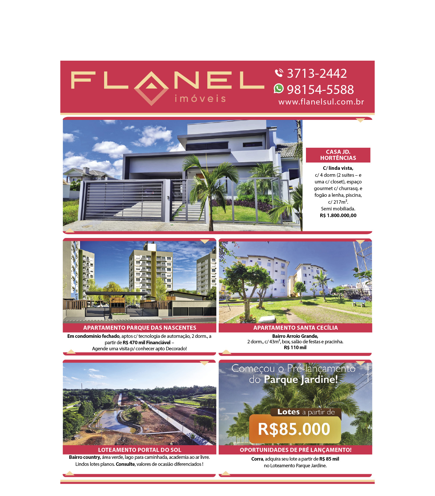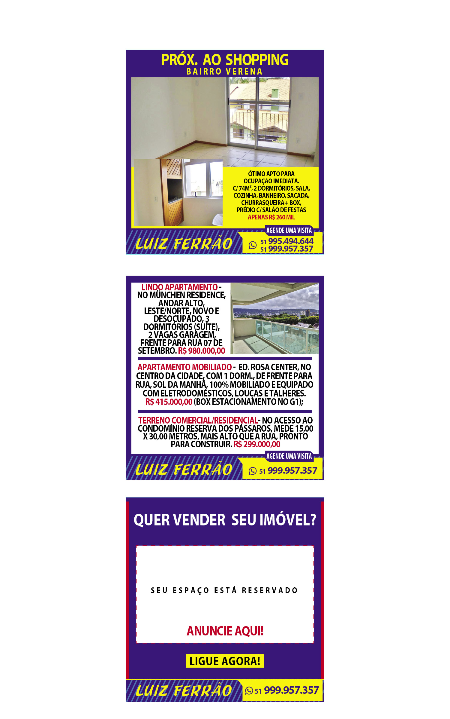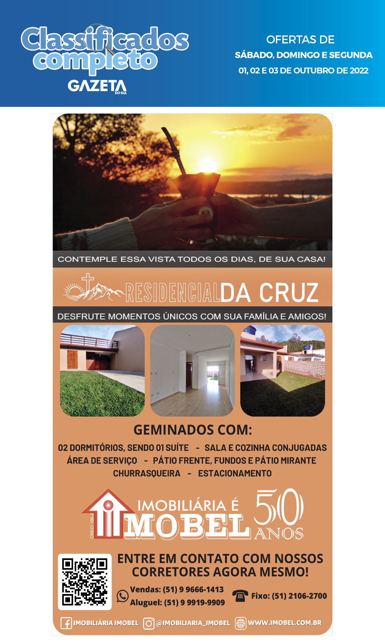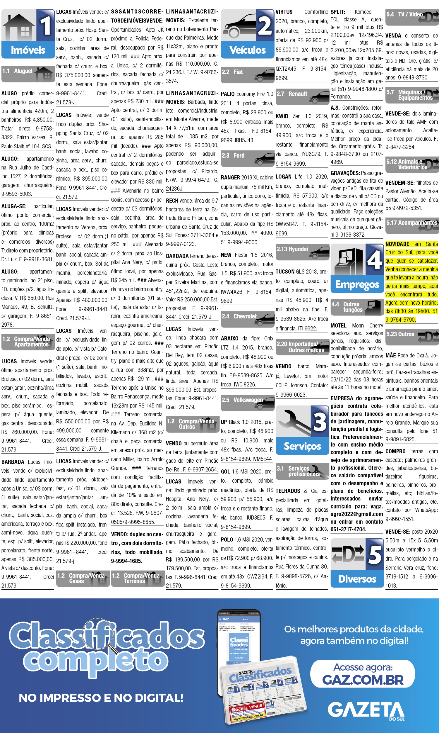 O suplemento de Classificados, que circula nas edições de terças, quintas e sábados, é um dos mais tradicionais da Gazeta do Sul, como vitrine e canal de negócios, de oferta, compra e venda em toda a região central do Rio Grande do Sul. E, para enriquecer pesquisas de produtos e serviços e possibilitar resultado ainda melhor a usuários e parceiros, nos anúncios de clientes cadastrados, o leitor tem acesso direto com link ao site do anunciante, onde poderá verificar mais detalhes sobre os itens. Confira as ofertas: