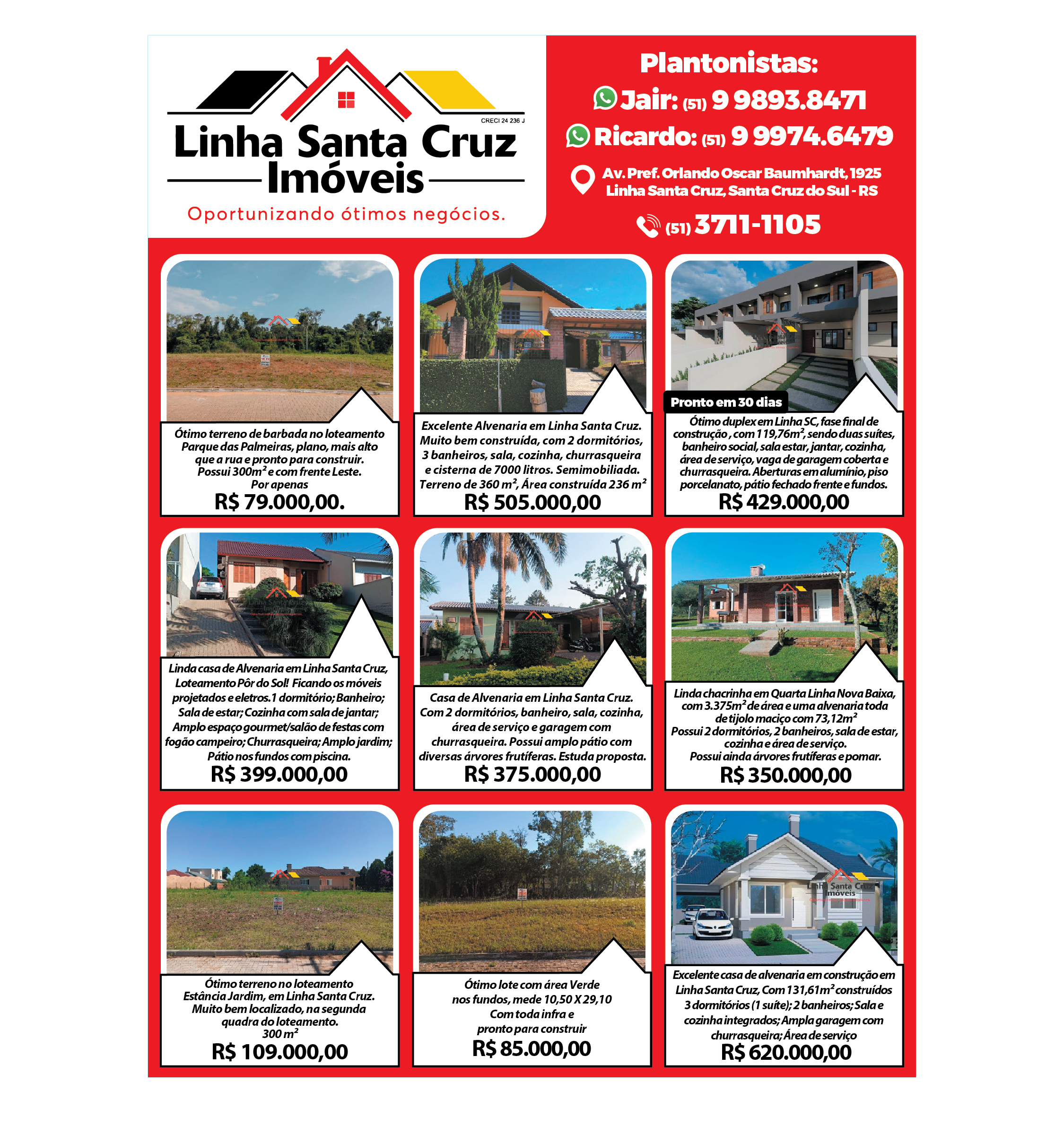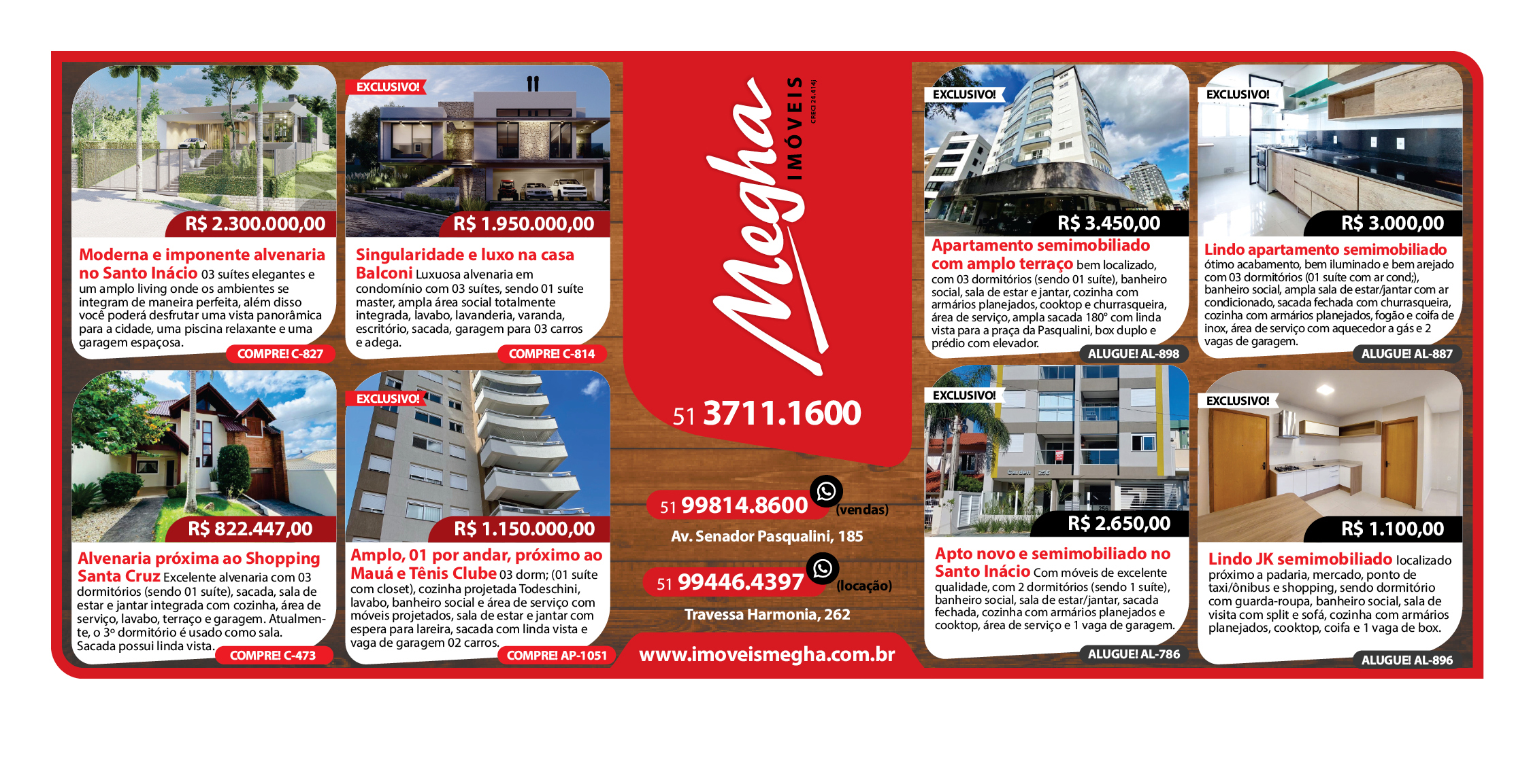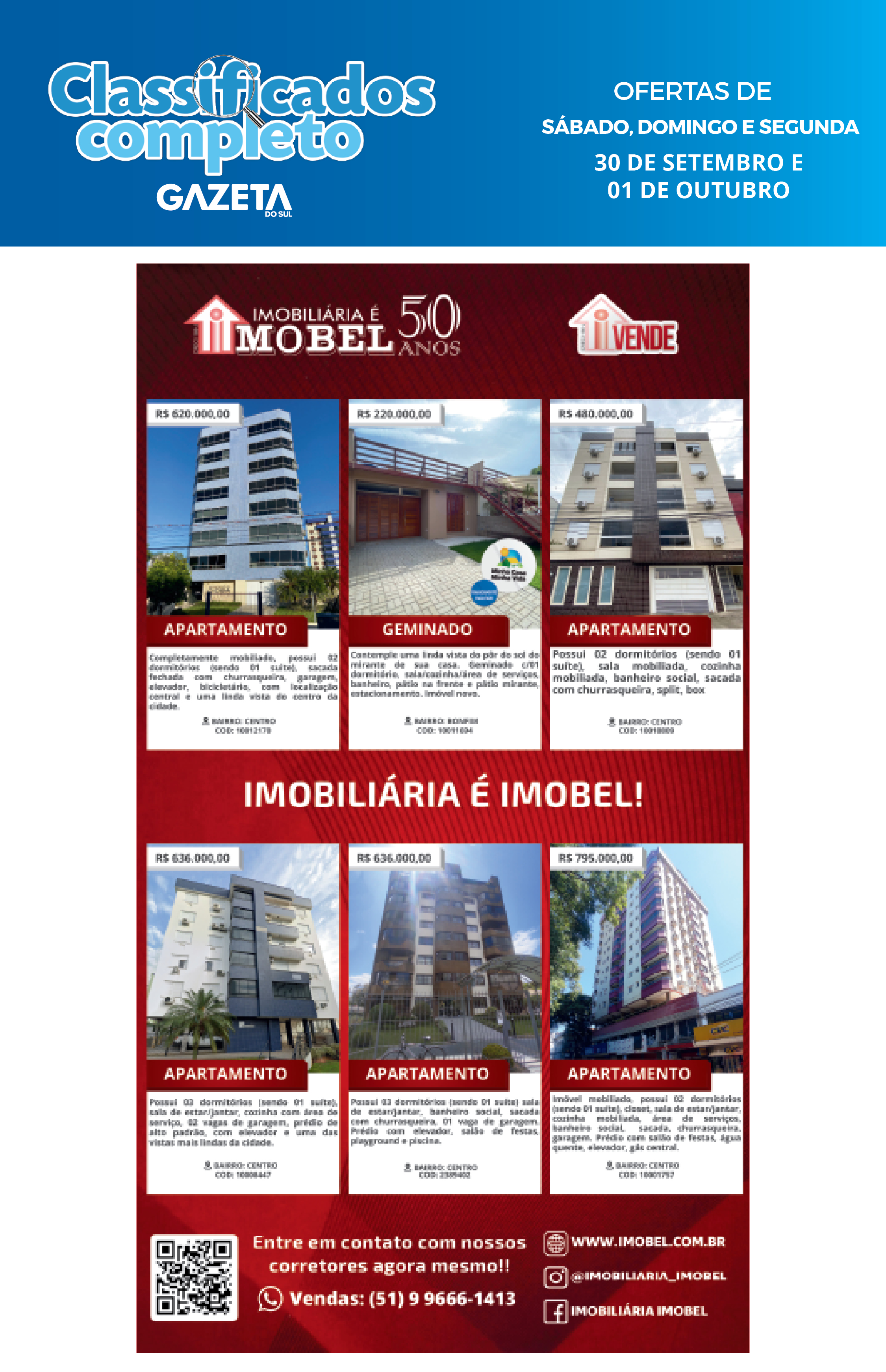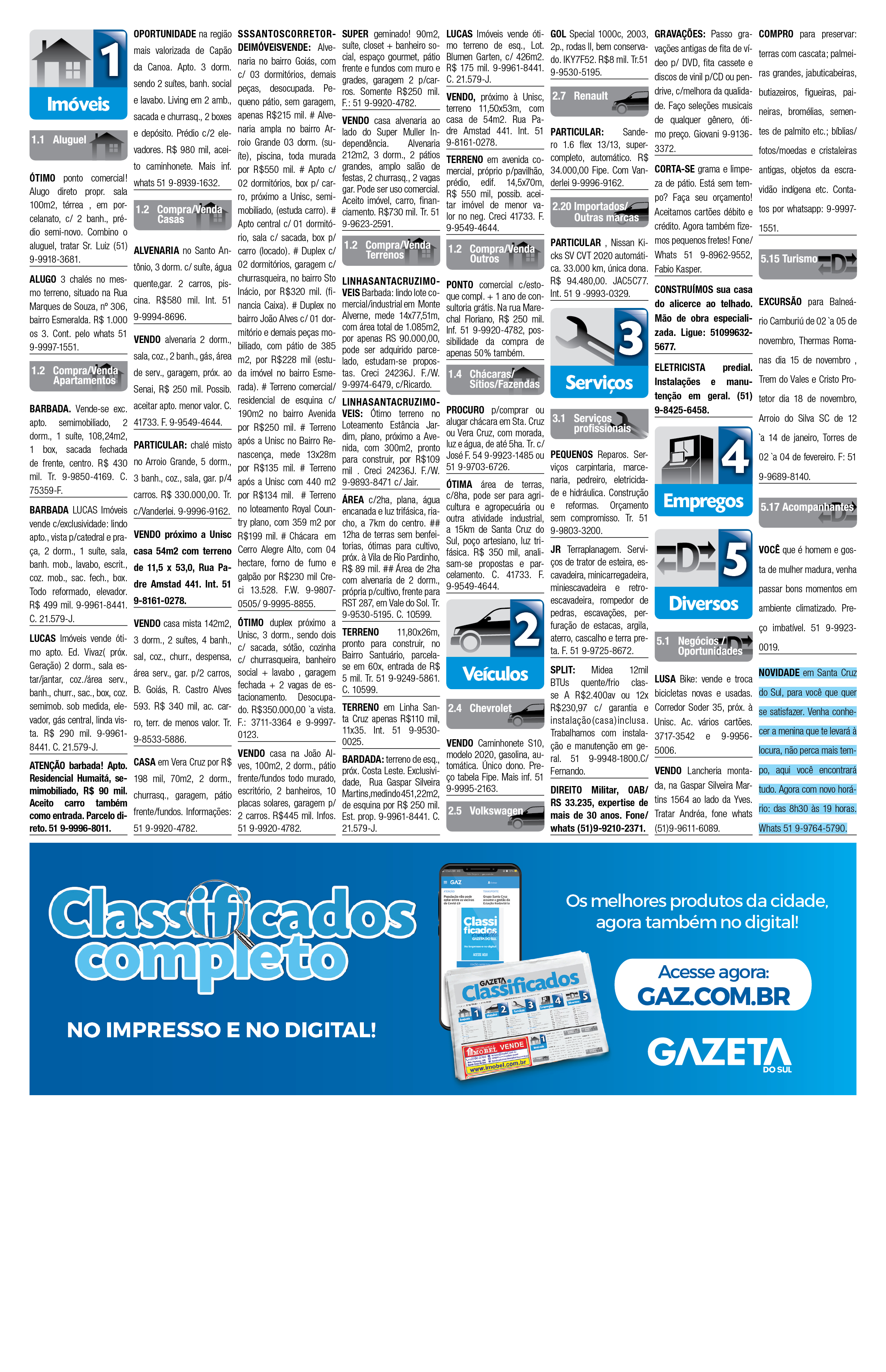 O suplemento de Classificados, que circula nas edições de terças, quintas e sábados, é um dos mais tradicionais da Gazeta do Sul, como vitrine e canal de negócios, de oferta, compra e venda em toda a região central do Rio Grande do Sul. E, para enriquecer pesquisas de produtos e serviços e possibilitar resultado ainda melhor a usuários e parceiros, nos anúncios de clientes cadastrados, o leitor tem acesso direto com link ao site do anunciante, onde poderá verificar mais detalhes sobre os itens. Confira as ofertas: