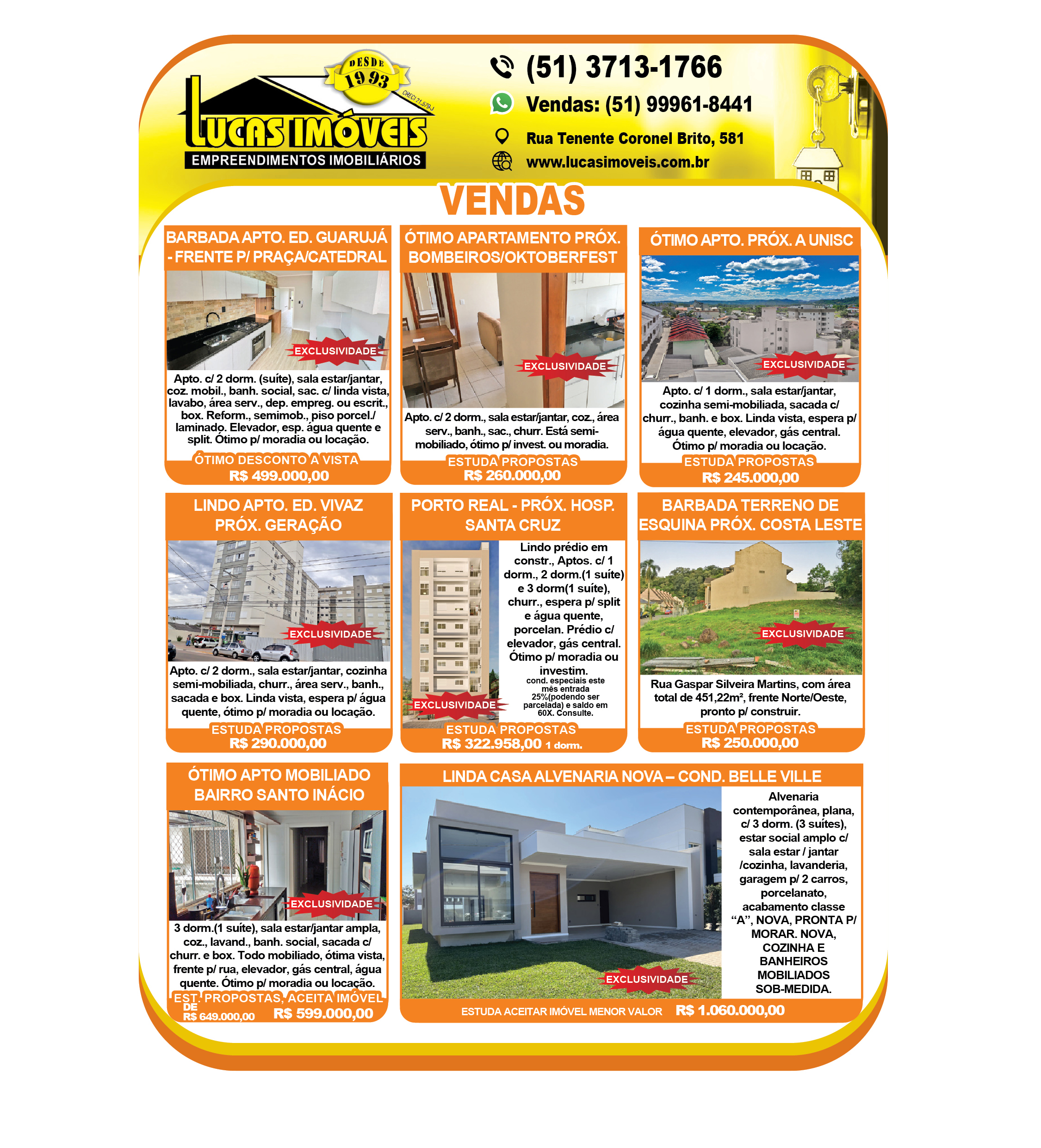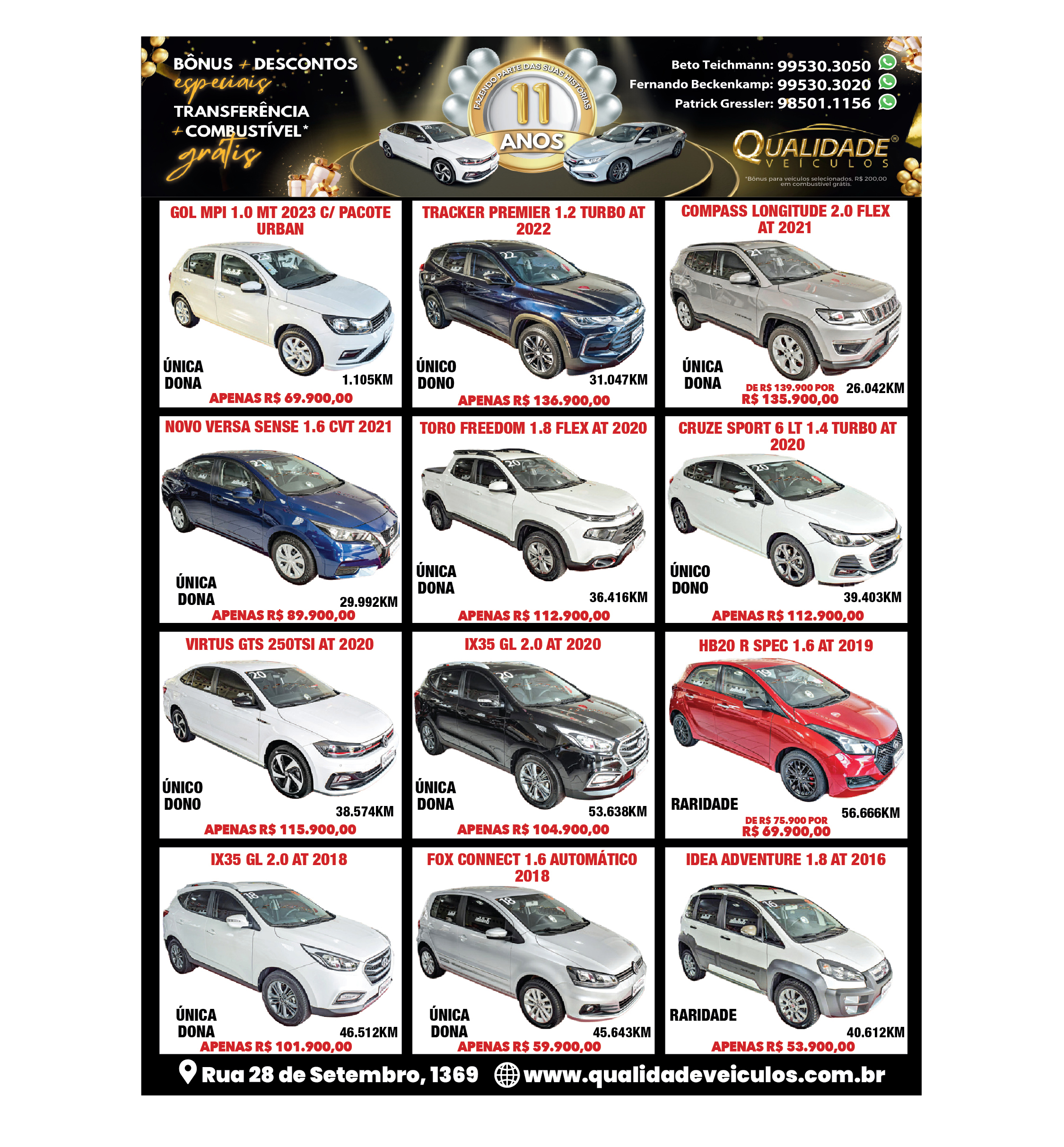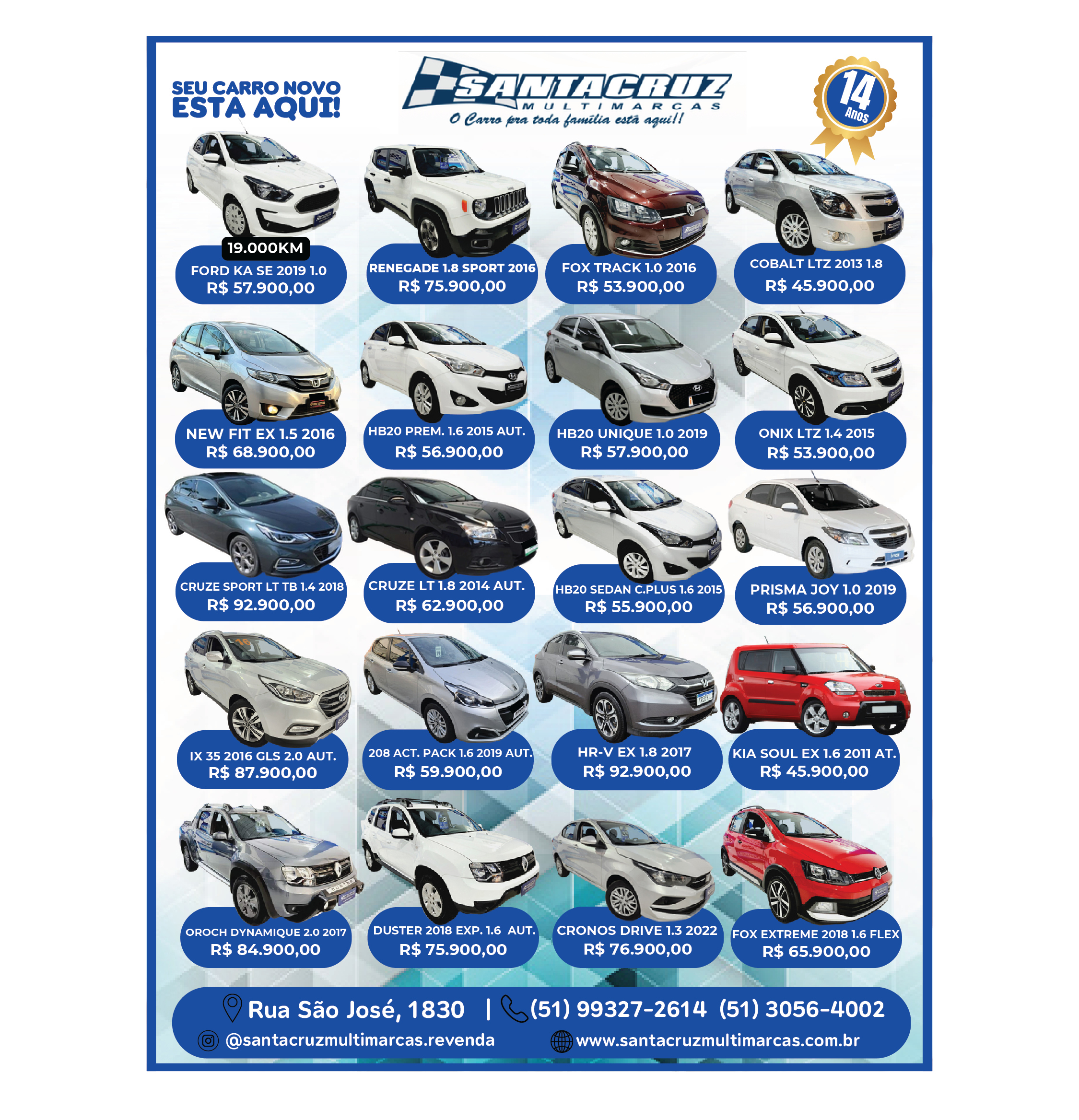 O suplemento de Classificados, que circula nas edições de terças, quintas e sábados, é um dos mais tradicionais da Gazeta do Sul, como vitrine e canal de negócios, de oferta, compra e venda em toda a região central do Rio Grande do Sul. E, para enriquecer pesquisas de produtos e serviços e possibilitar resultado ainda melhor a usuários e parceiros, nos anúncios de clientes cadastrados, o leitor tem acesso direto com link ao site do anunciante, onde poderá verificar mais detalhes sobre os itens. Confira as ofertas: