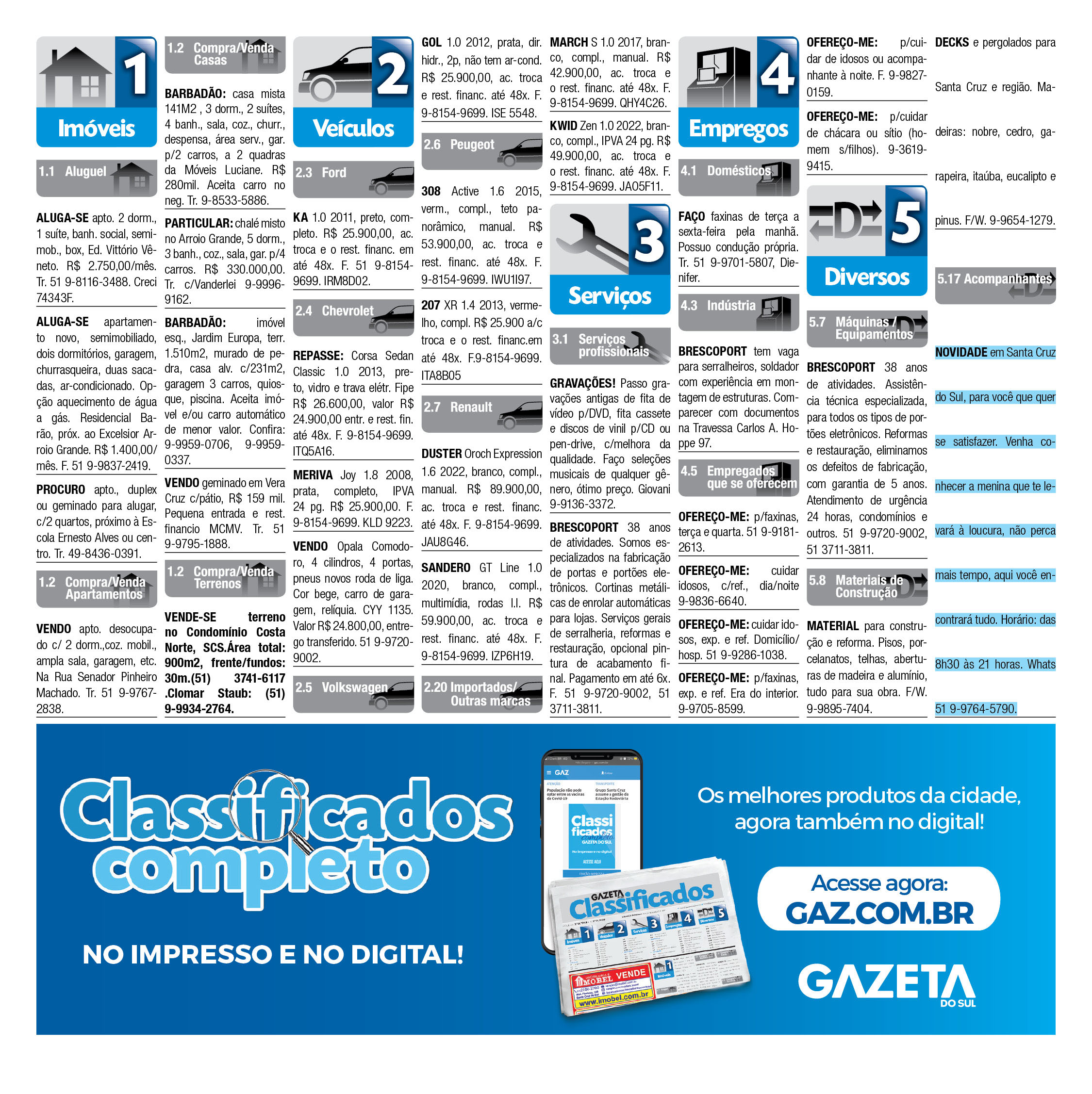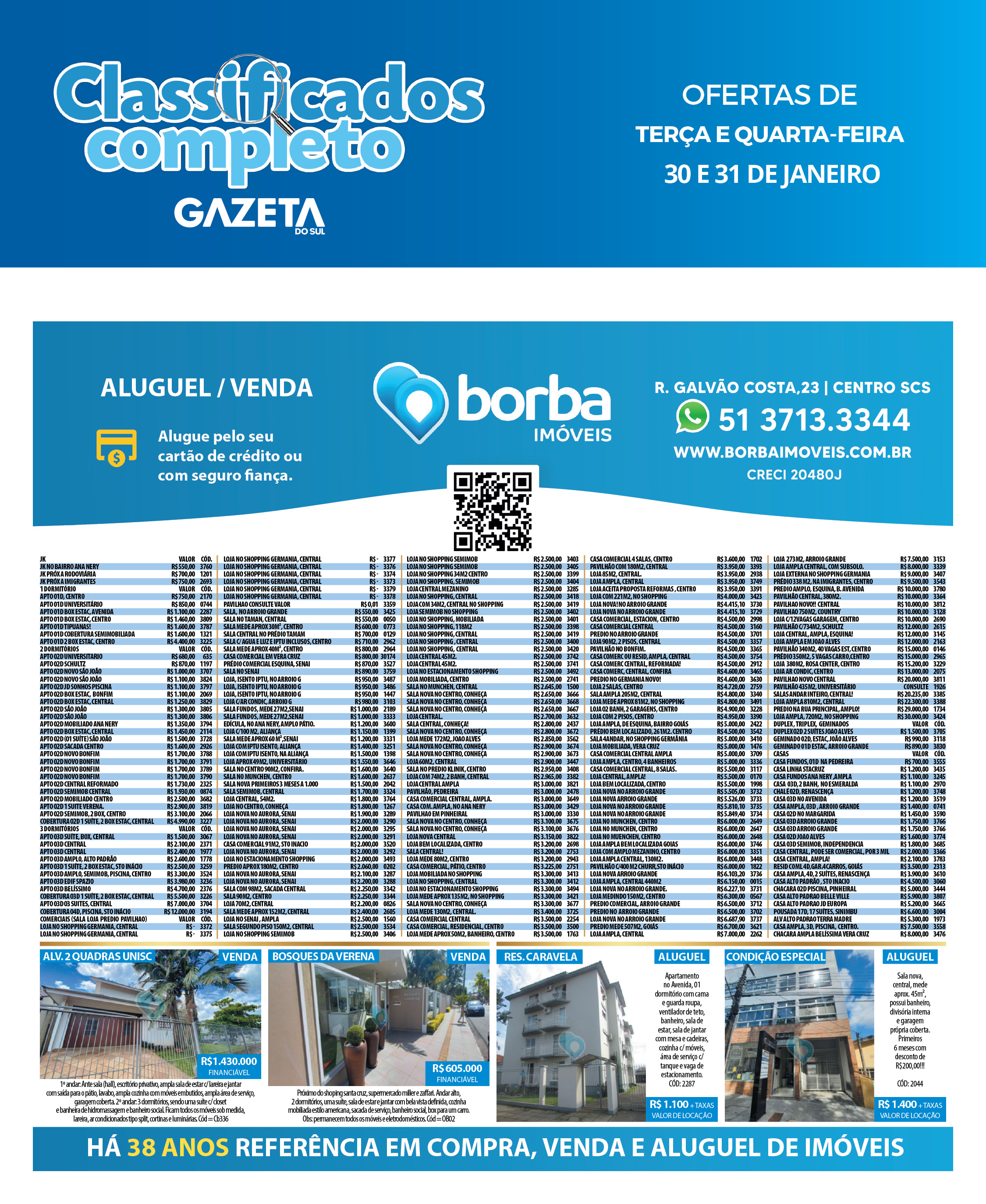 O suplemento de Classificados, que circula nas edições de terças, quintas e sábados, é um dos mais tradicionais da Gazeta do Sul, como vitrine e canal de negócios, de oferta, compra e venda em toda a região central do Rio Grande do Sul. E, para enriquecer pesquisas de produtos e serviços e possibilitar resultado ainda melhor a usuários e parceiros, nos anúncios de clientes cadastrados, o leitor tem acesso direto com link ao site do anunciante, onde poderá verificar mais detalhes sobre os itens. Confira as ofertas: