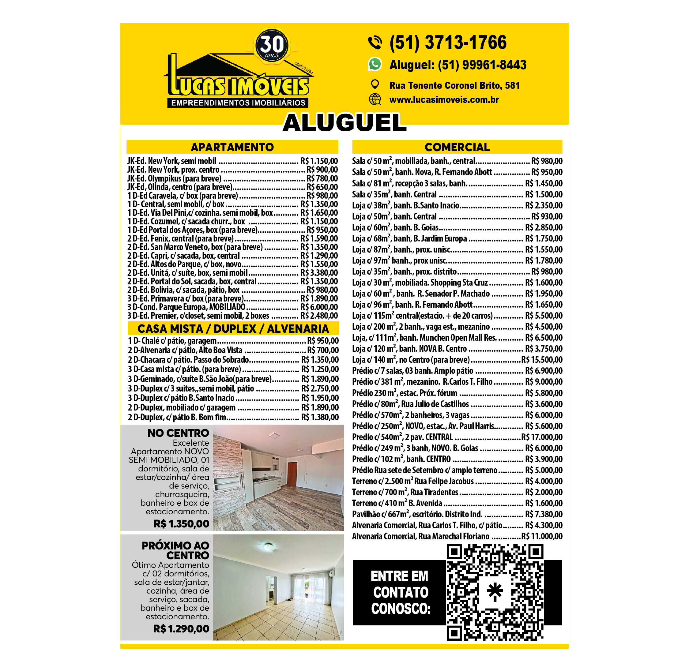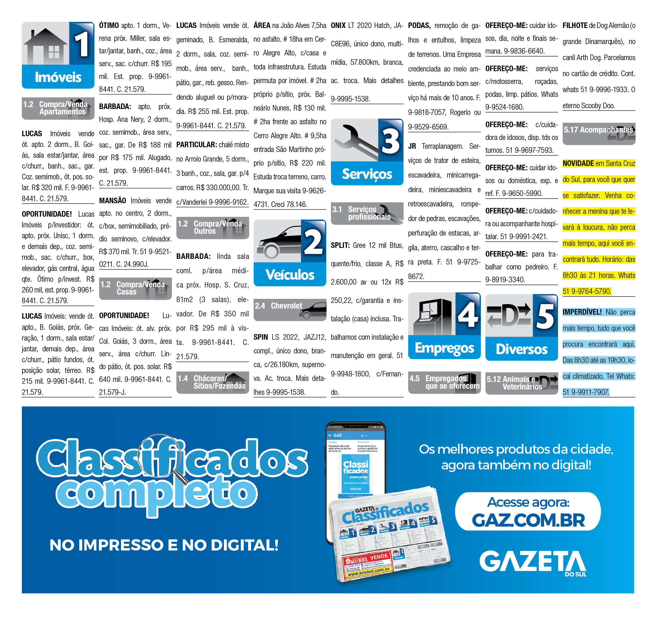 O suplemento de Classificados, que circula nas edições de terças, quintas e sábados, é um dos mais tradicionais da Gazeta do Sul, como vitrine e canal de negócios, de oferta, compra e venda em toda a região central do Rio Grande do Sul. E, para enriquecer pesquisas de produtos e serviços e possibilitar resultado ainda melhor a usuários e parceiros, nos anúncios de clientes cadastrados, o leitor tem acesso direto com link ao site do anunciante, onde poderá verificar mais detalhes sobre os itens. Confira as ofertas:
