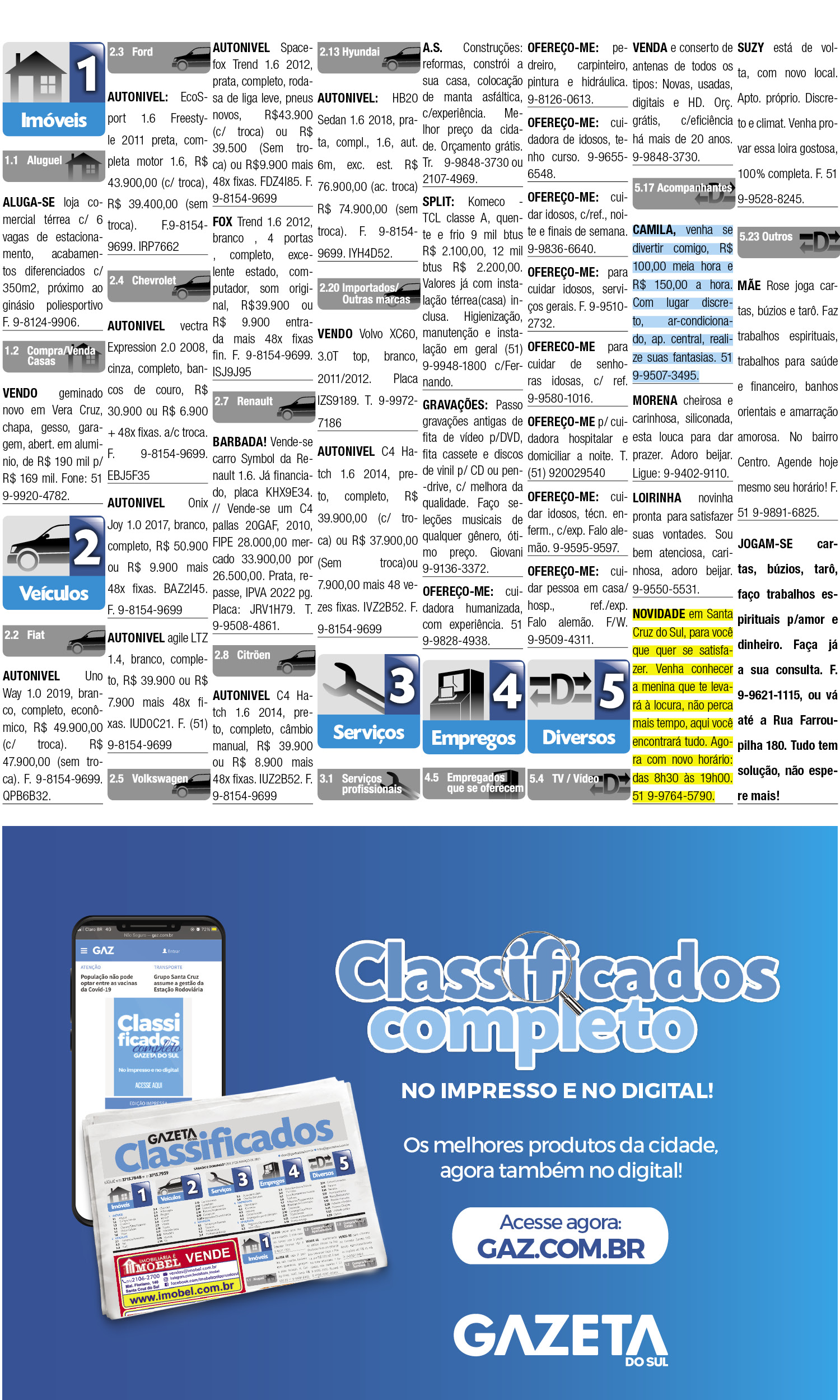 O suplemento de Classificados, que circula nas edições de terças, quintas e sábados, é um dos mais tradicionais da Gazeta do Sul, como vitrine e canal de negócios, de oferta, compra e venda em toda a região central do Rio Grande do Sul. E, para enriquecer pesquisas de produtos e serviços e possibilitar resultado ainda melhor a usuários e parceiros, nos anúncios de clientes cadastrados, o leitor tem acesso direto com link ao site do anunciante, onde poderá verificar mais detalhes sobre os itens. Confira as ofertas: