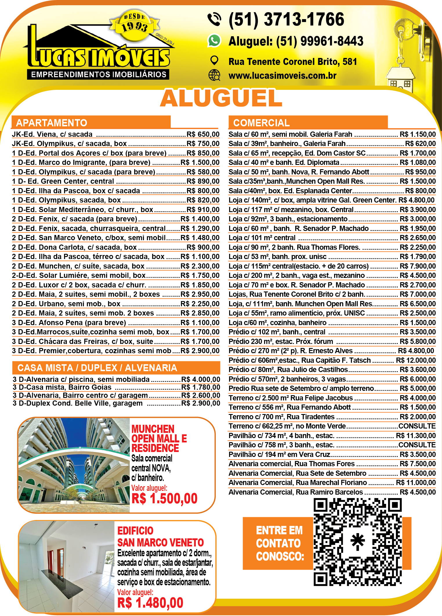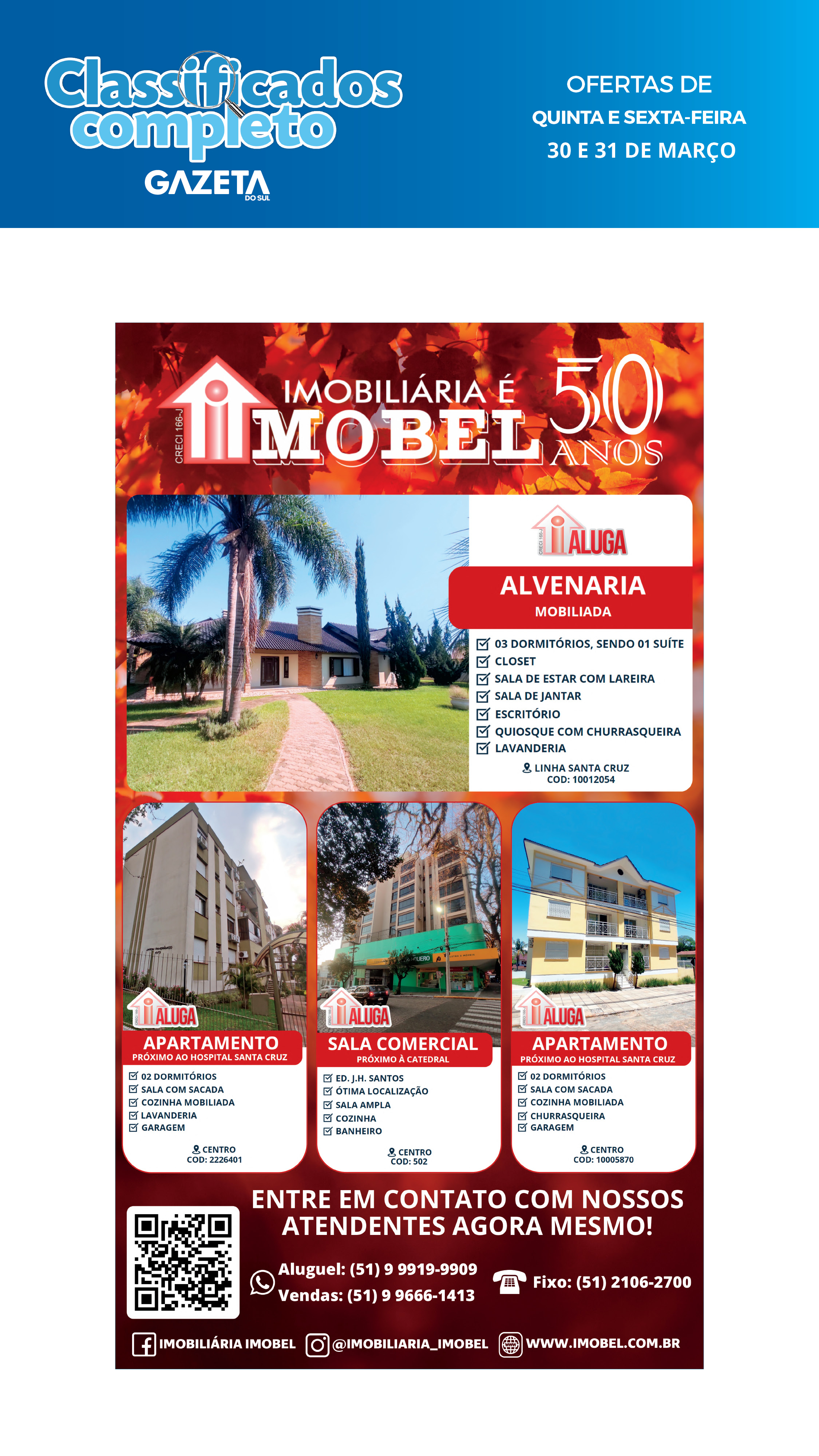 O suplemento de Classificados, que circula nas edições de terças, quintas e sábados, é um dos mais tradicionais da Gazeta do Sul, como vitrine e canal de negócios, de oferta, compra e venda em toda a região central do Rio Grande do Sul. E, para enriquecer pesquisas de produtos e serviços e possibilitar resultado ainda melhor a usuários e parceiros, nos anúncios de clientes cadastrados, o leitor tem acesso direto com link ao site do anunciante, onde poderá verificar mais detalhes sobre os itens. Confira as ofertas: