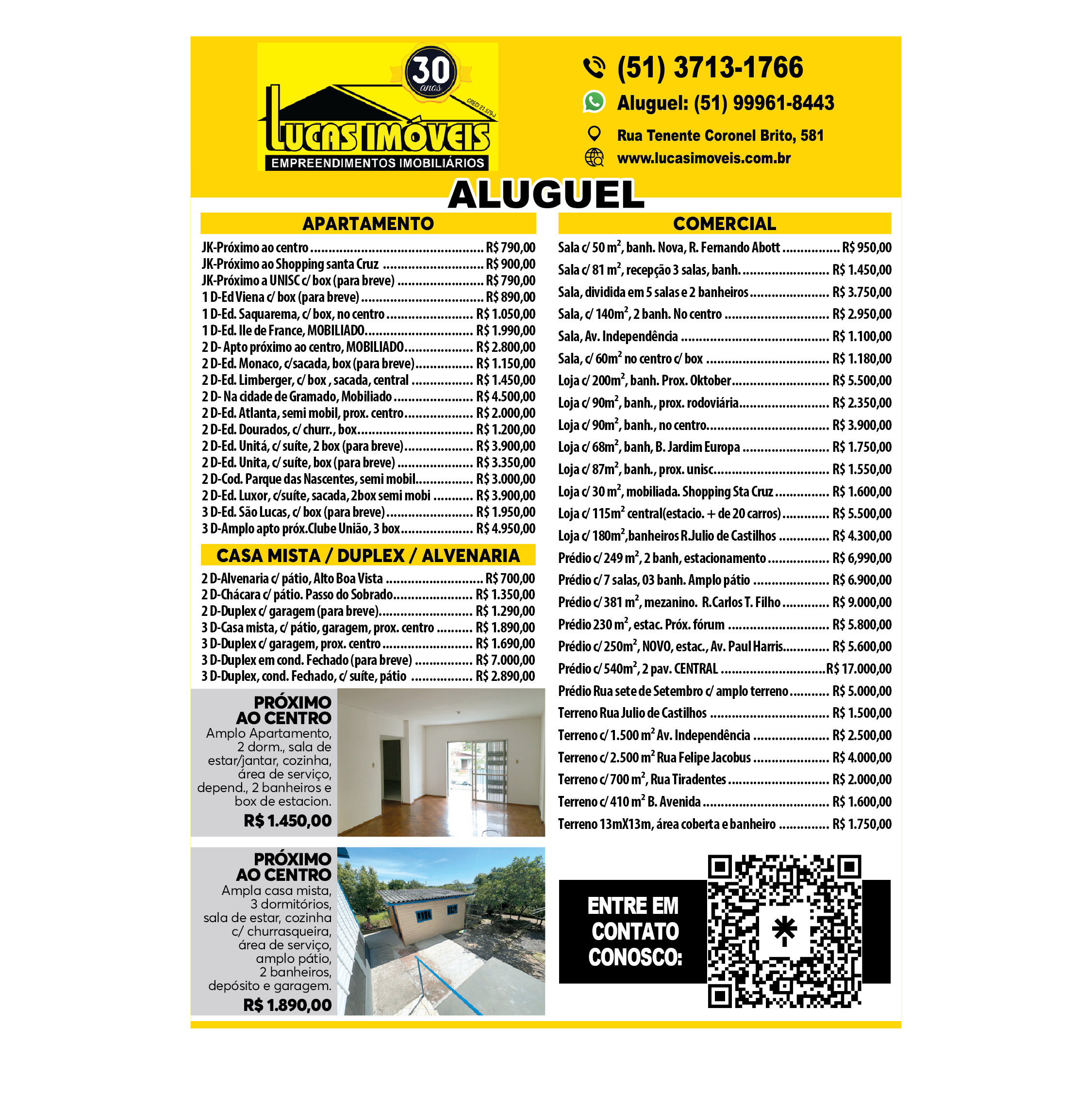 O suplemento de Classificados, que circula nas edições de terças, quintas e sábados, é um dos mais tradicionais da Gazeta do Sul, como vitrine e canal de negócios, de oferta, compra e venda em toda a região central do Rio Grande do Sul. E, para enriquecer pesquisas de produtos e serviços e possibilitar resultado ainda melhor a usuários e parceiros, nos anúncios de clientes cadastrados, o leitor tem acesso direto com link ao site do anunciante, onde poderá verificar mais detalhes sobre os itens. Confira as ofertas: