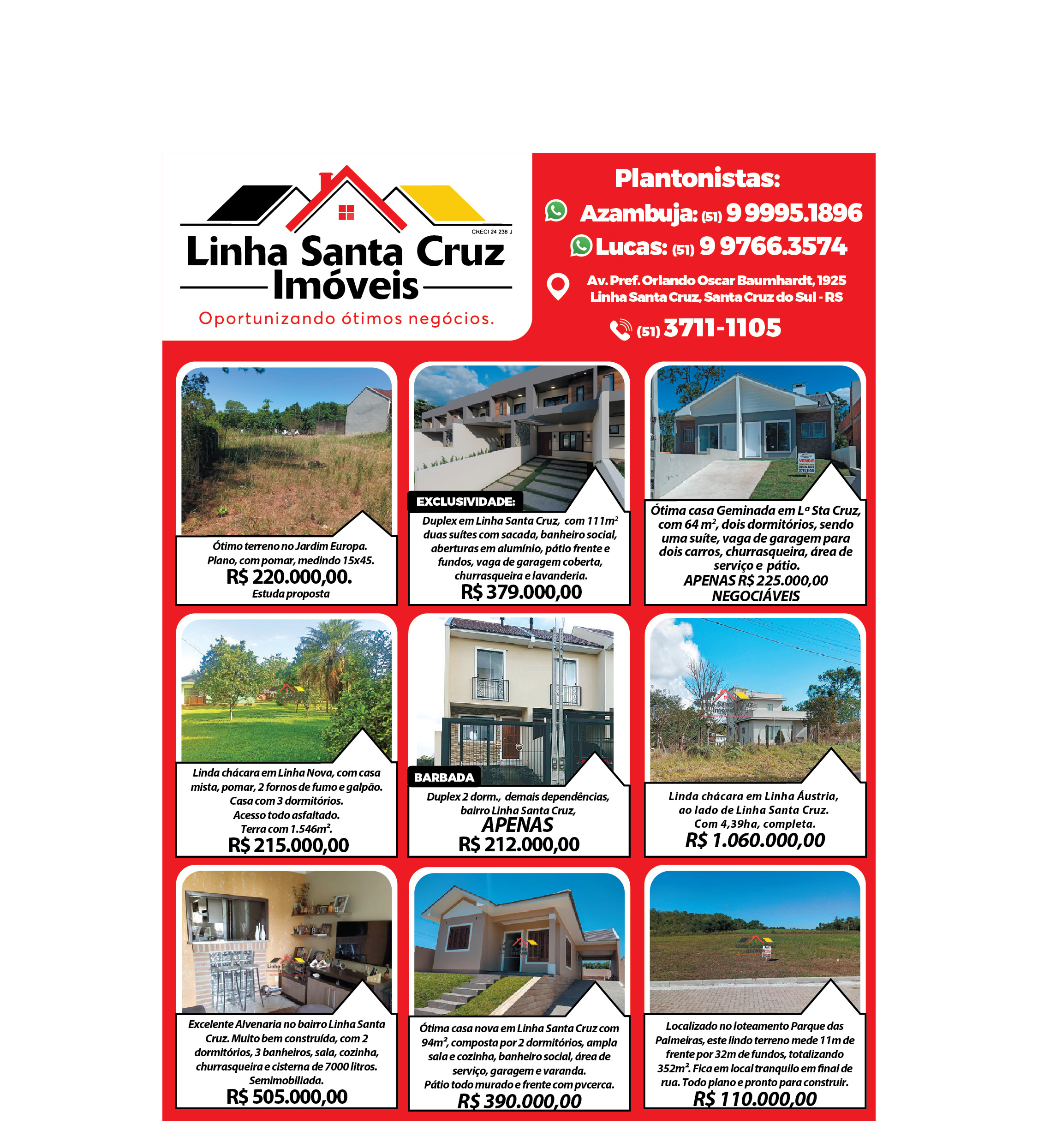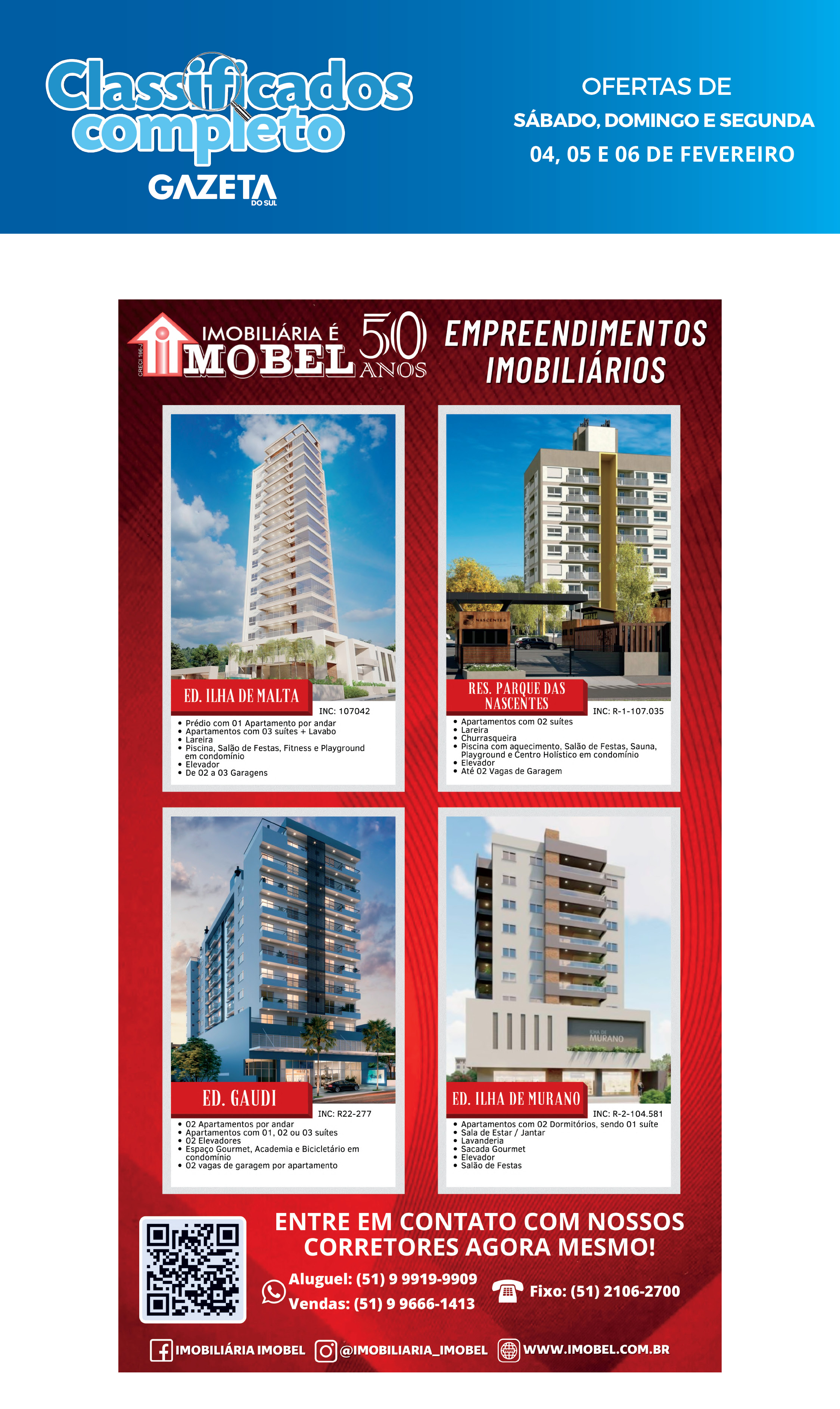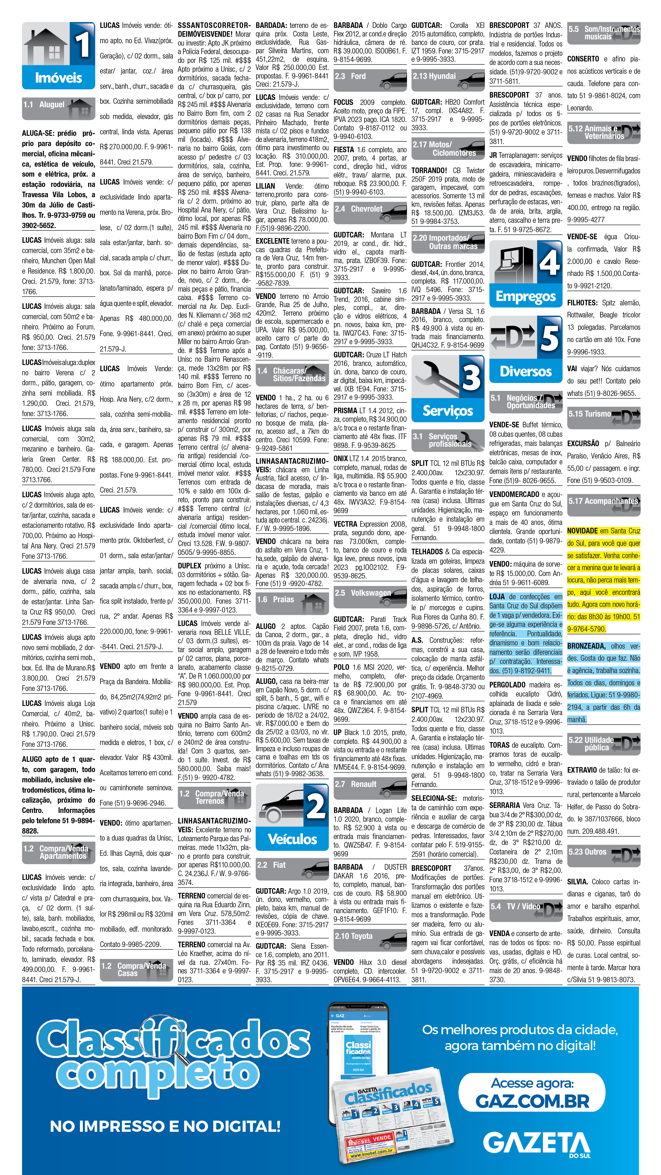 O suplemento de Classificados, que circula nas edições de terças, quintas e sábados, é um dos mais tradicionais da Gazeta do Sul, como vitrine e canal de negócios, de oferta, compra e venda em toda a região central do Rio Grande do Sul. E, para enriquecer pesquisas de produtos e serviços e possibilitar resultado ainda melhor a usuários e parceiros, nos anúncios de clientes cadastrados, o leitor tem acesso direto com link ao site do anunciante, onde poderá verificar mais detalhes sobre os itens. Confira as ofertas: