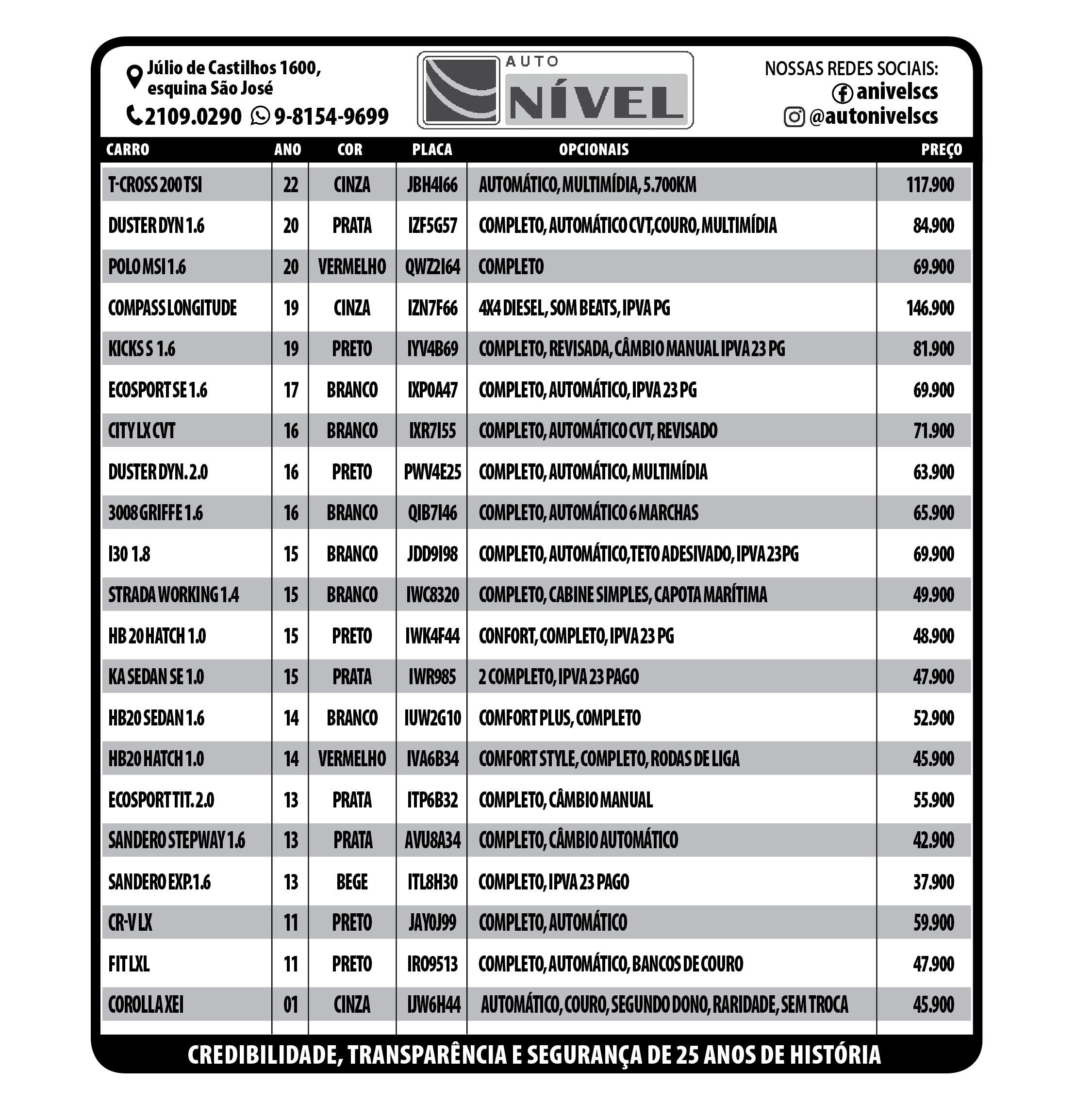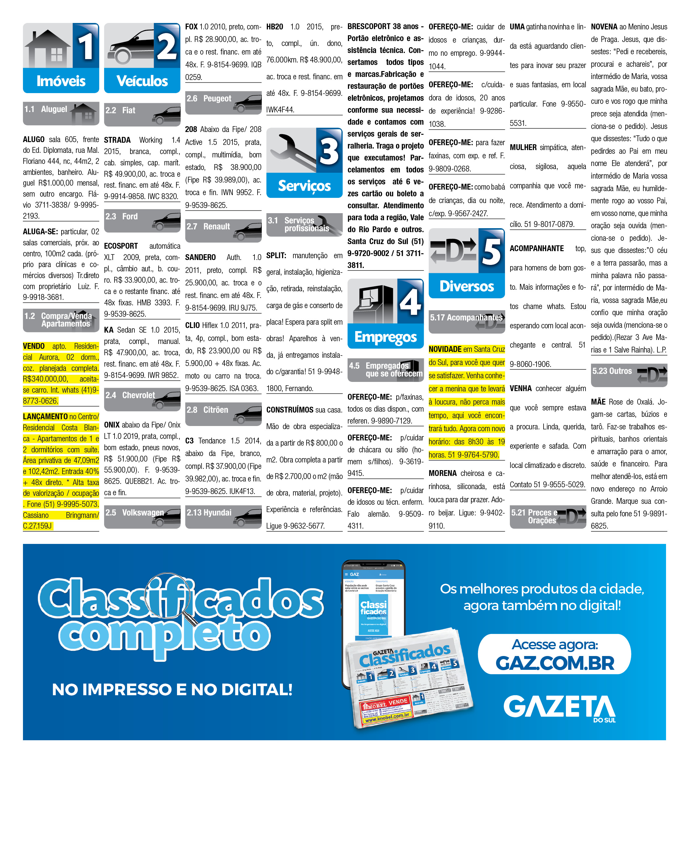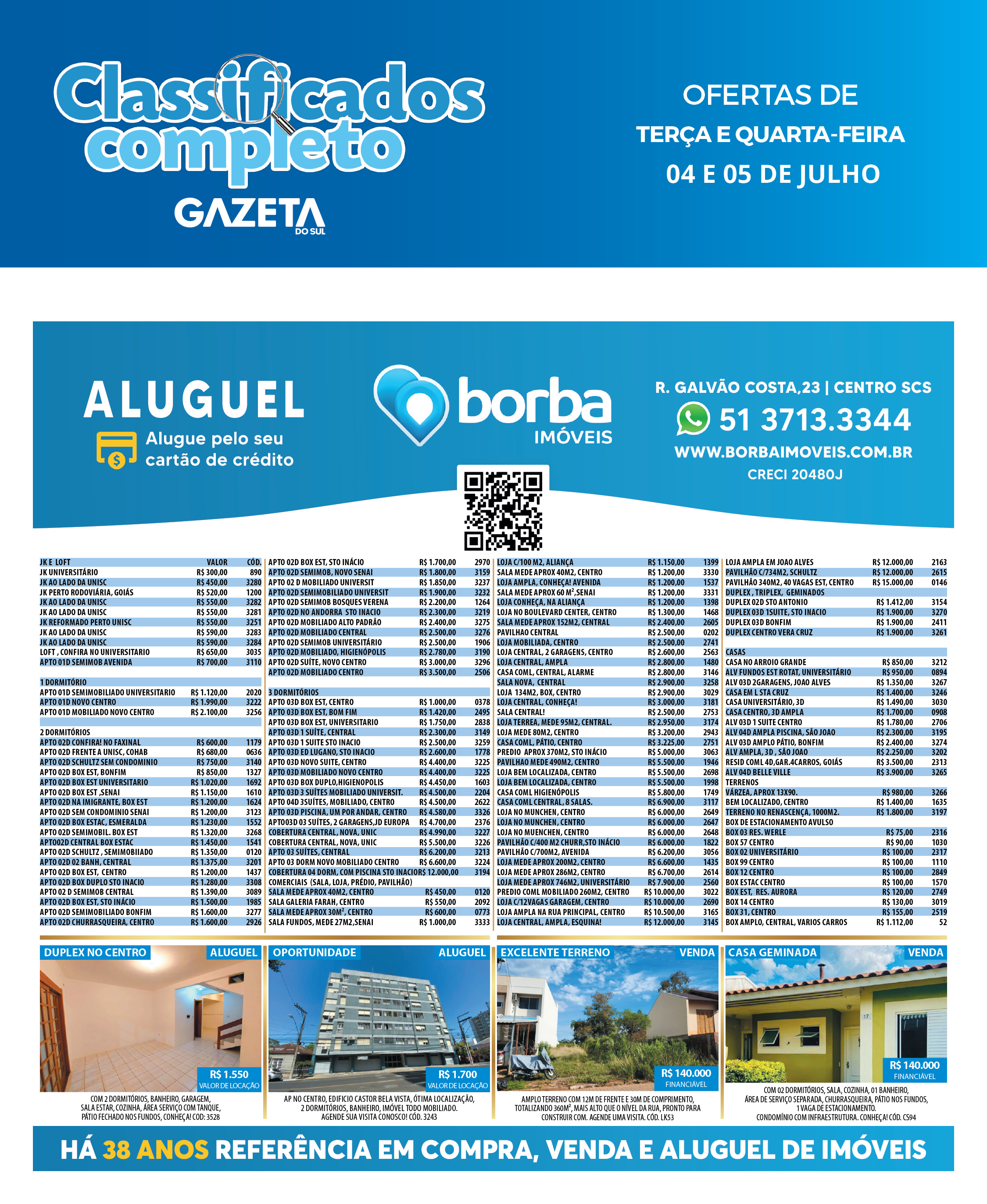O suplemento de Classificados, que circula nas edições de terças, quintas e sábados, é um dos mais tradicionais da Gazeta do Sul, como vitrine e canal de negócios, de oferta, compra e venda em toda a região central do Rio Grande do Sul. E, para enriquecer pesquisas de produtos e serviços e possibilitar resultado ainda melhor a usuários e parceiros, nos anúncios de clientes cadastrados, o leitor tem acesso direto com link ao site do anunciante, onde poderá verificar mais detalhes sobre os itens. Confira as ofertas: