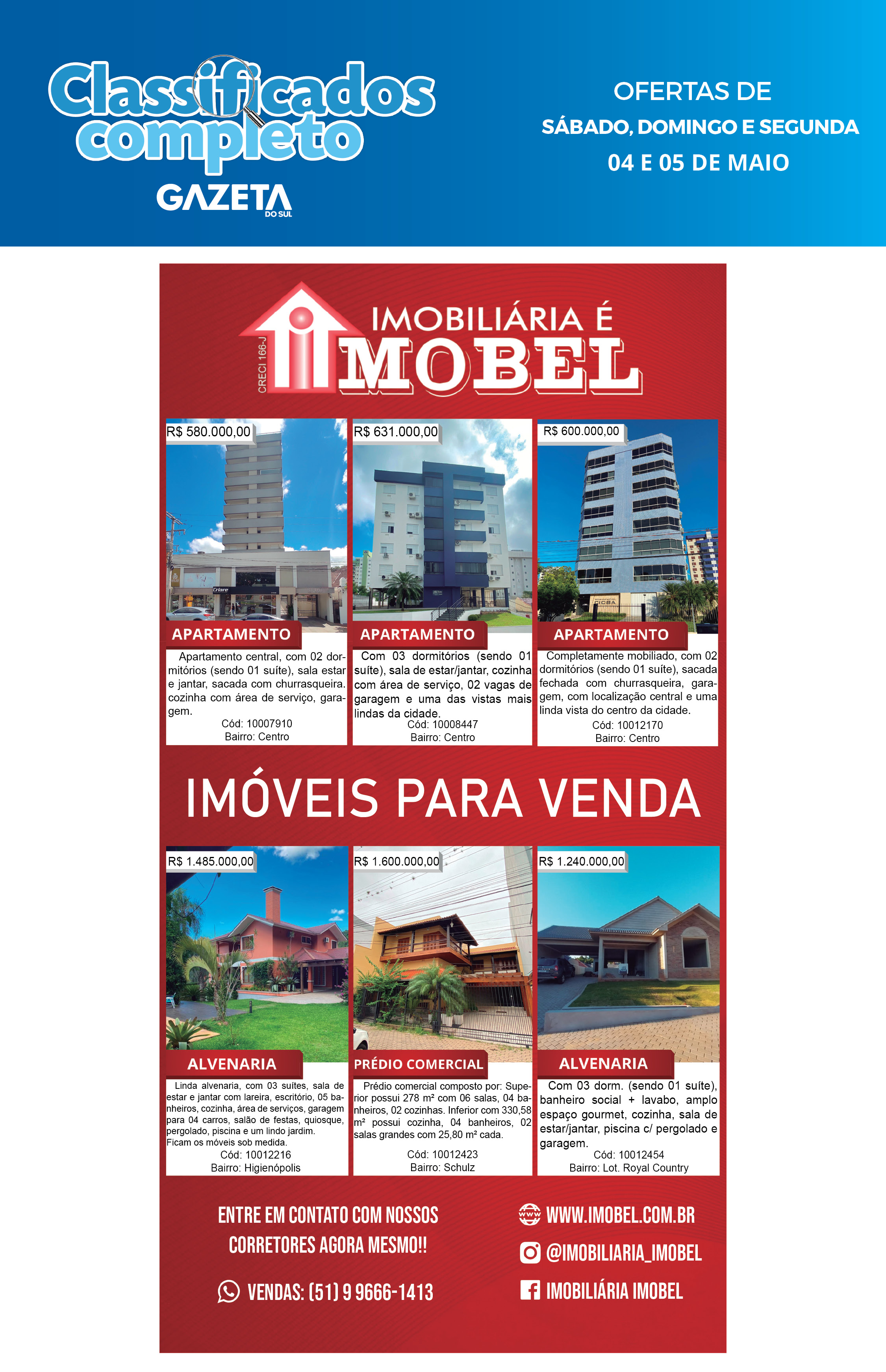 O suplemento de Classificados, que circula nas edições de terças, quintas e sábados, é um dos mais tradicionais da Gazeta do Sul, como vitrine e canal de negócios, de oferta, compra e venda em toda a região central do Rio Grande do Sul. E, para enriquecer pesquisas de produtos e serviços e possibilitar resultado ainda melhor a usuários e parceiros, nos anúncios de clientes cadastrados, o leitor tem acesso direto com link ao site do anunciante, onde poderá verificar mais detalhes sobre os itens. Confira as ofertas: