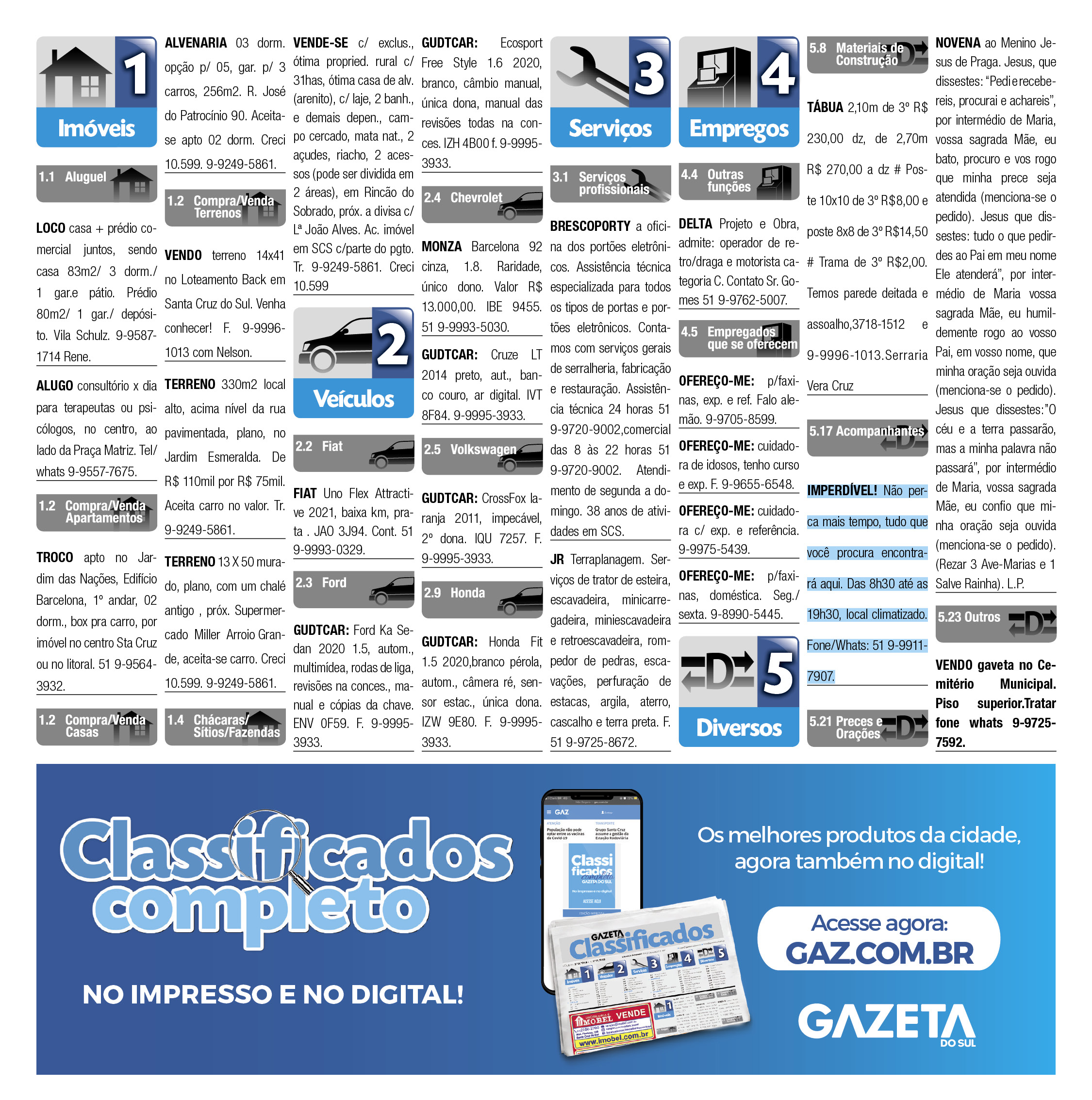 O suplemento de Classificados, que circula nas edições de terças, quintas e sábados, é um dos mais tradicionais da Gazeta do Sul, como vitrine e canal de negócios, de oferta, compra e venda em toda a região central do Rio Grande do Sul. E, para enriquecer pesquisas de produtos e serviços e possibilitar resultado ainda melhor a usuários e parceiros, nos anúncios de clientes cadastrados, o leitor tem acesso direto com link ao site do anunciante, onde poderá verificar mais detalhes sobre os itens. Confira as ofertas: