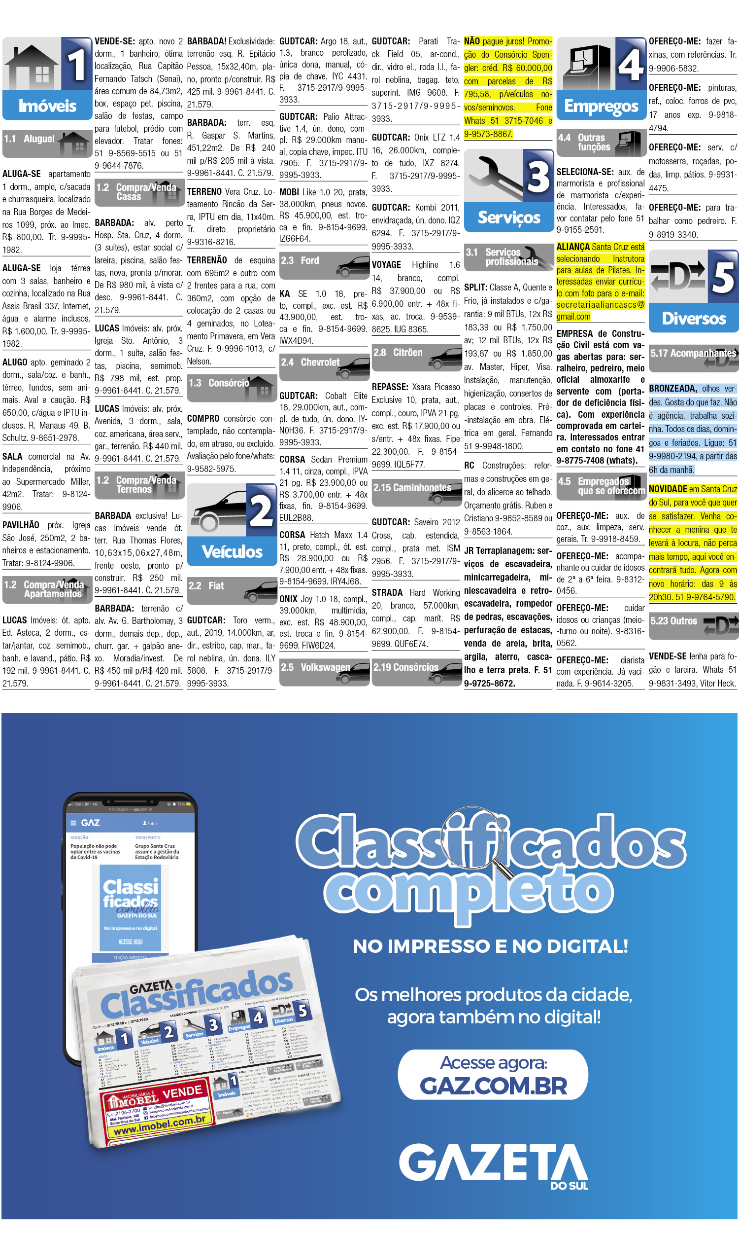 O suplemento de Classificados, que circula nas edições de terças, quintas e sábados, é um dos mais tradicionais da Gazeta do Sul, como vitrine e canal de negócios, de oferta, compra e venda em toda a região central do Rio Grande do Sul. E, para enriquecer pesquisas de produtos e serviços e possibilitar resultado ainda melhor a usuários e parceiros, nos anúncios de clientes cadastrados, o leitor tem acesso direto com link ao site do anunciante, onde poderá verificar mais detalhes sobre os itens. Confira: