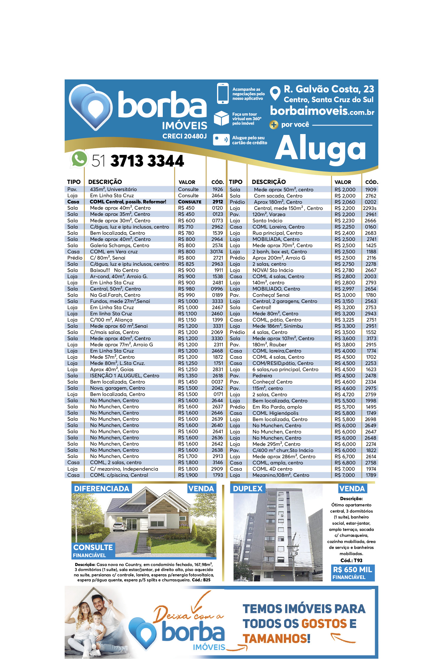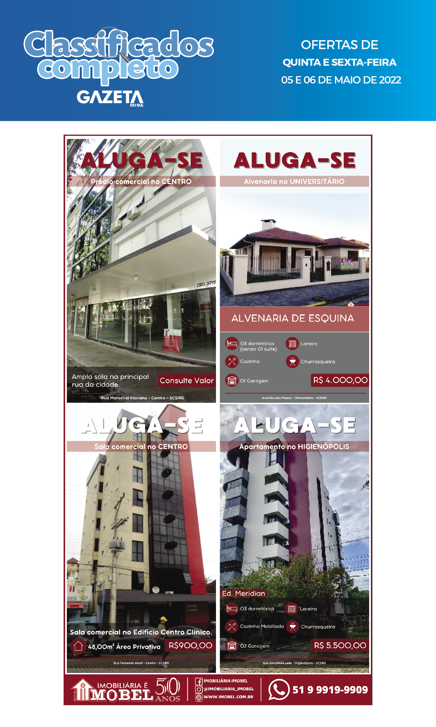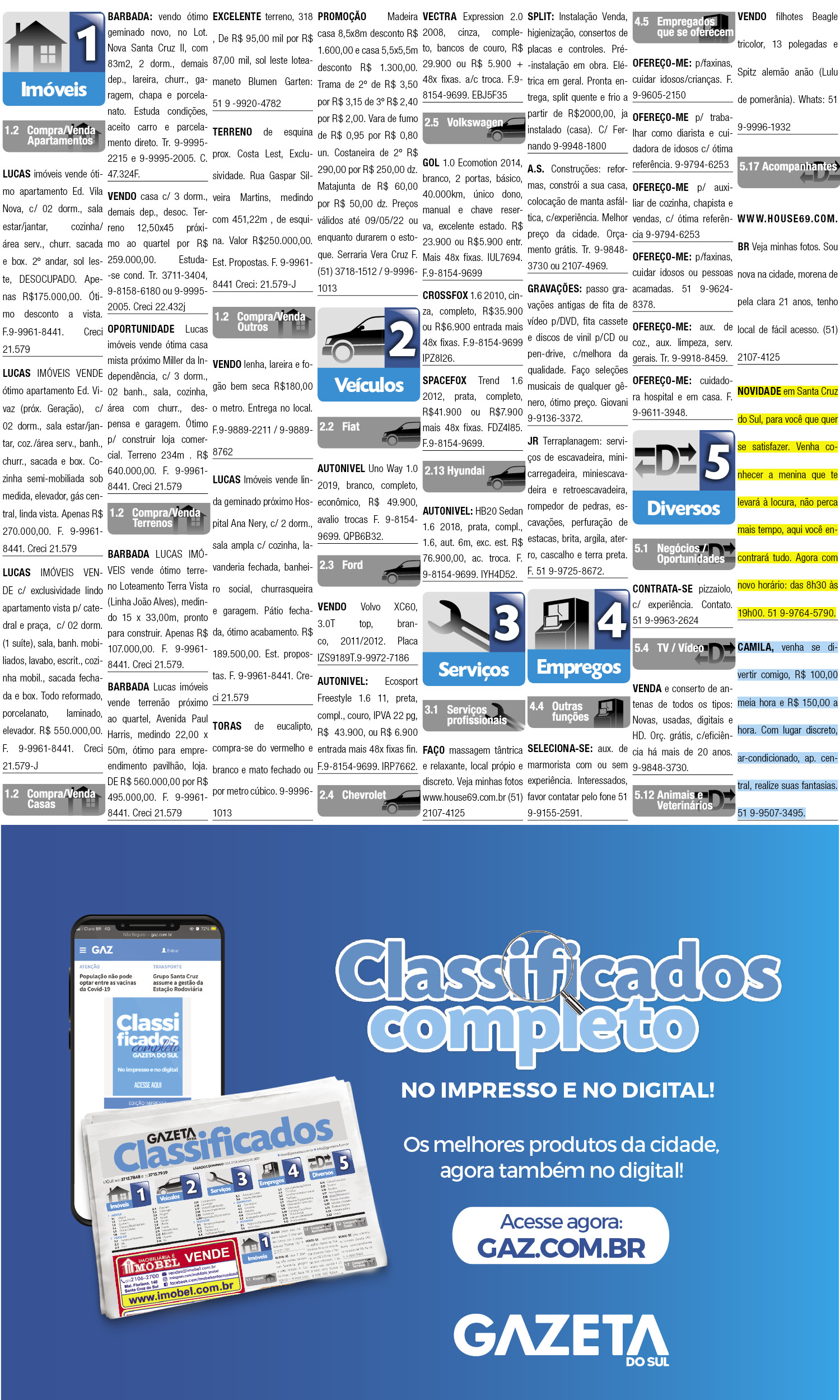 O suplemento de Classificados, que circula nas edições de terças, quintas e sábados, é um dos mais tradicionais da Gazeta do Sul, como vitrine e canal de negócios, de oferta, compra e venda em toda a região central do Rio Grande do Sul. E, para enriquecer pesquisas de produtos e serviços e possibilitar resultado ainda melhor a usuários e parceiros, nos anúncios de clientes cadastrados, o leitor tem acesso direto com link ao site do anunciante, onde poderá verificar mais detalhes sobre os itens. Confira as ofertas: