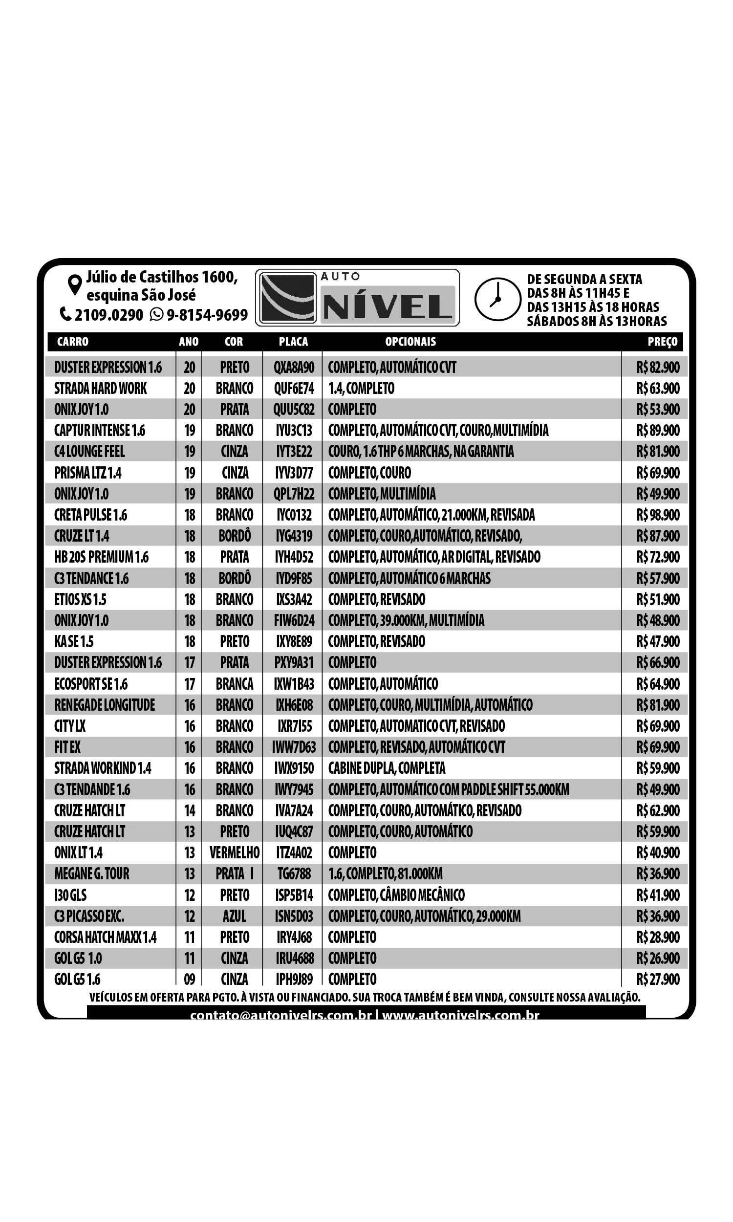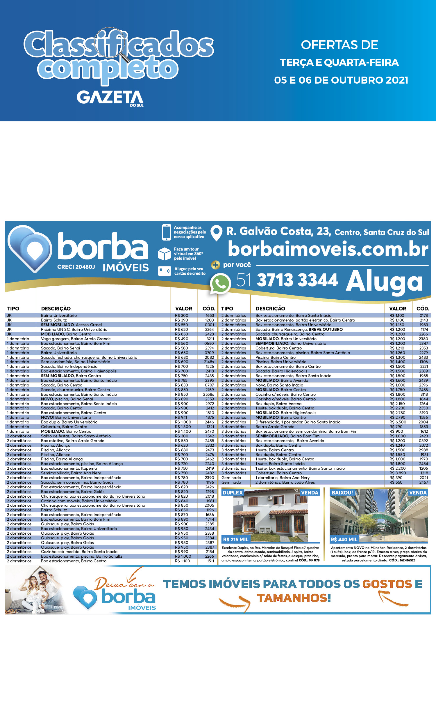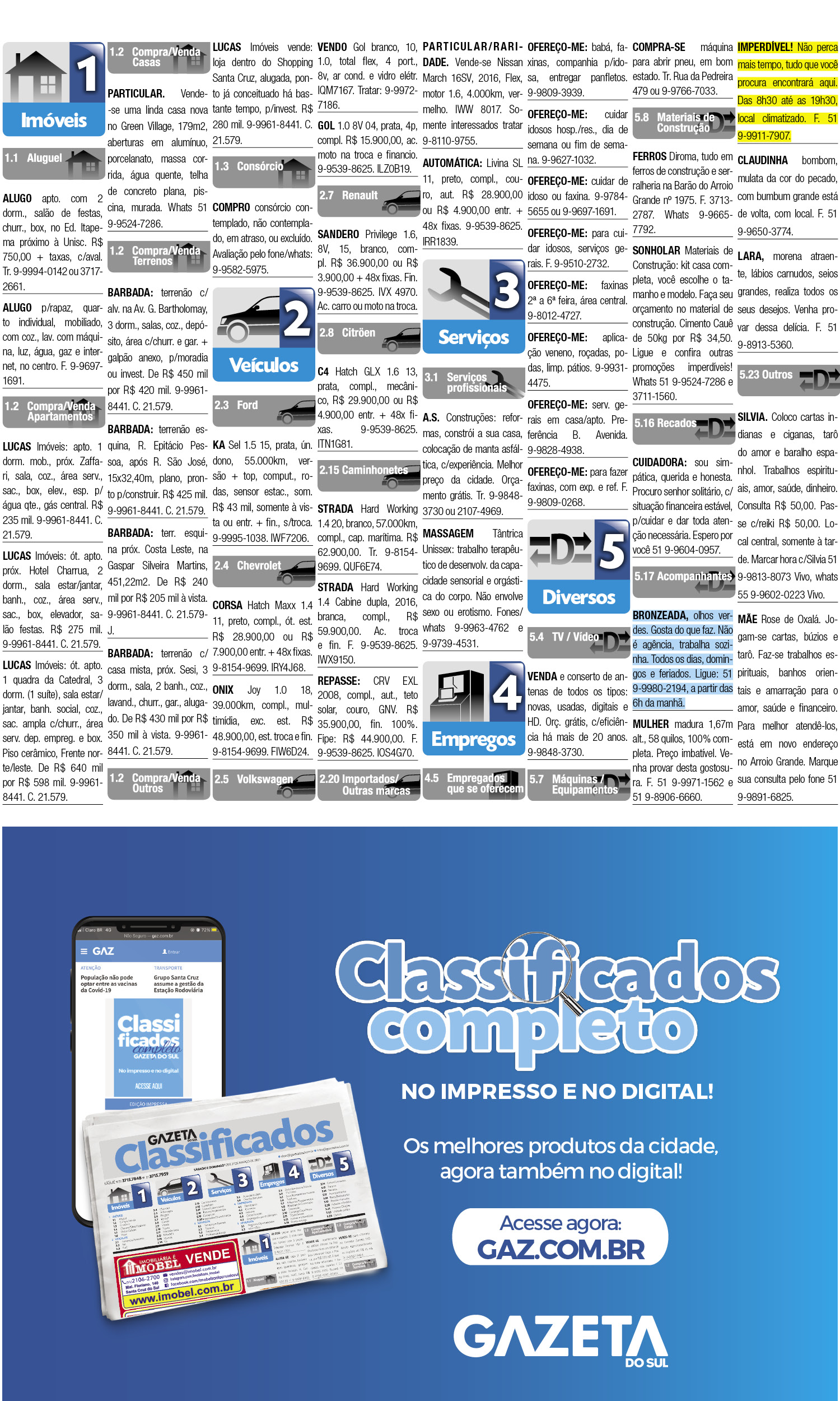 O suplemento de Classificados, que circula nas edições de terças, quintas e sábados, é um dos mais tradicionais da Gazeta do Sul, como vitrine e canal de negócios, de oferta, compra e venda em toda a região central do Rio Grande do Sul. E, para enriquecer pesquisas de produtos e serviços e possibilitar resultado ainda melhor a usuários e parceiros, nos anúncios de clientes cadastrados, o leitor tem acesso direto com link ao site do anunciante, onde poderá verificar mais detalhes sobre os itens. Confira as ofertas: