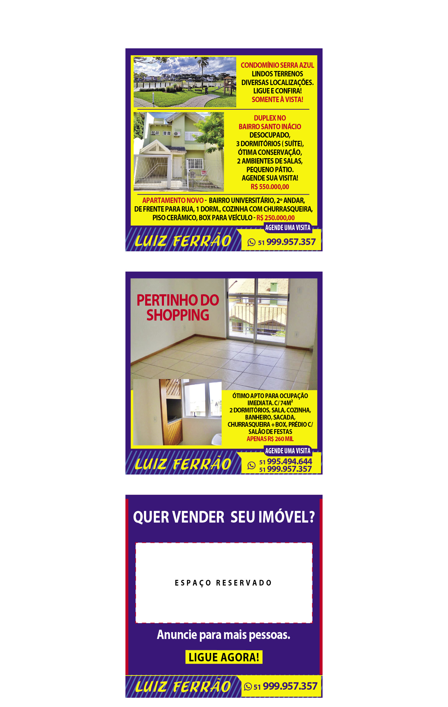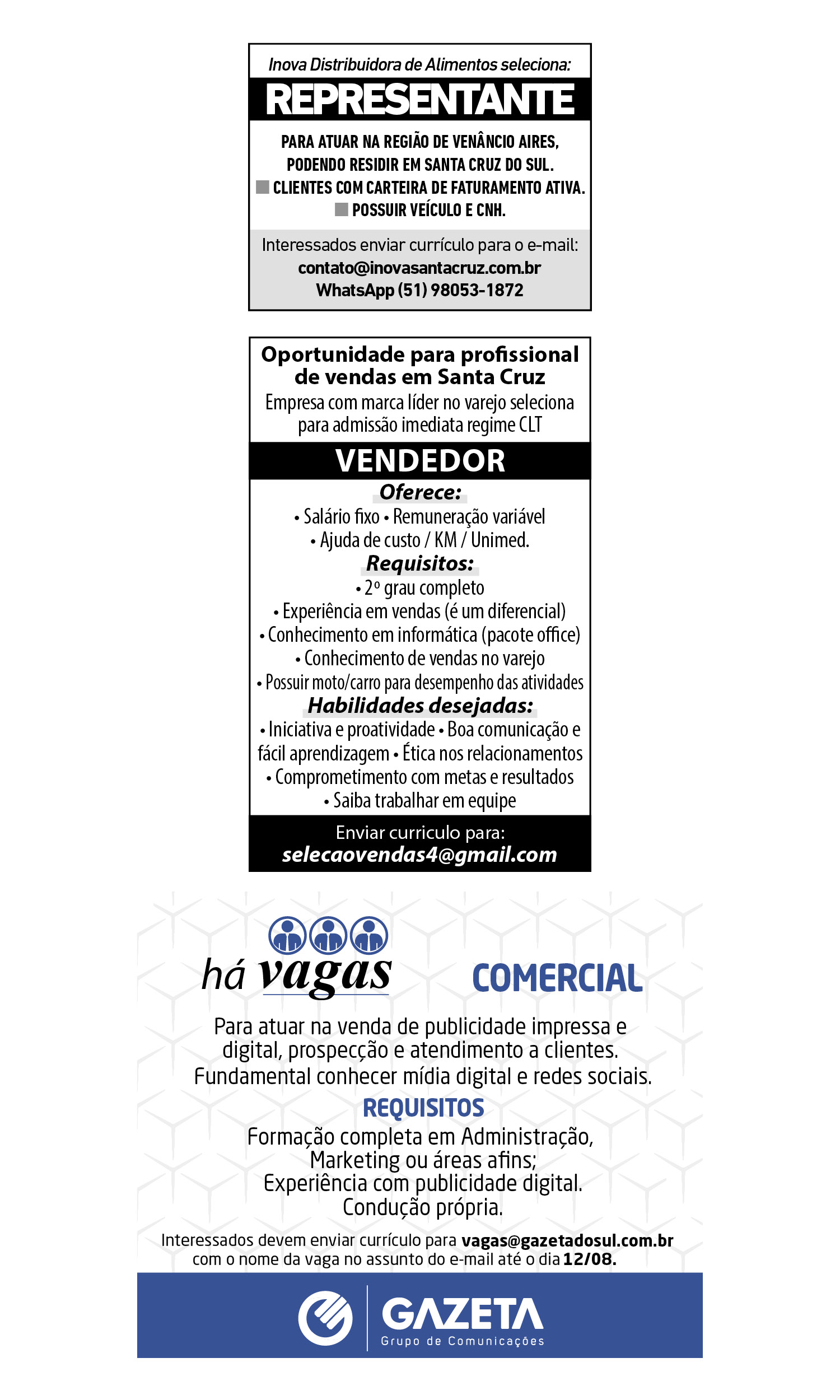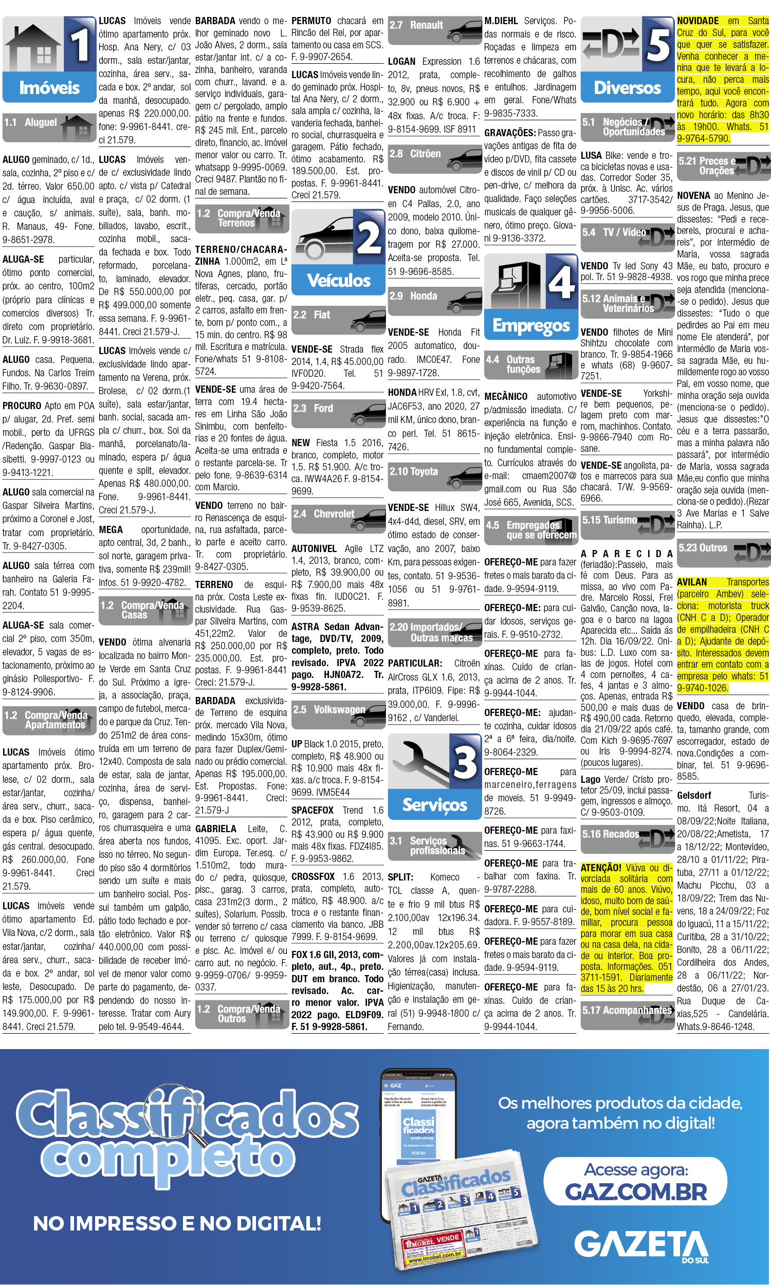 O suplemento de Classificados, que circula nas edições de terças, quintas e sábados, é um dos mais tradicionais da Gazeta do Sul, como vitrine e canal de negócios, de oferta, compra e venda em toda a região central do Rio Grande do Sul. E, para enriquecer pesquisas de produtos e serviços e possibilitar resultado ainda melhor a usuários e parceiros, nos anúncios de clientes cadastrados, o leitor tem acesso direto com link ao site do anunciante, onde poderá verificar mais detalhes sobre os itens. Confira as ofertas: