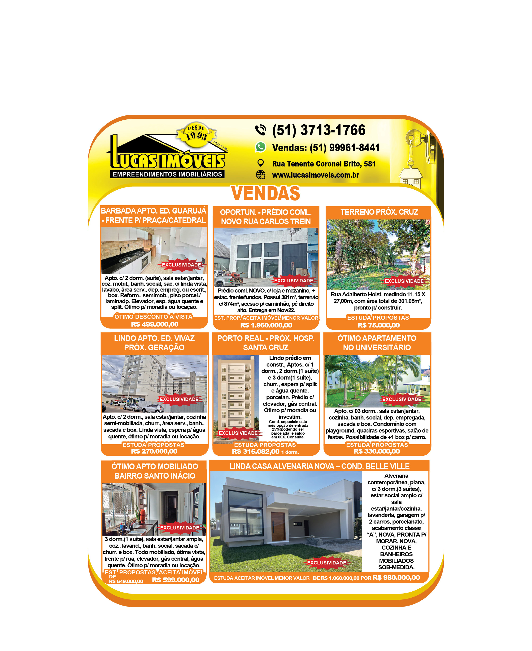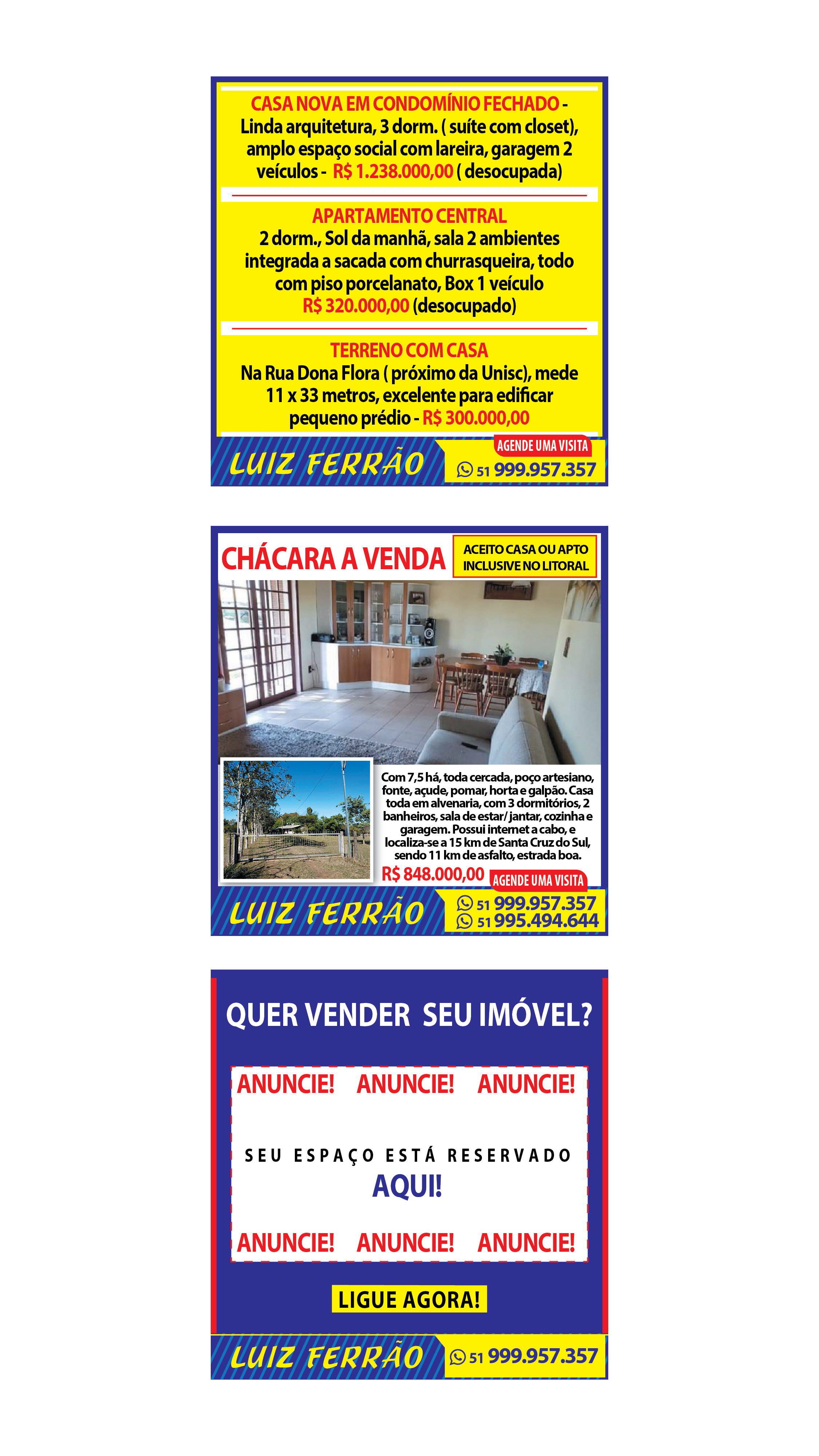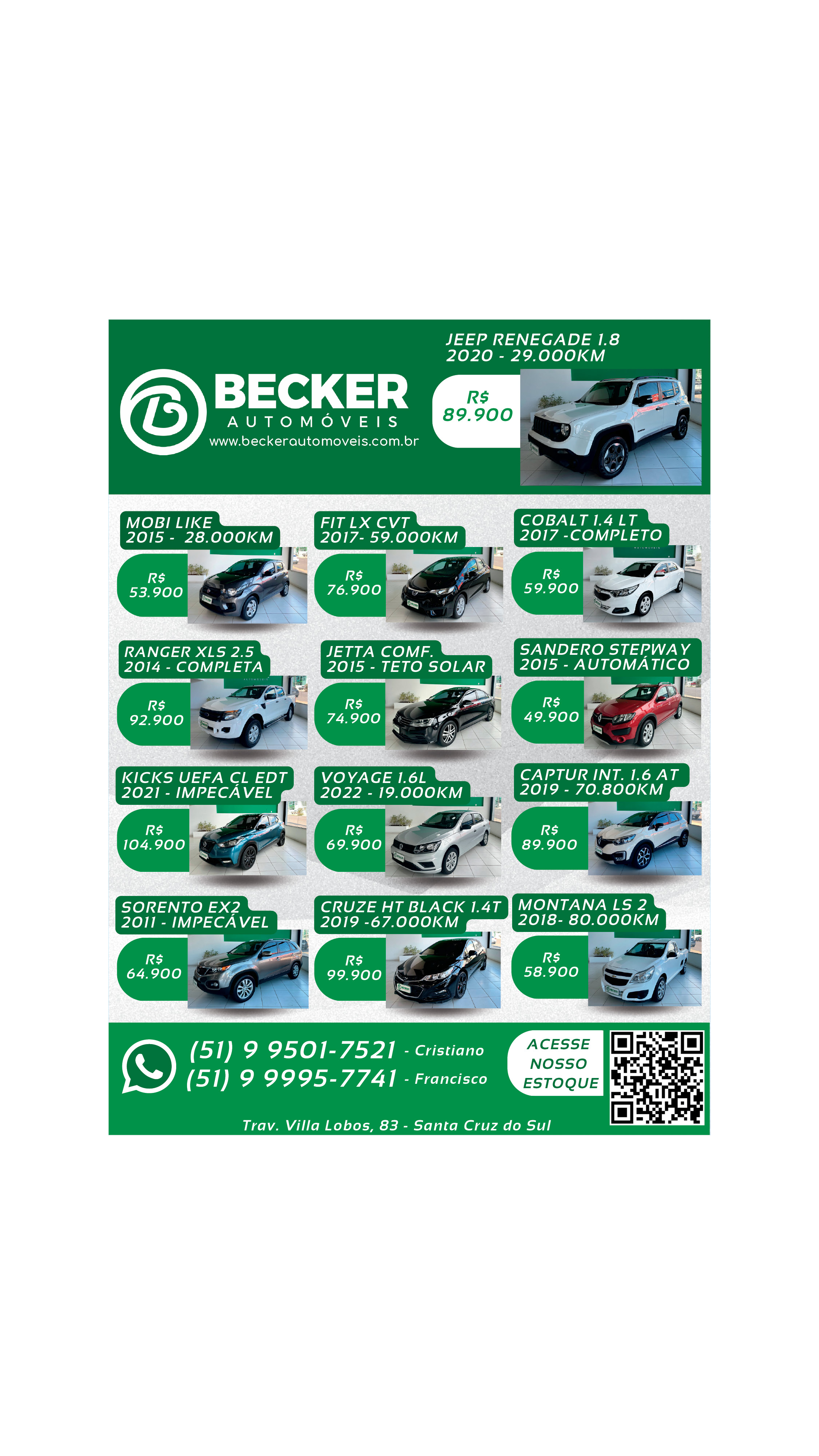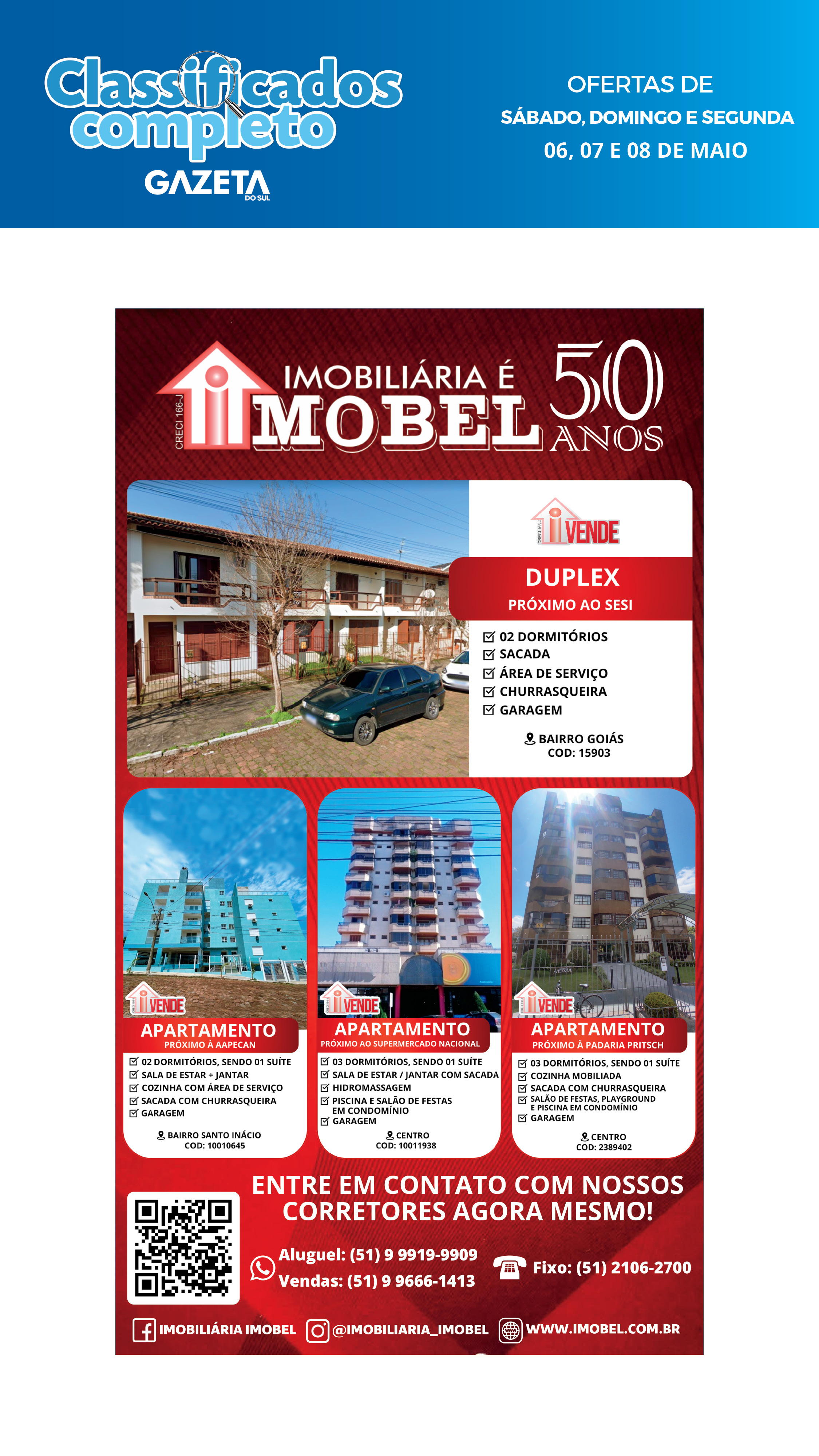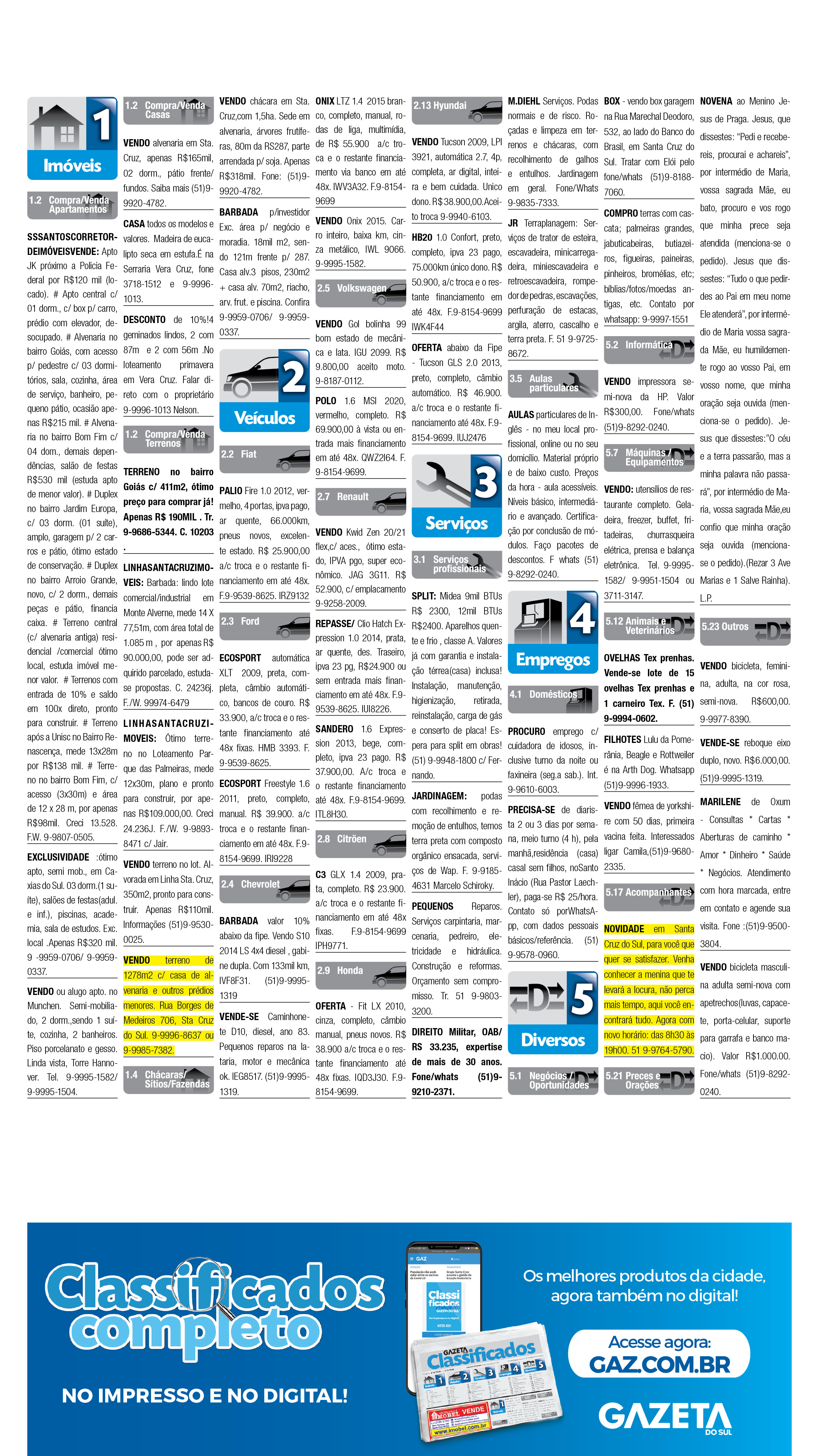 O suplemento de Classificados, que circula nas edições de terças, quintas e sábados, é um dos mais tradicionais da Gazeta do Sul, como vitrine e canal de negócios, de oferta, compra e venda em toda a região central do Rio Grande do Sul. E, para enriquecer pesquisas de produtos e serviços e possibilitar resultado ainda melhor a usuários e parceiros, nos anúncios de clientes cadastrados, o leitor tem acesso direto com link ao site do anunciante, onde poderá verificar mais detalhes sobre os itens. Confira as ofertas: