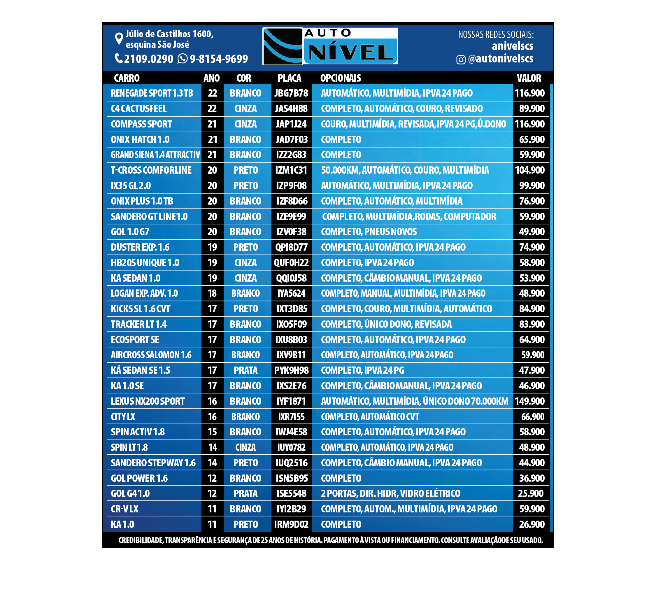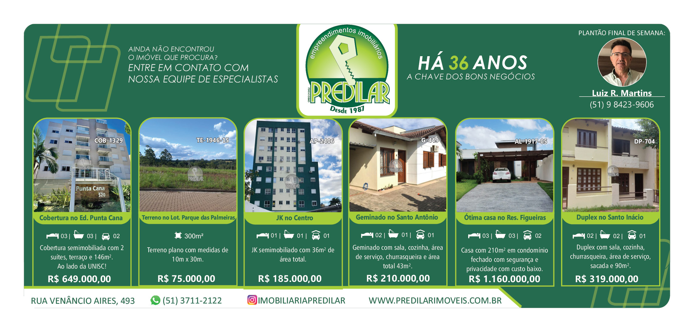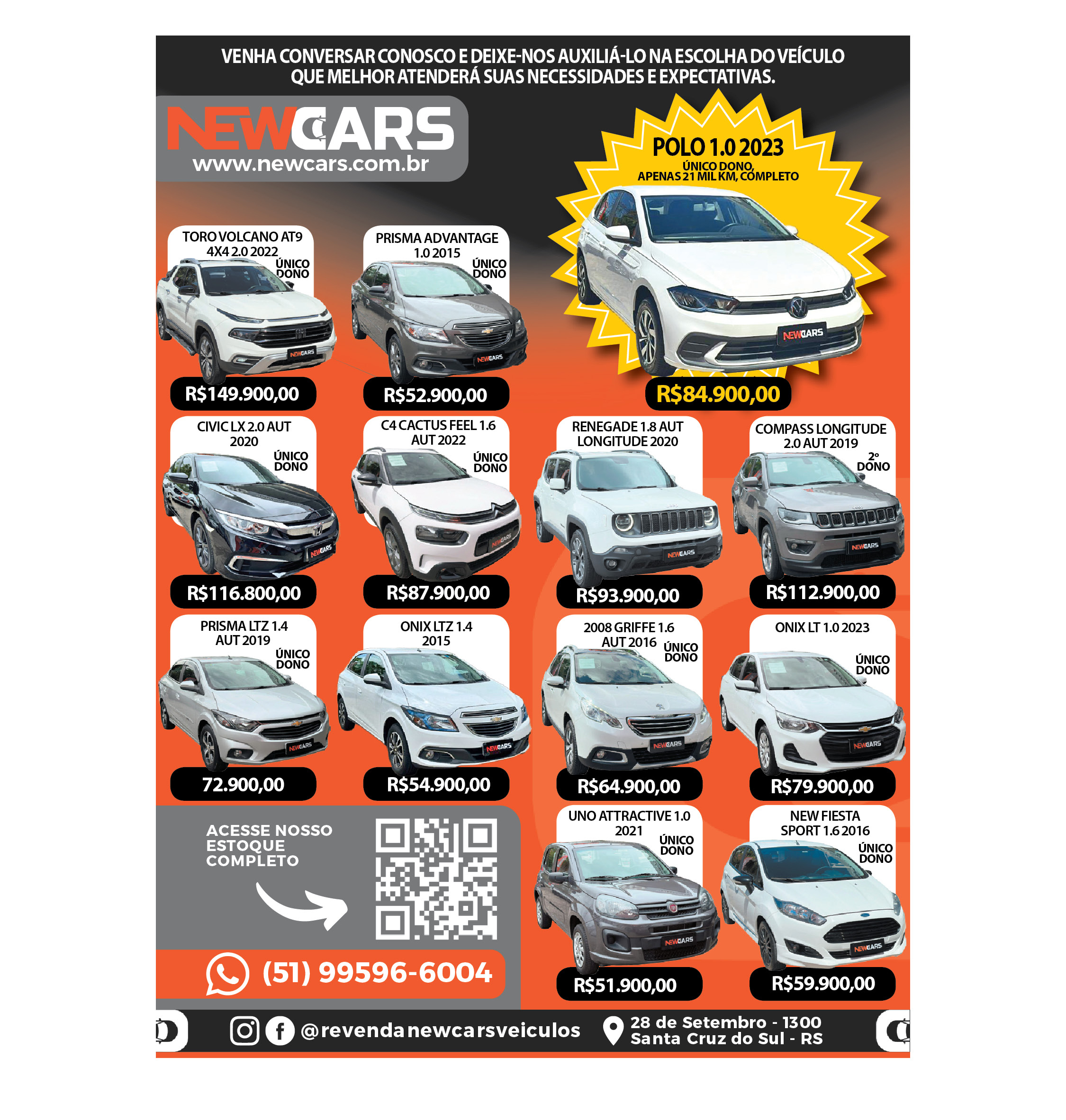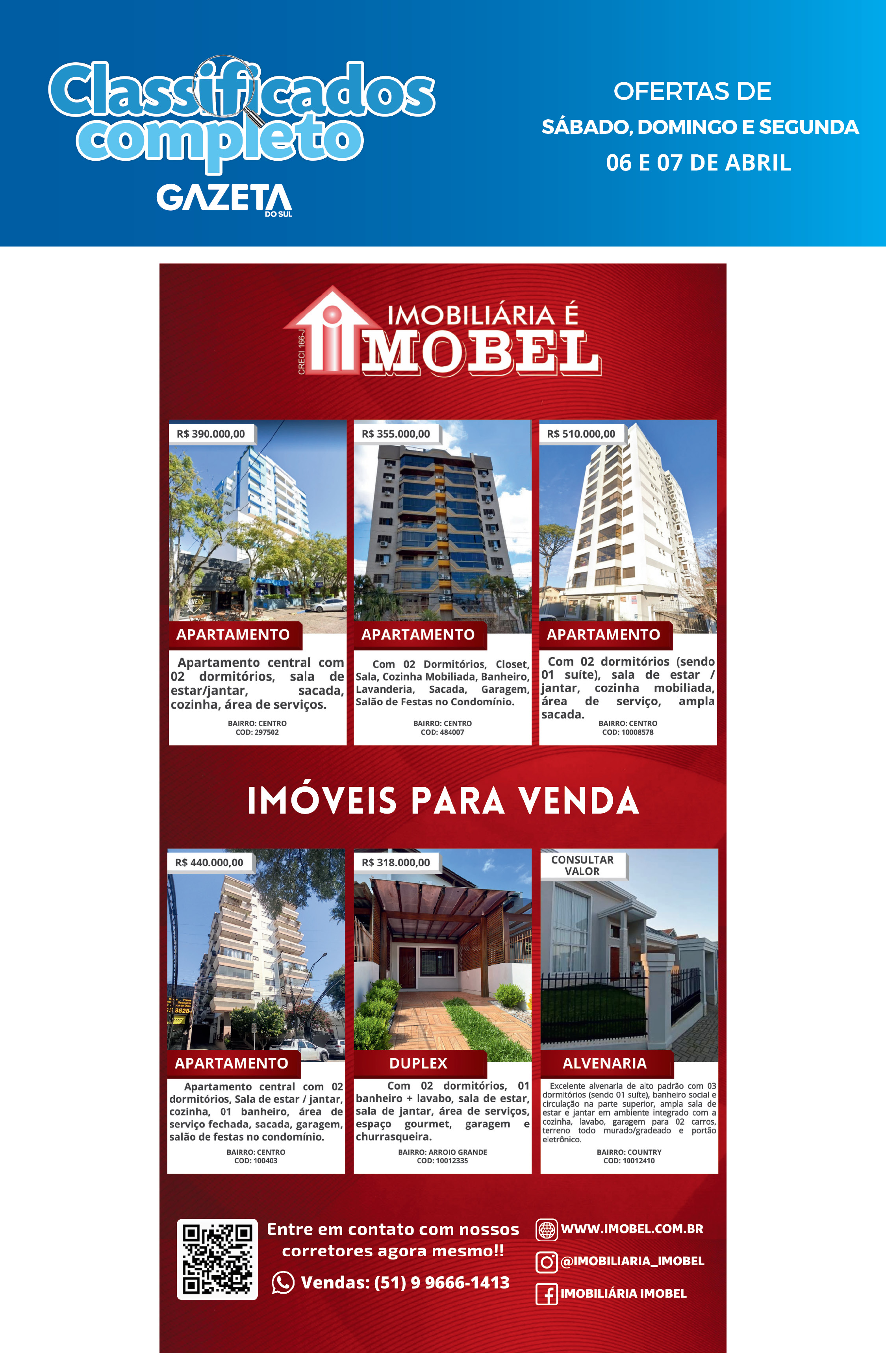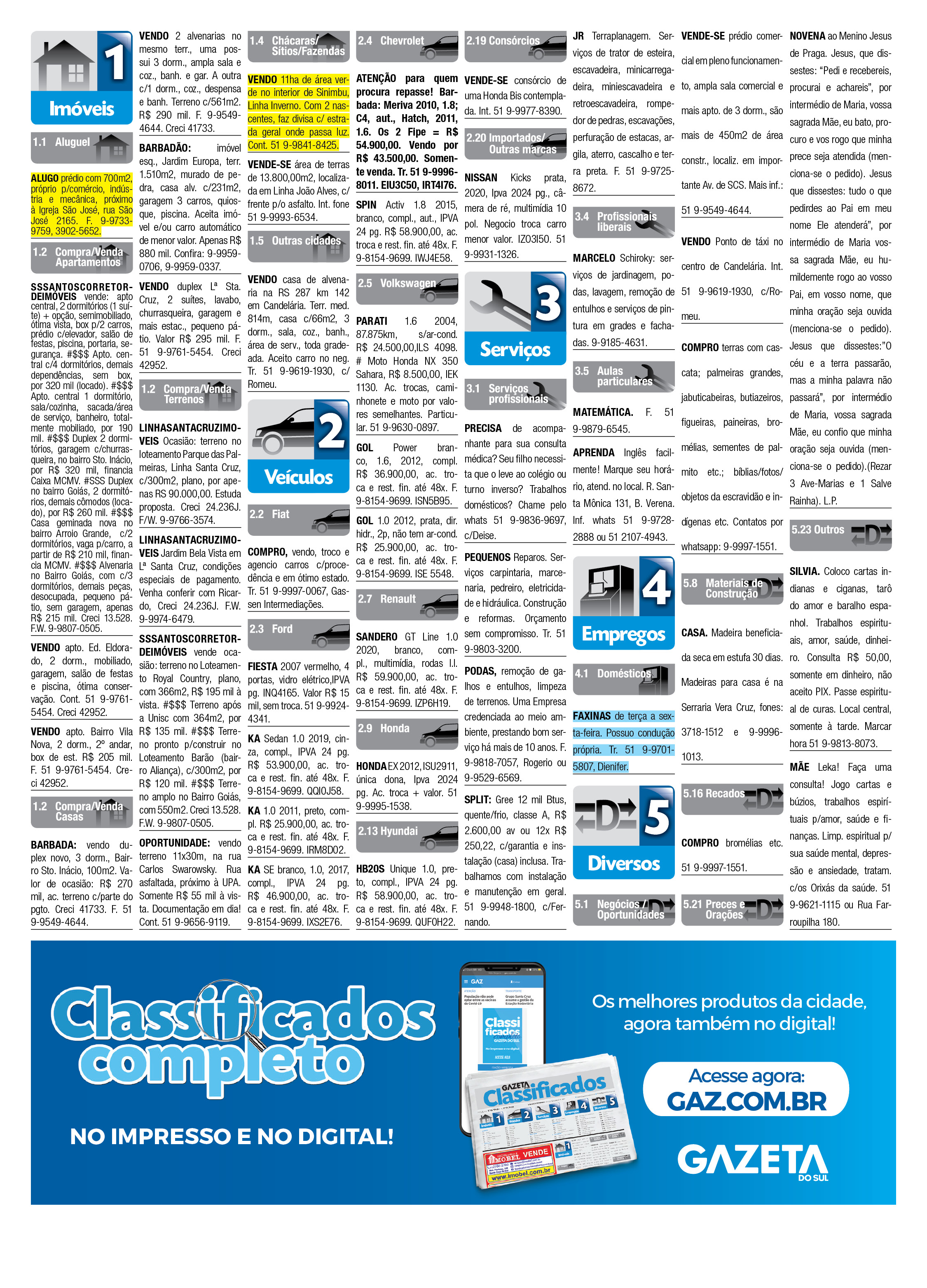 O suplemento de Classificados, que circula nas edições de terças, quintas e sábados, é um dos mais tradicionais da Gazeta do Sul, como vitrine e canal de negócios, de oferta, compra e venda em toda a região central do Rio Grande do Sul. E, para enriquecer pesquisas de produtos e serviços e possibilitar resultado ainda melhor a usuários e parceiros, nos anúncios de clientes cadastrados, o leitor tem acesso direto com link ao site do anunciante, onde poderá verificar mais detalhes sobre os itens. Confira as ofertas: