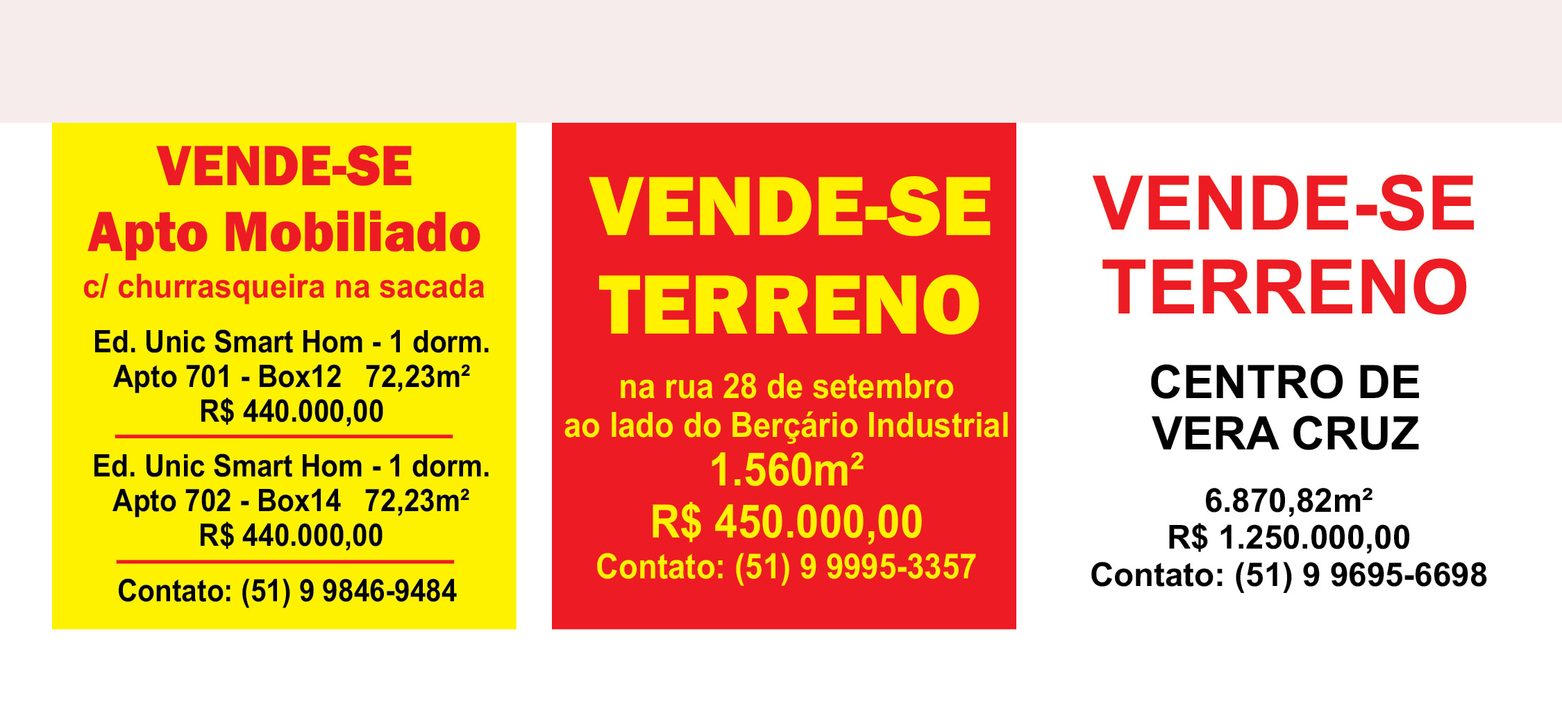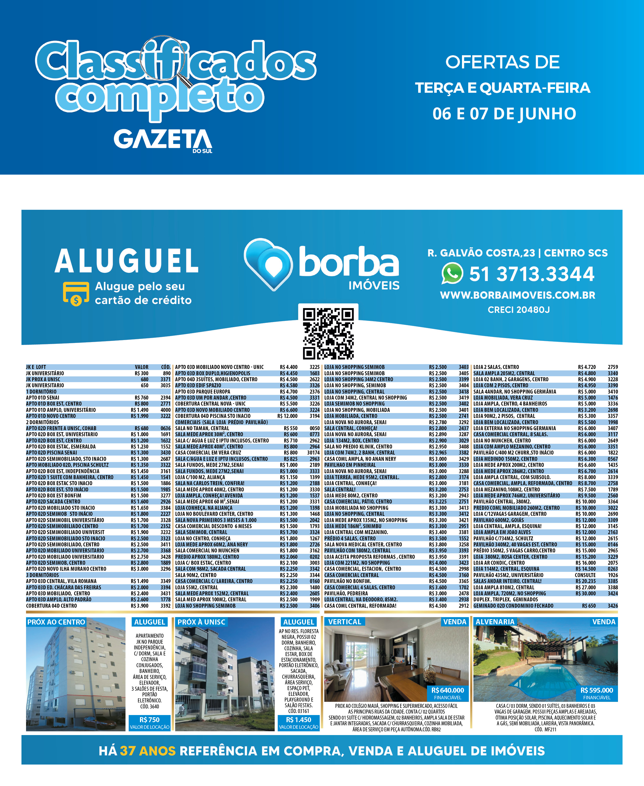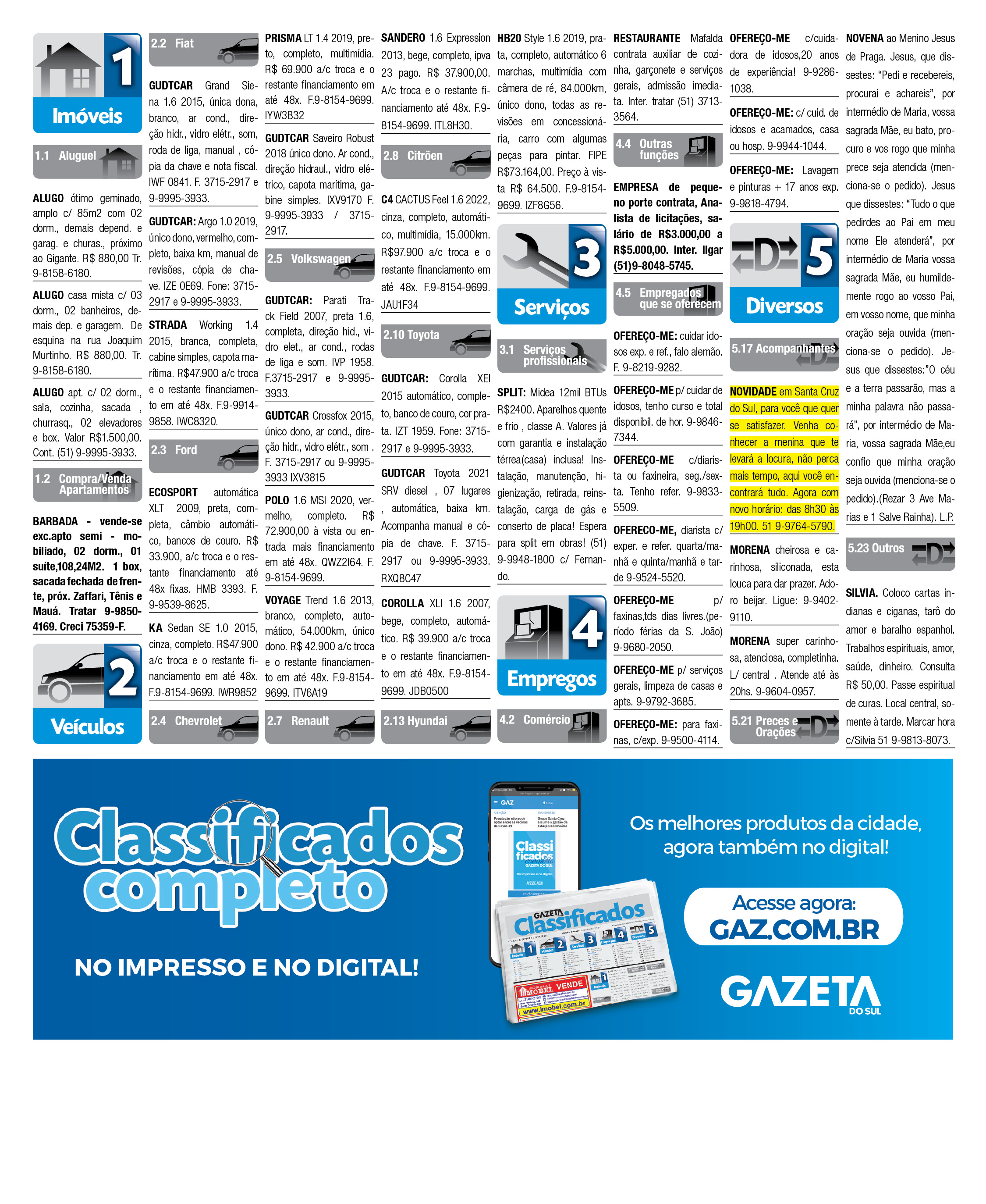O suplemento de Classificados, que circula nas edições de terças, quintas e sábados, é um dos mais tradicionais da Gazeta do Sul, como vitrine e canal de negócios, de oferta, compra e venda em toda a região central do Rio Grande do Sul. E, para enriquecer pesquisas de produtos e serviços e possibilitar resultado ainda melhor a usuários e parceiros, nos anúncios de clientes cadastrados, o leitor tem acesso direto com link ao site do anunciante, onde poderá verificar mais detalhes sobre os itens. Confira as ofertas: