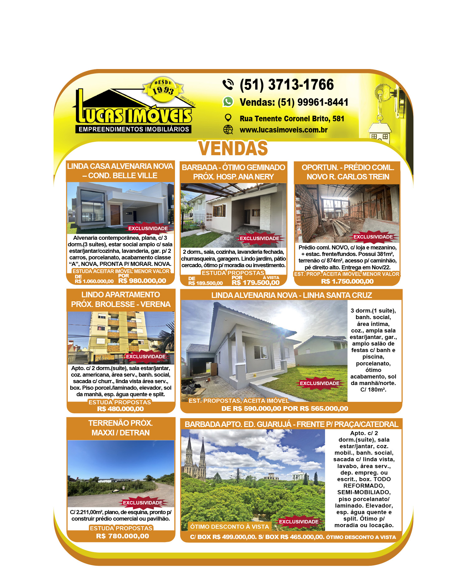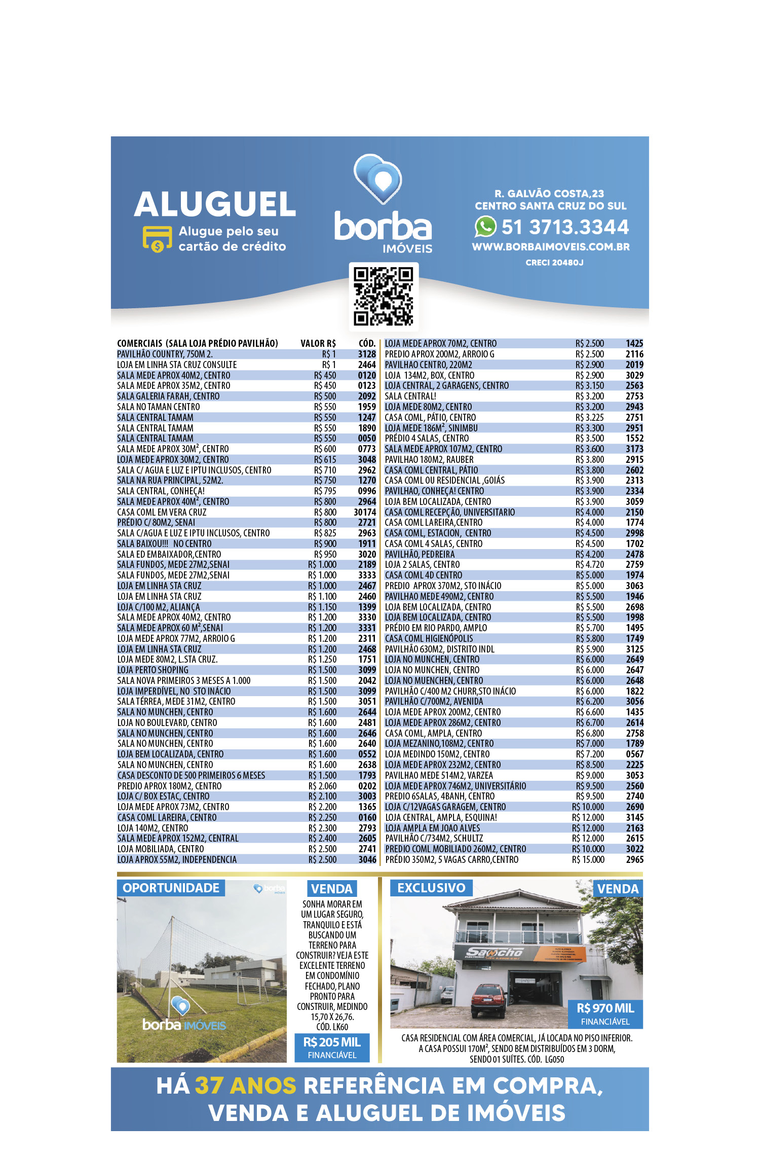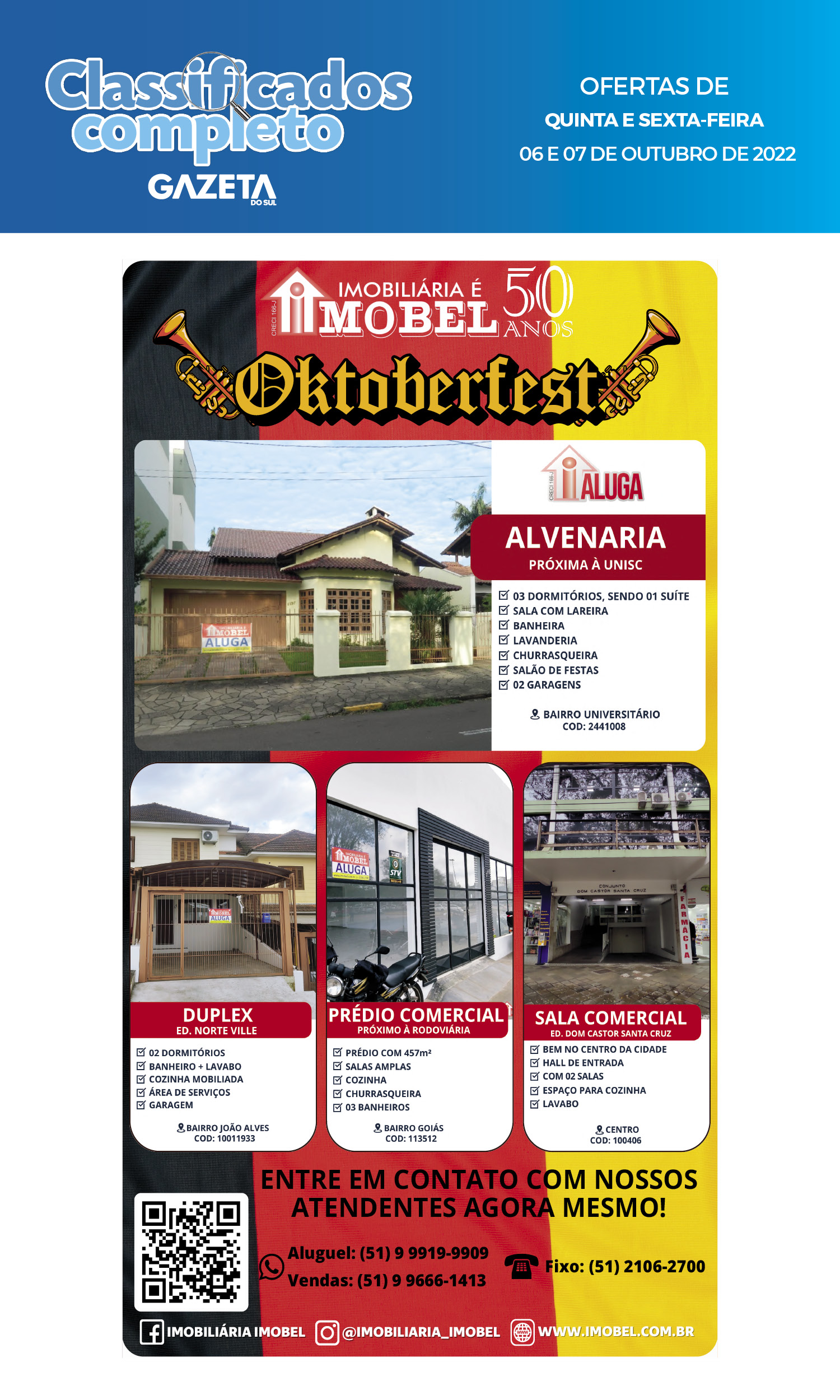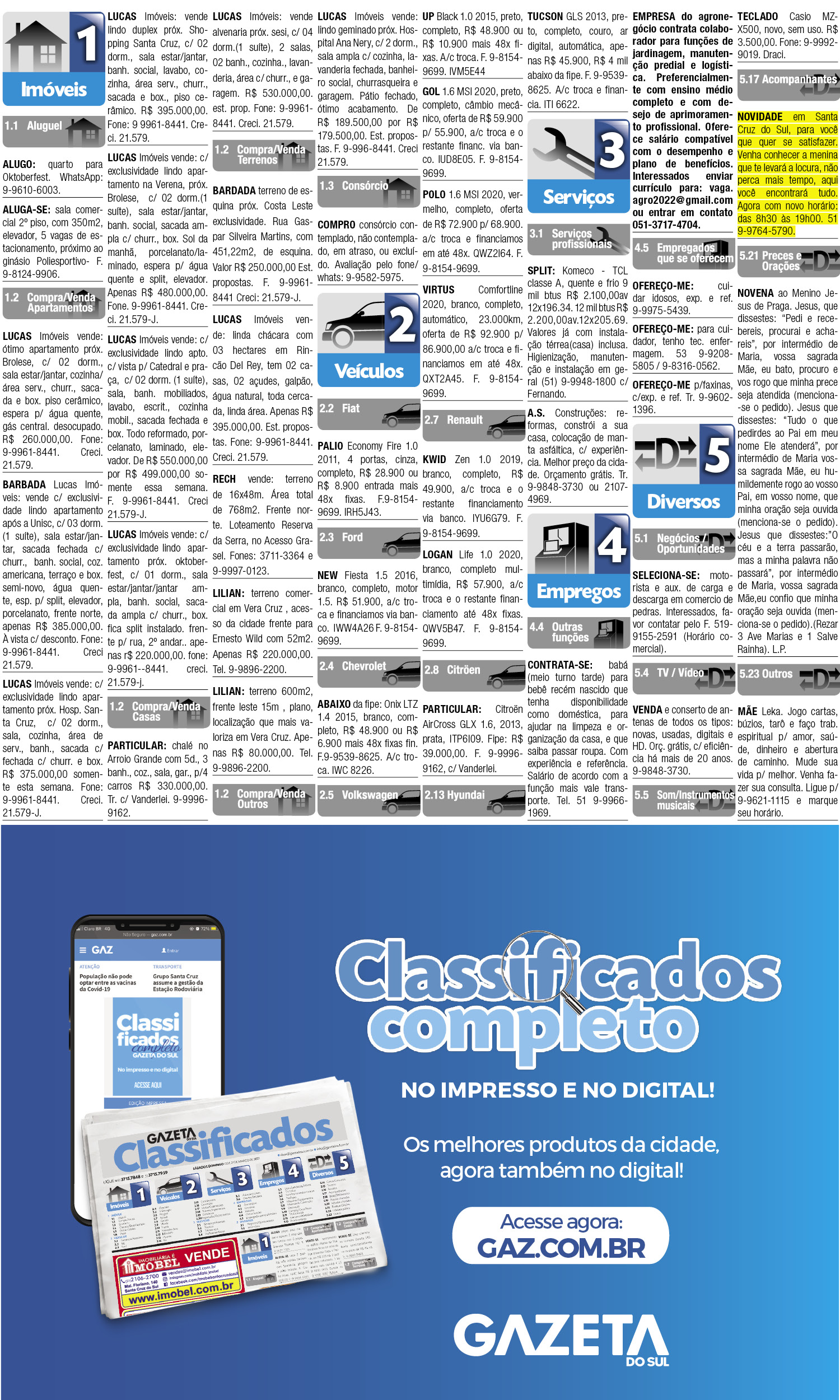 O suplemento de Classificados, que circula nas edições de terças, quintas e sábados, é um dos mais tradicionais da Gazeta do Sul, como vitrine e canal de negócios, de oferta, compra e venda em toda a região central do Rio Grande do Sul. E, para enriquecer pesquisas de produtos e serviços e possibilitar resultado ainda melhor a usuários e parceiros, nos anúncios de clientes cadastrados, o leitor tem acesso direto com link ao site do anunciante, onde poderá verificar mais detalhes sobre os itens. Confira as ofertas: