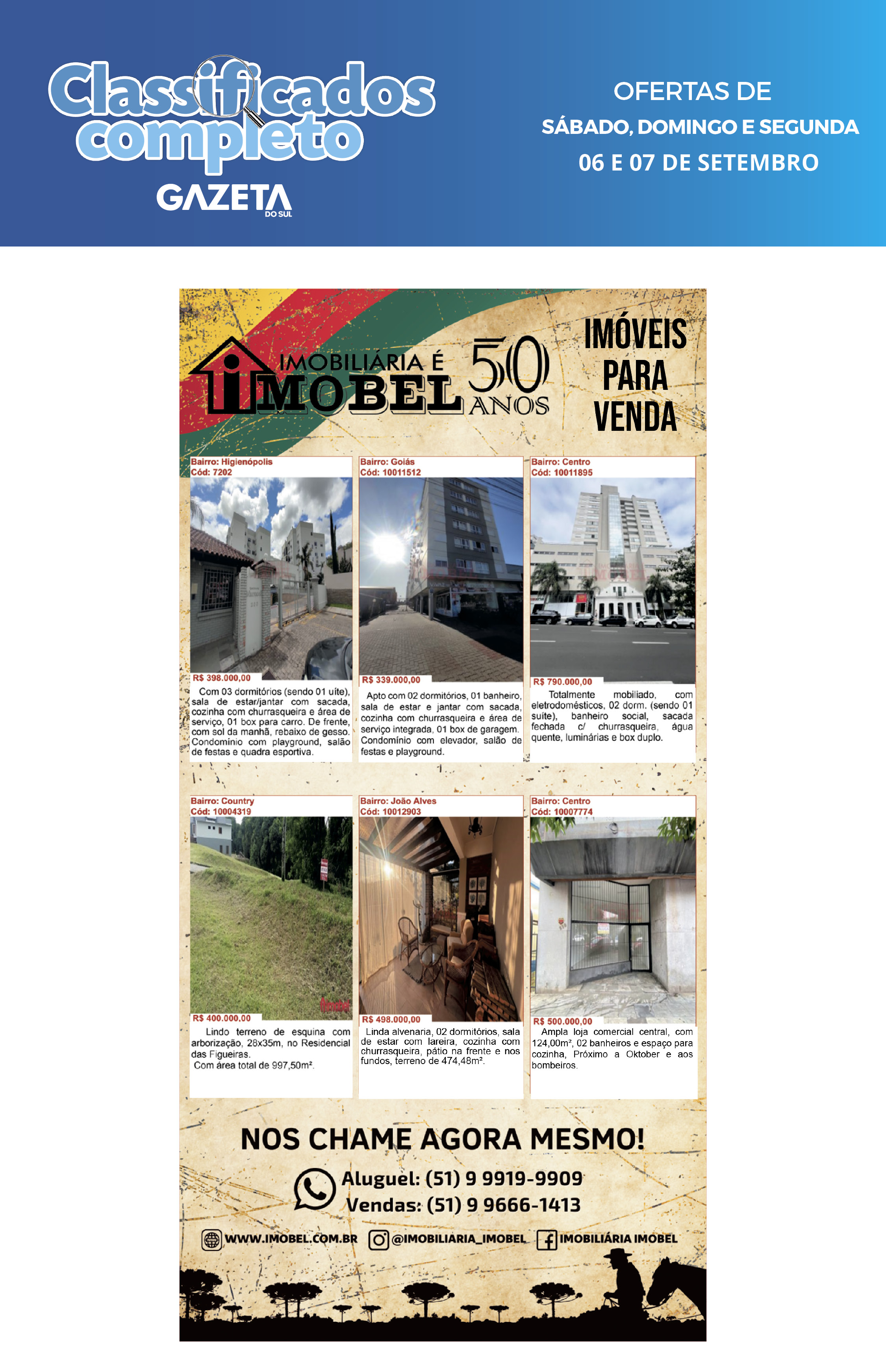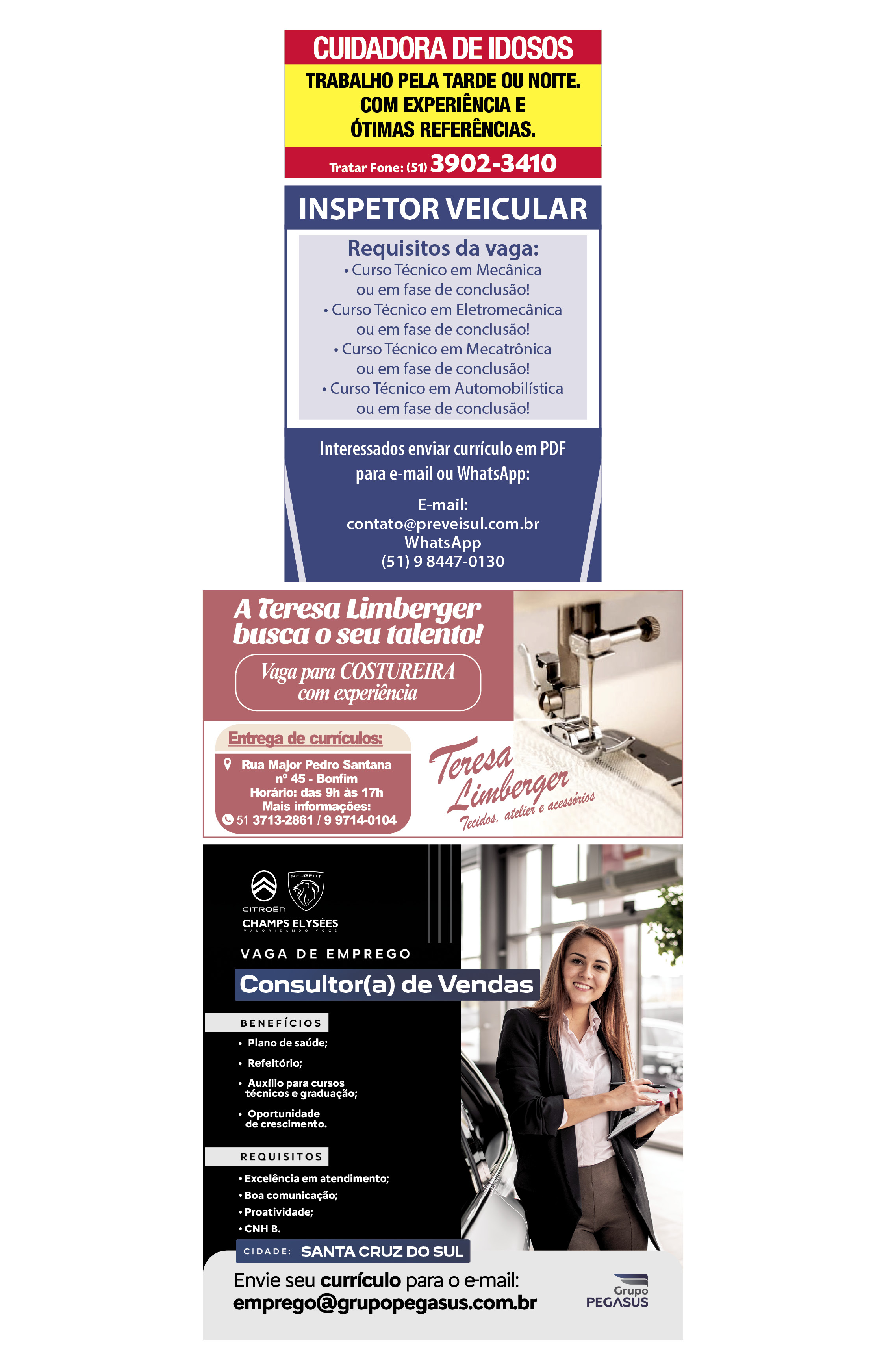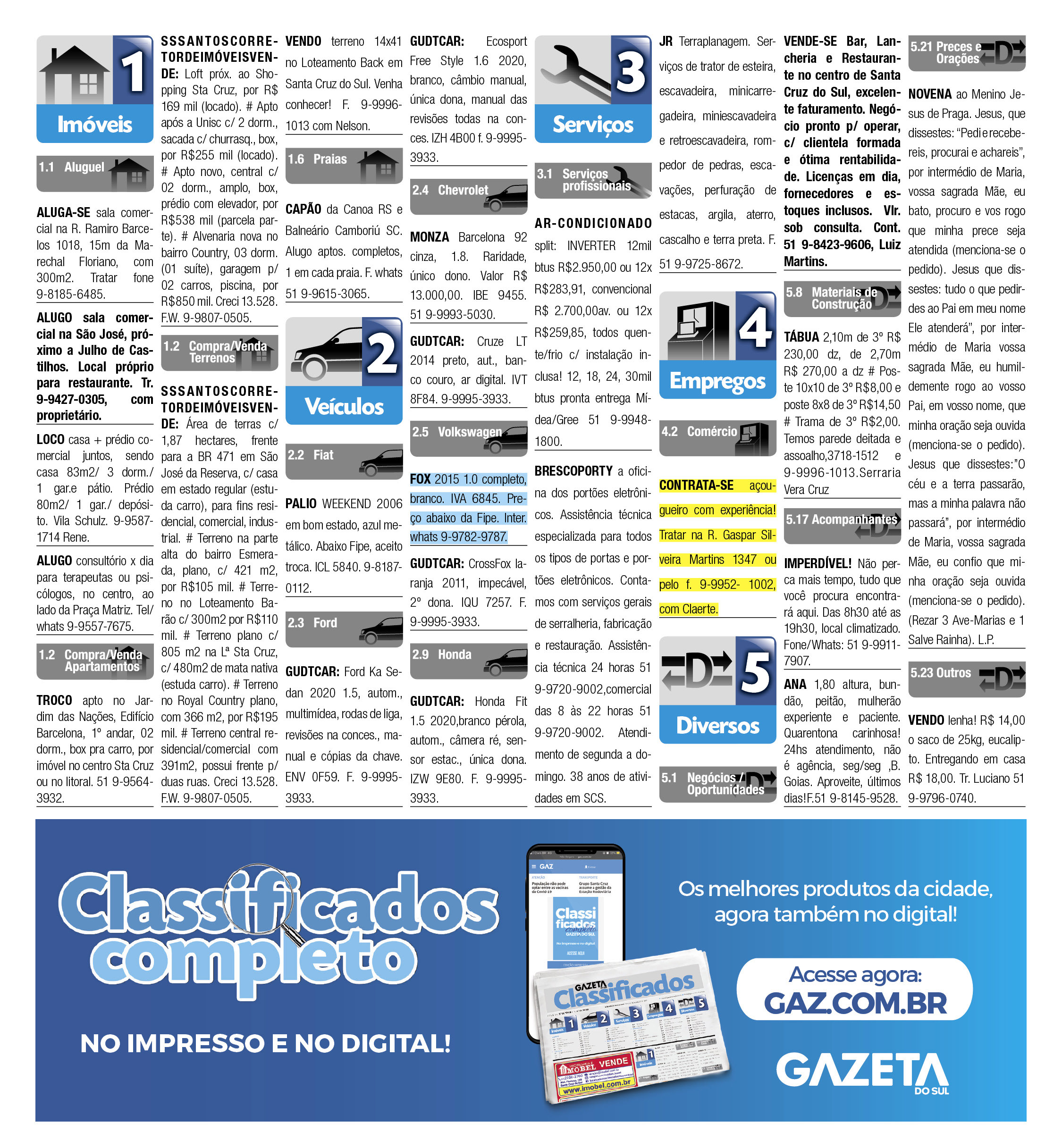 O suplemento de Classificados, que circula nas edições de terças, quintas e sábados, é um dos mais tradicionais da Gazeta do Sul, como vitrine e canal de negócios, de oferta, compra e venda em toda a região central do Rio Grande do Sul. E, para enriquecer pesquisas de produtos e serviços e possibilitar resultado ainda melhor a usuários e parceiros, nos anúncios de clientes cadastrados, o leitor tem acesso direto com link ao site do anunciante, onde poderá verificar mais detalhes sobre os itens. Confira as ofertas: