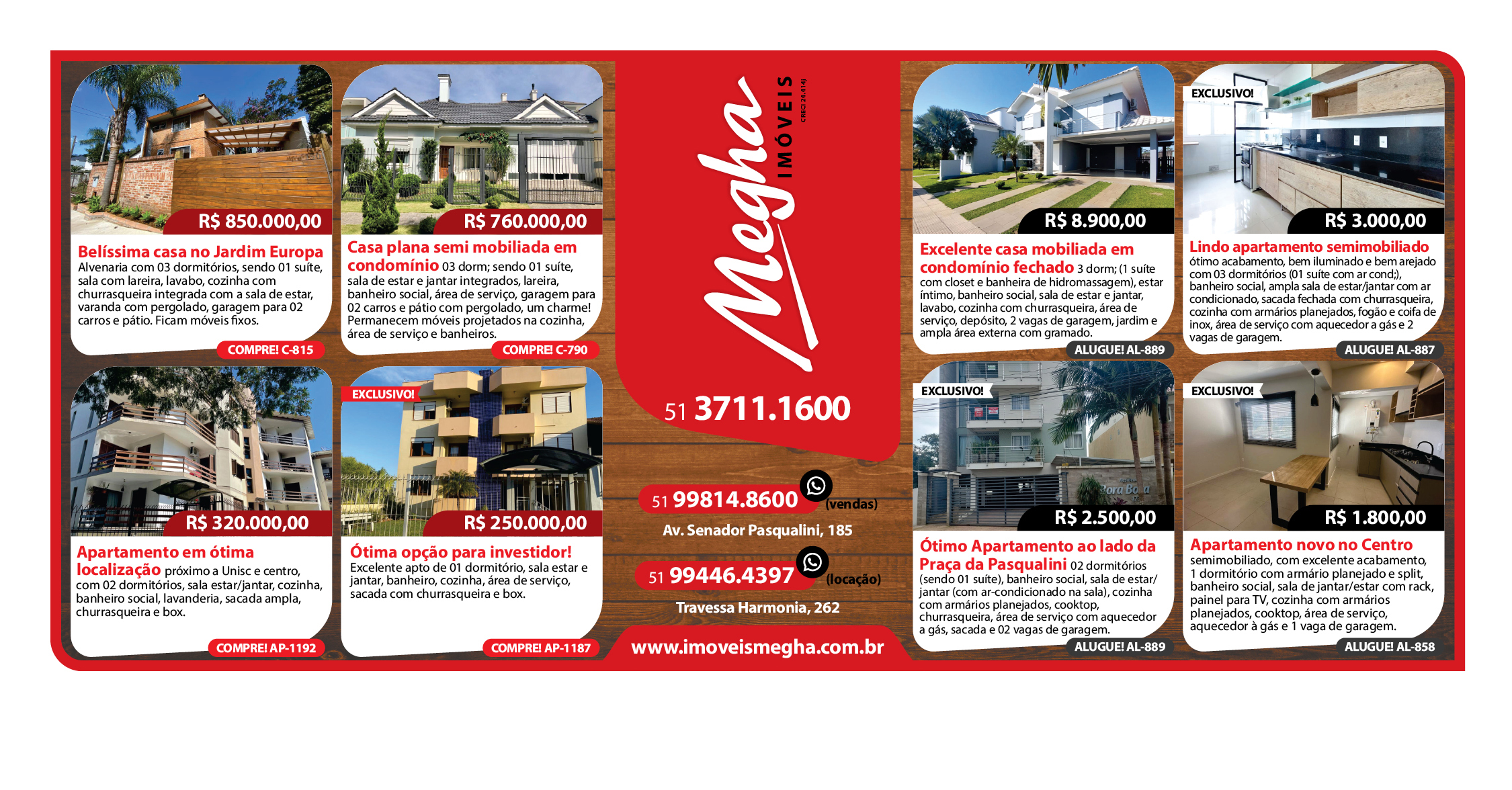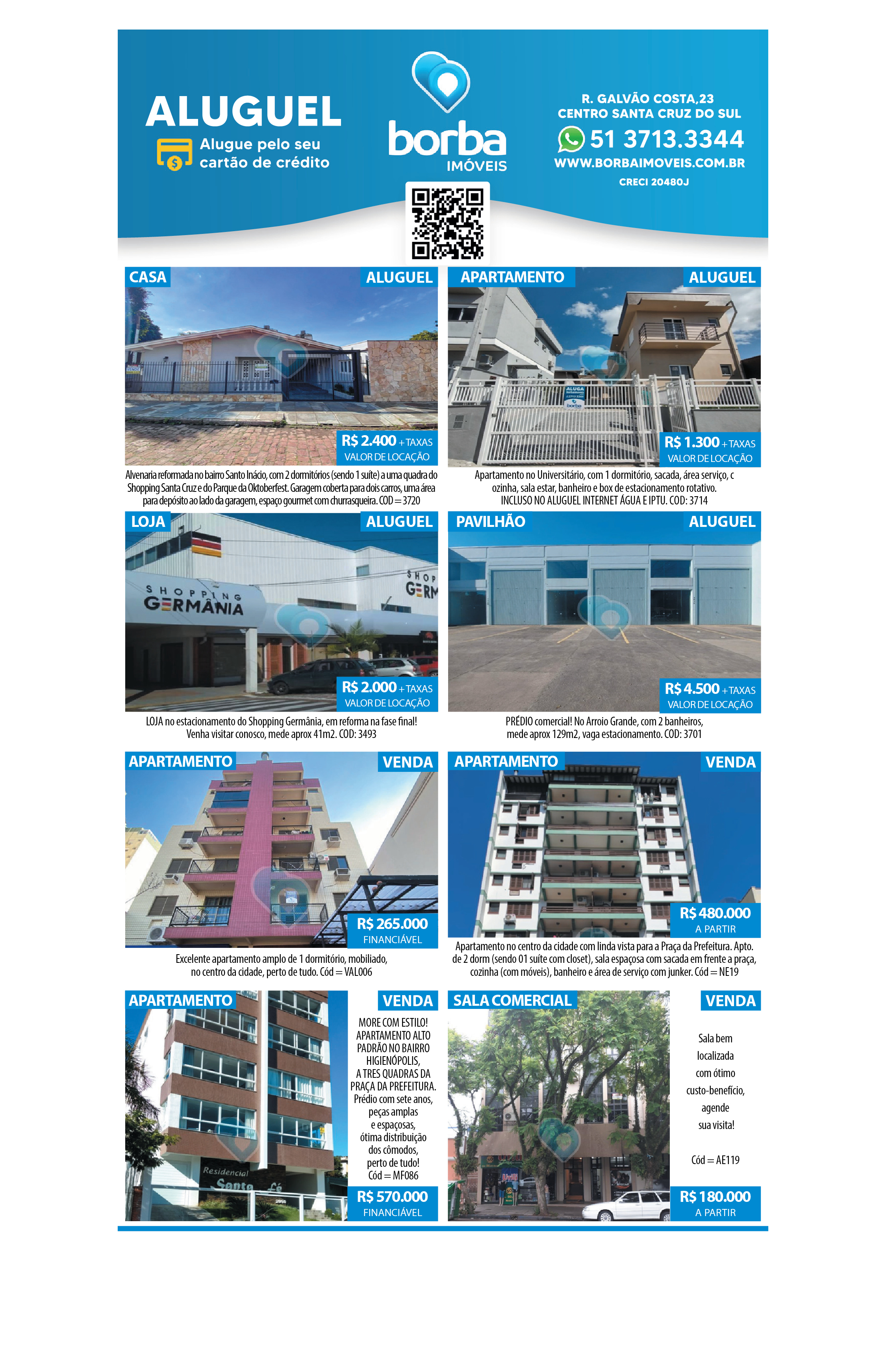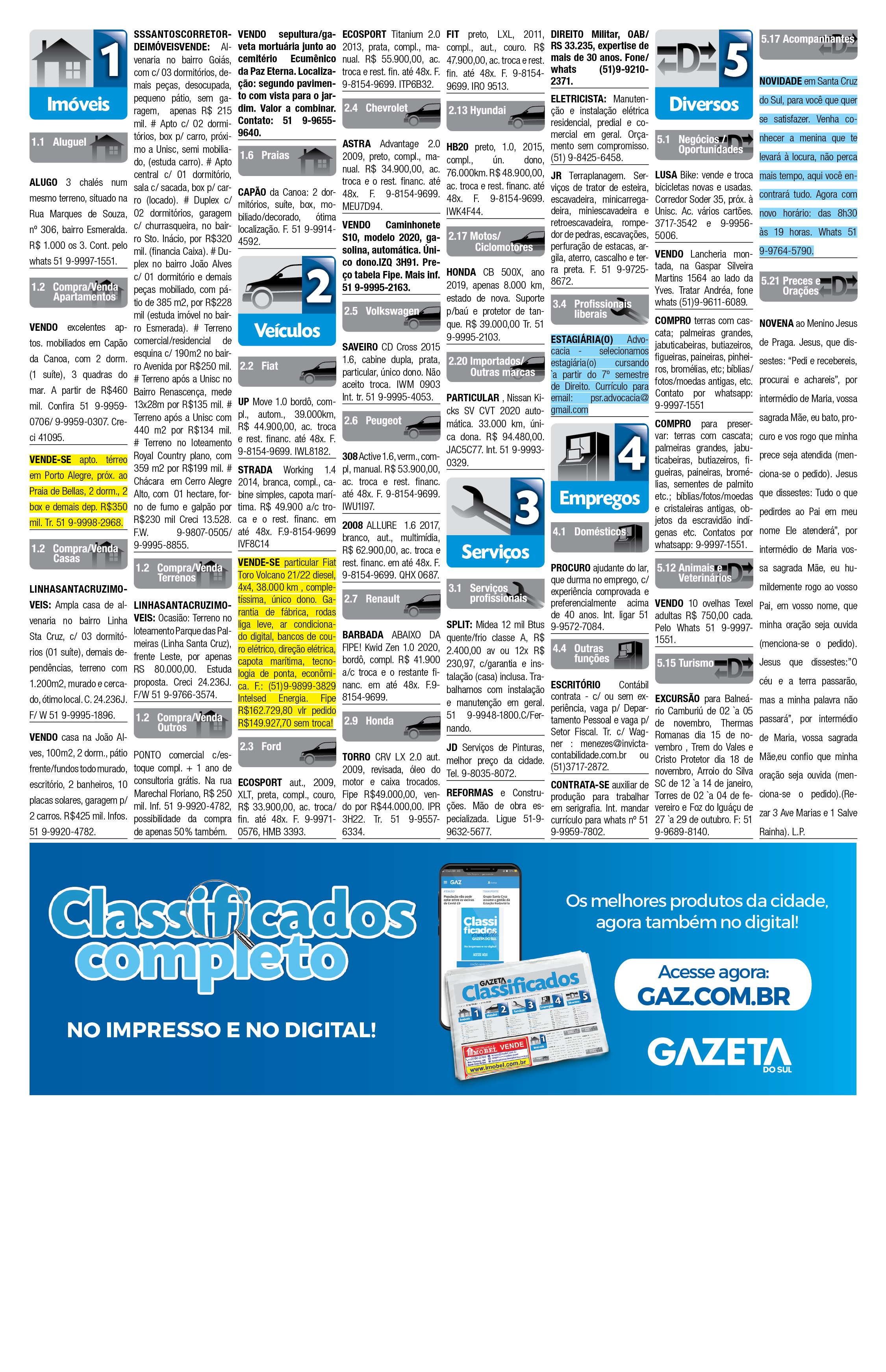 O suplemento de Classificados, que circula nas edições de terças, quintas e sábados, é um dos mais tradicionais da Gazeta do Sul, como vitrine e canal de negócios, de oferta, compra e venda em toda a região central do Rio Grande do Sul. E, para enriquecer pesquisas de produtos e serviços e possibilitar resultado ainda melhor a usuários e parceiros, nos anúncios de clientes cadastrados, o leitor tem acesso direto com link ao site do anunciante, onde poderá verificar mais detalhes sobre os itens. Confira as ofertas: