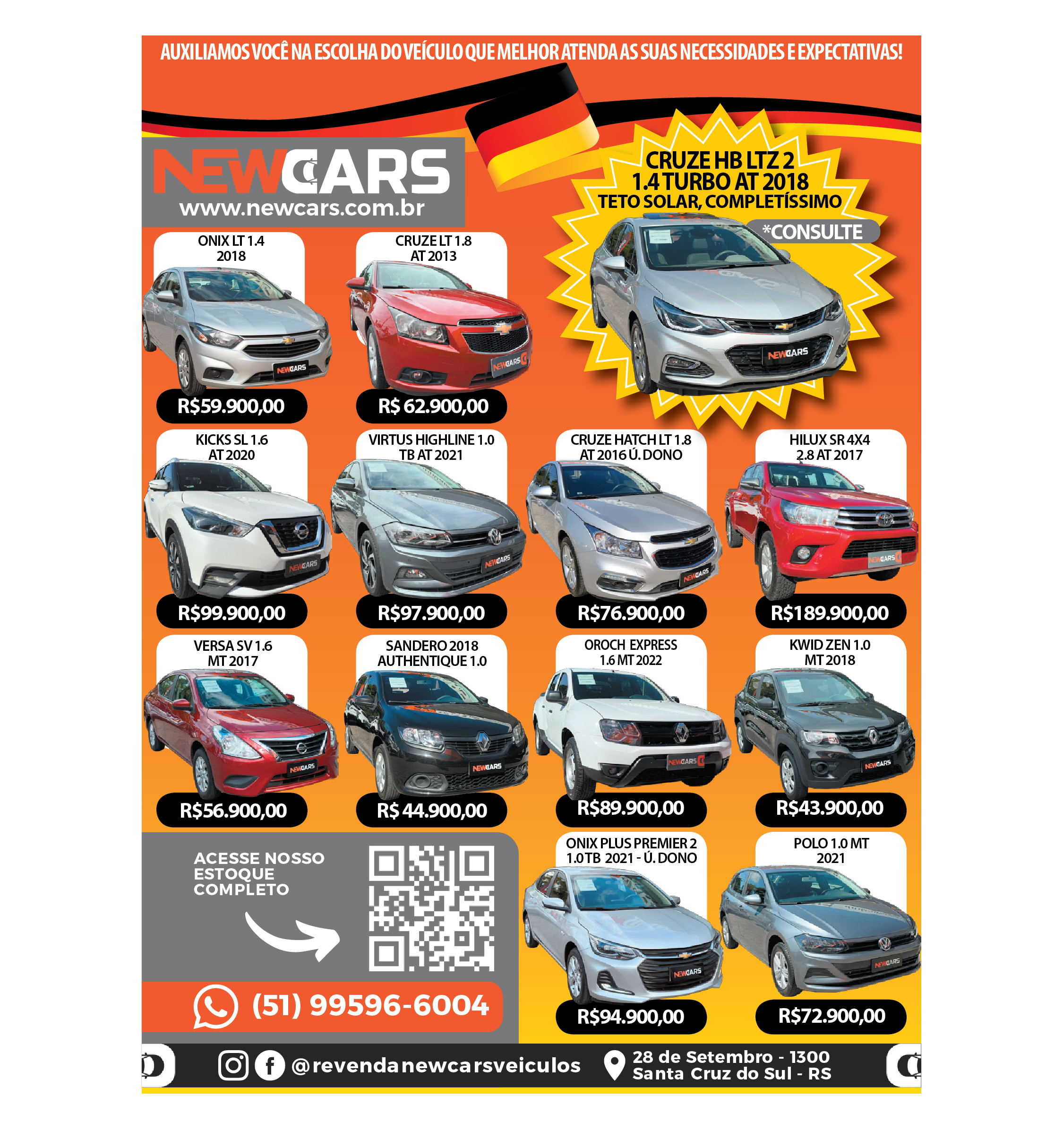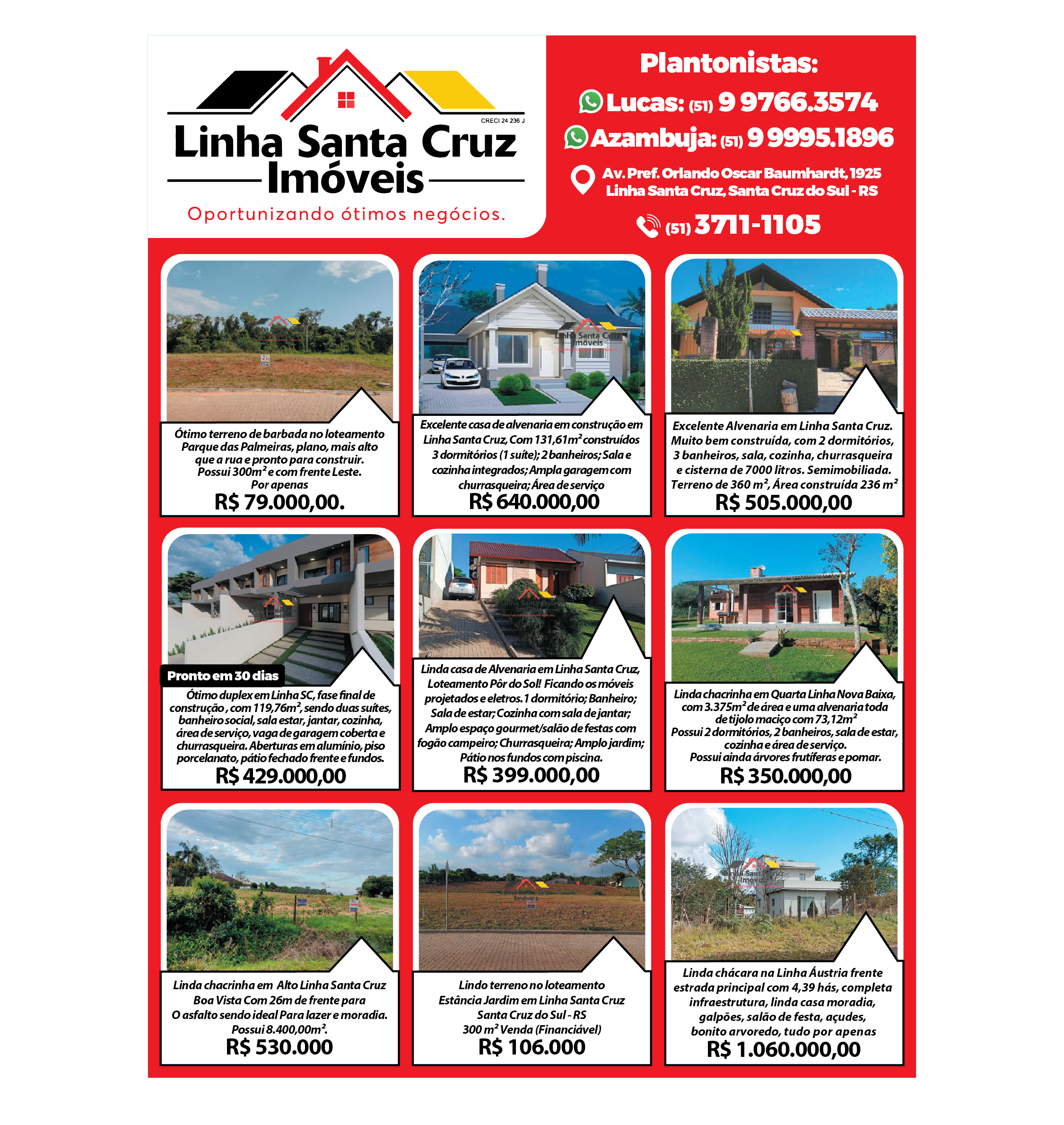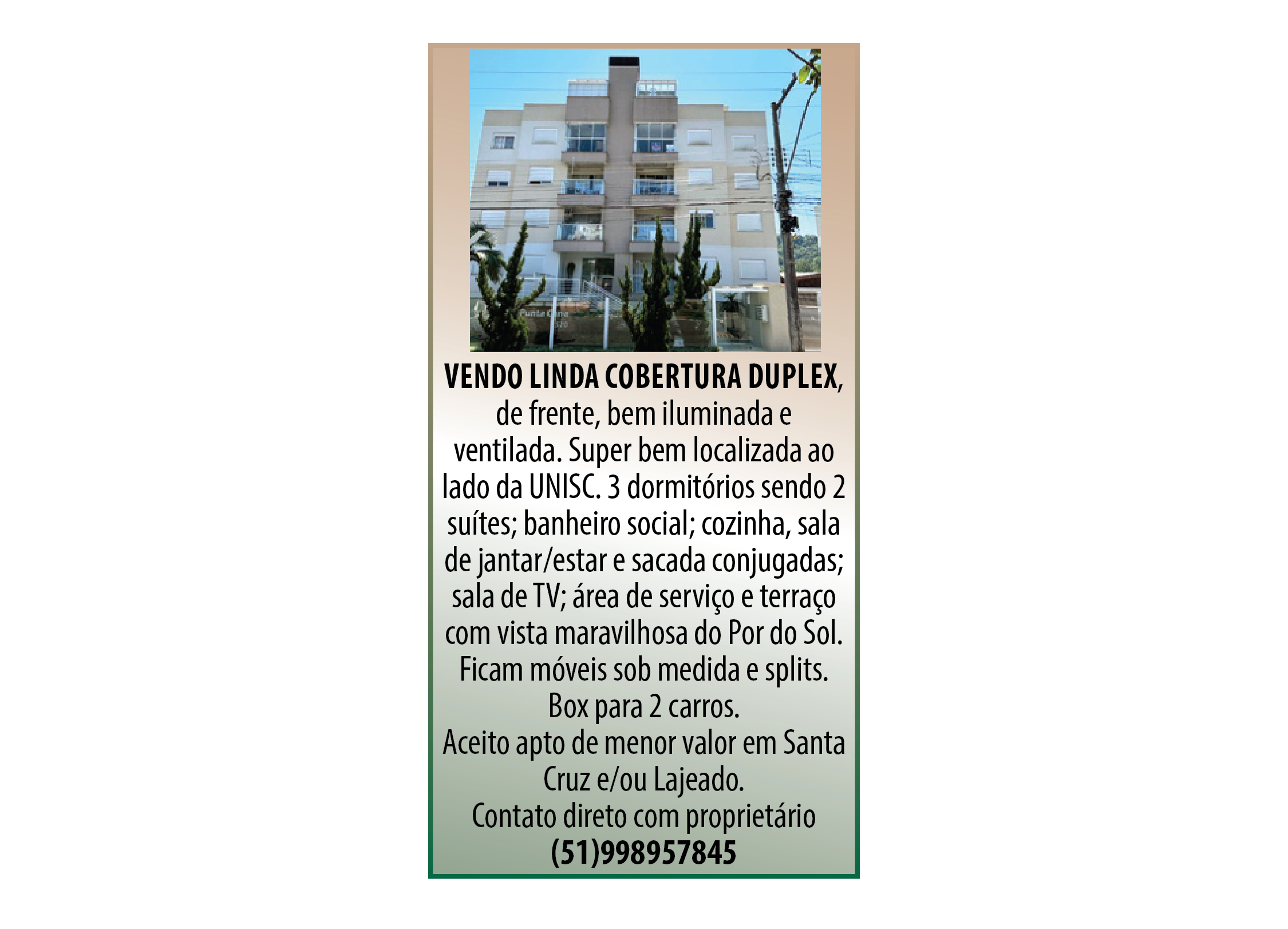 O suplemento de Classificados, que circula nas edições de terças, quintas e sábados, é um dos mais tradicionais da Gazeta do Sul, como vitrine e canal de negócios, de oferta, compra e venda em toda a região central do Rio Grande do Sul. E, para enriquecer pesquisas de produtos e serviços e possibilitar resultado ainda melhor a usuários e parceiros, nos anúncios de clientes cadastrados, o leitor tem acesso direto com link ao site do anunciante, onde poderá verificar mais detalhes sobre os itens. Confira as ofertas: