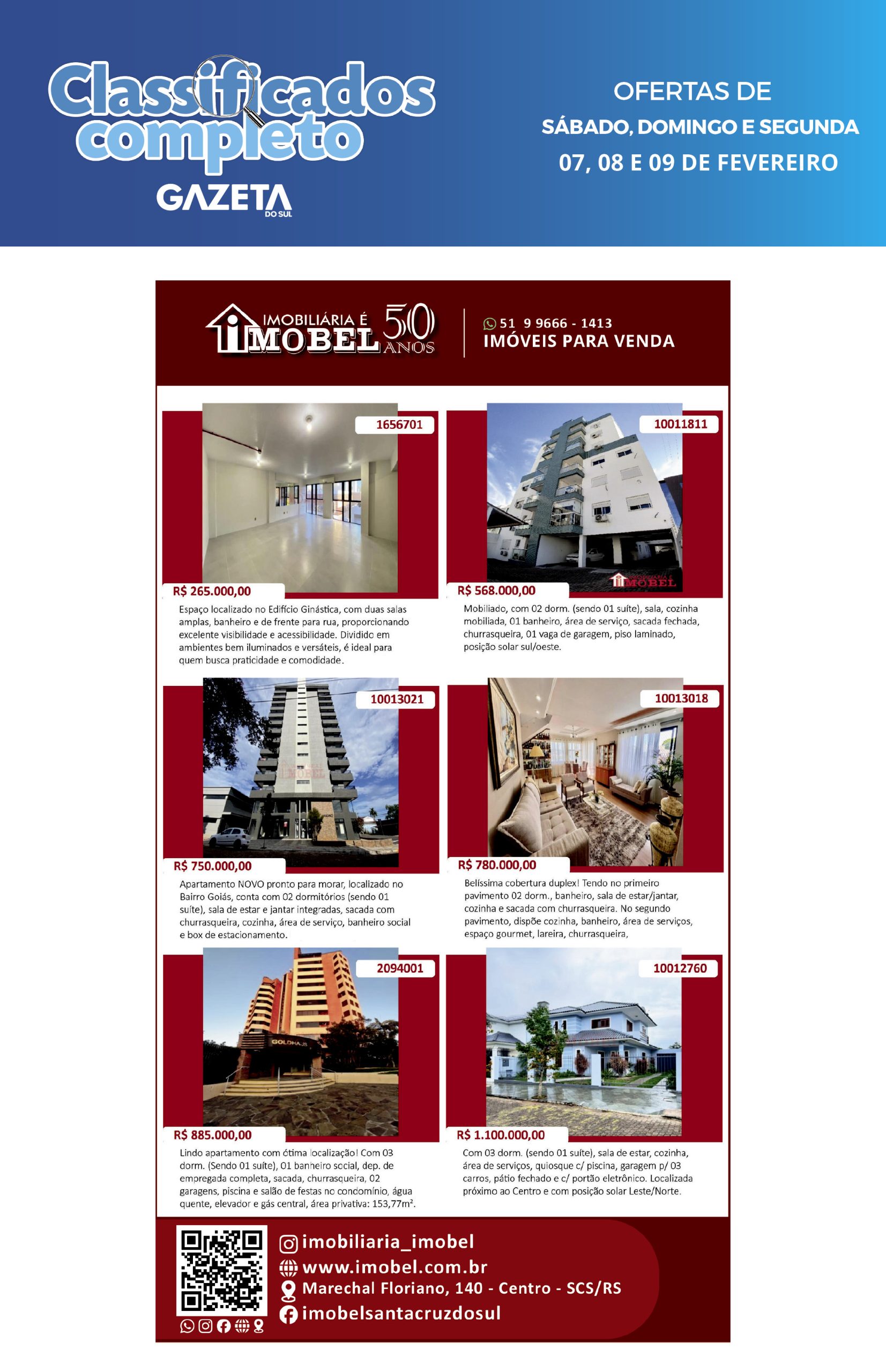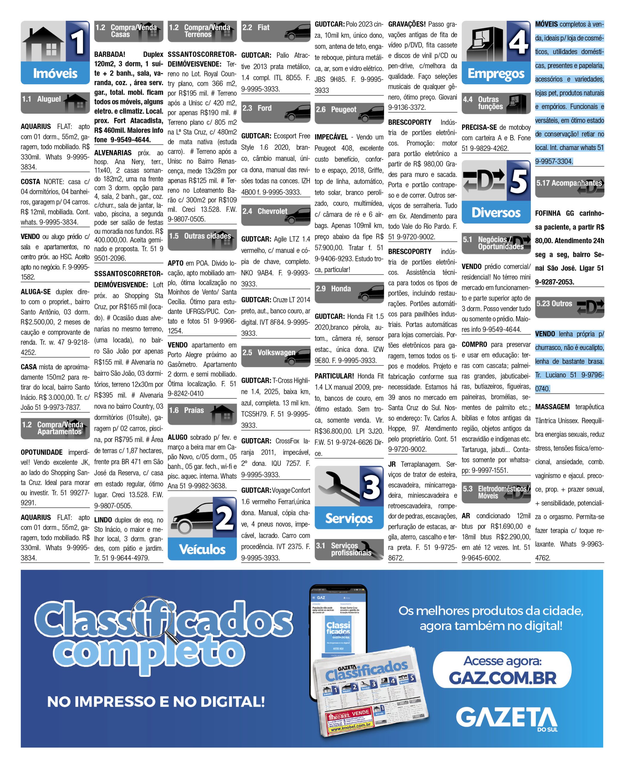 O suplemento de Classificados, que circula nas edições de terças, quintas e sábados, é um dos mais tradicionais da Gazeta do Sul, como vitrine e canal de negócios, de oferta, compra e venda em toda a região central do Rio Grande do Sul. E, para enriquecer pesquisas de produtos e serviços e possibilitar resultado ainda melhor a usuários e parceiros, nos anúncios de clientes cadastrados, o leitor tem acesso direto com link ao site do anunciante, onde poderá verificar mais detalhes sobre os itens. Confira as ofertas: