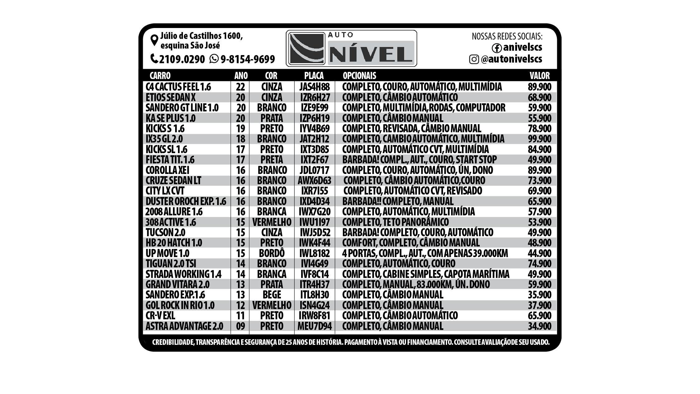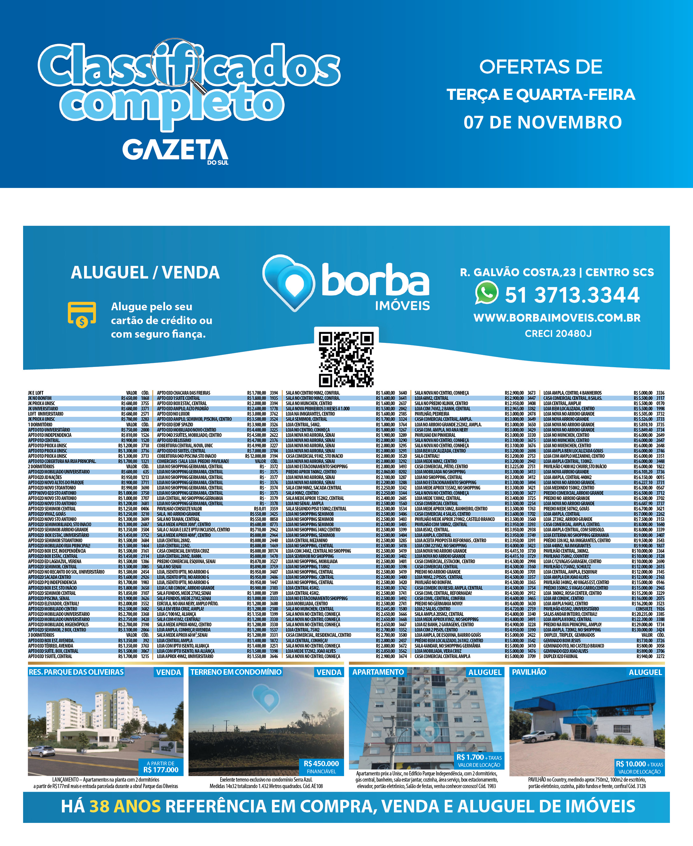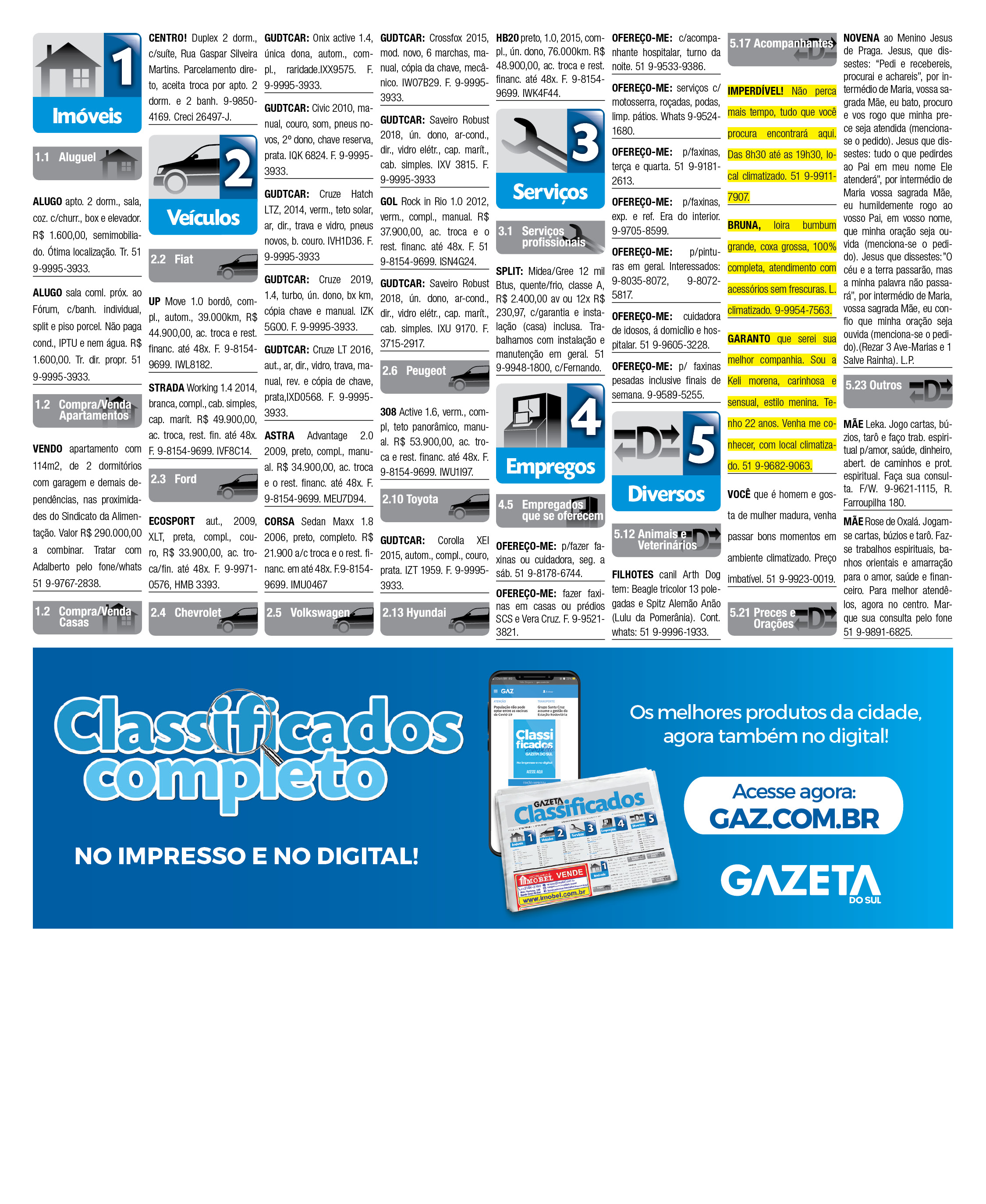 O suplemento de Classificados, que circula nas edições de terças, quintas e sábados, é um dos mais tradicionais da Gazeta do Sul, como vitrine e canal de negócios, de oferta, compra e venda em toda a região central do Rio Grande do Sul. E, para enriquecer pesquisas de produtos e serviços e possibilitar resultado ainda melhor a usuários e parceiros, nos anúncios de clientes cadastrados, o leitor tem acesso direto com link ao site do anunciante, onde poderá verificar mais detalhes sobre os itens. Confira as ofertas: