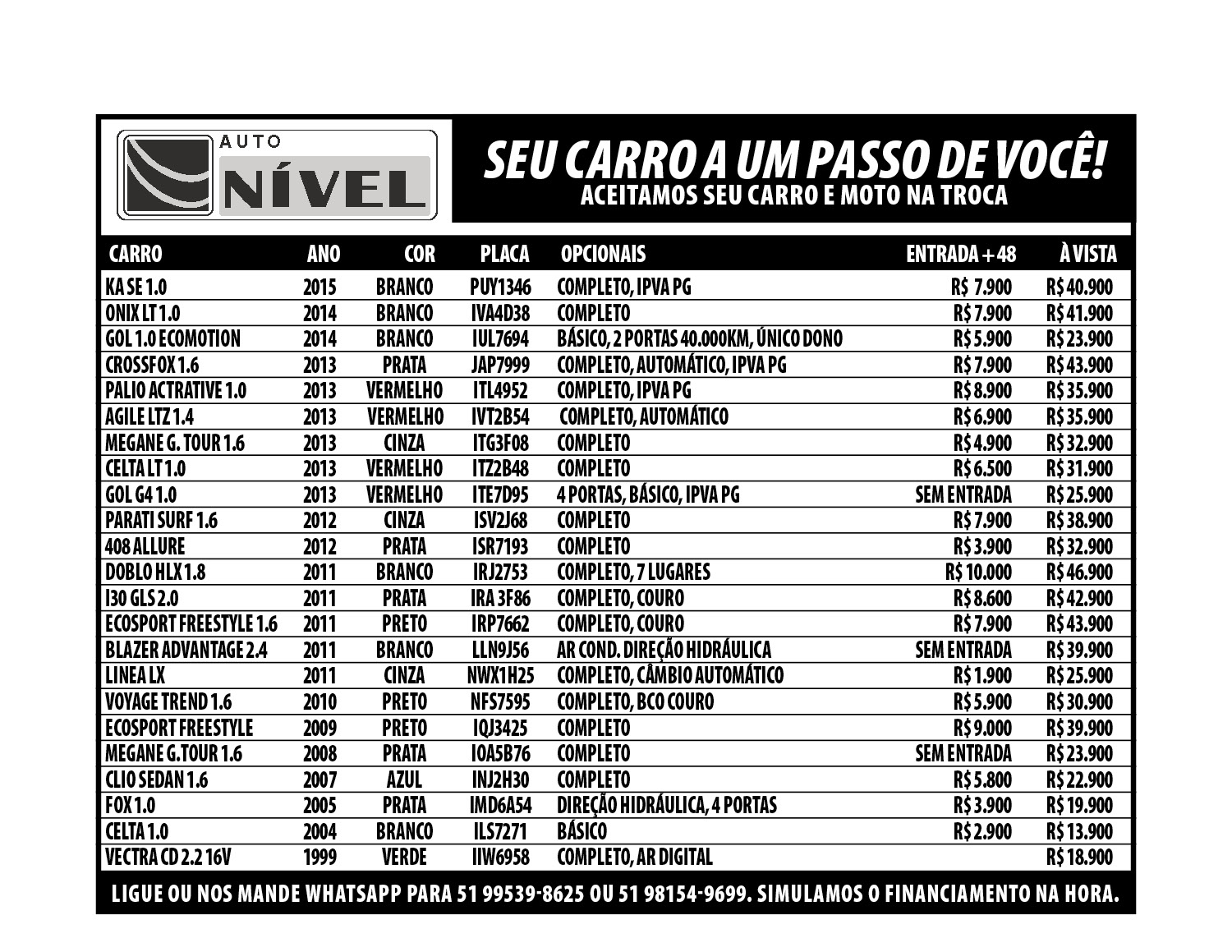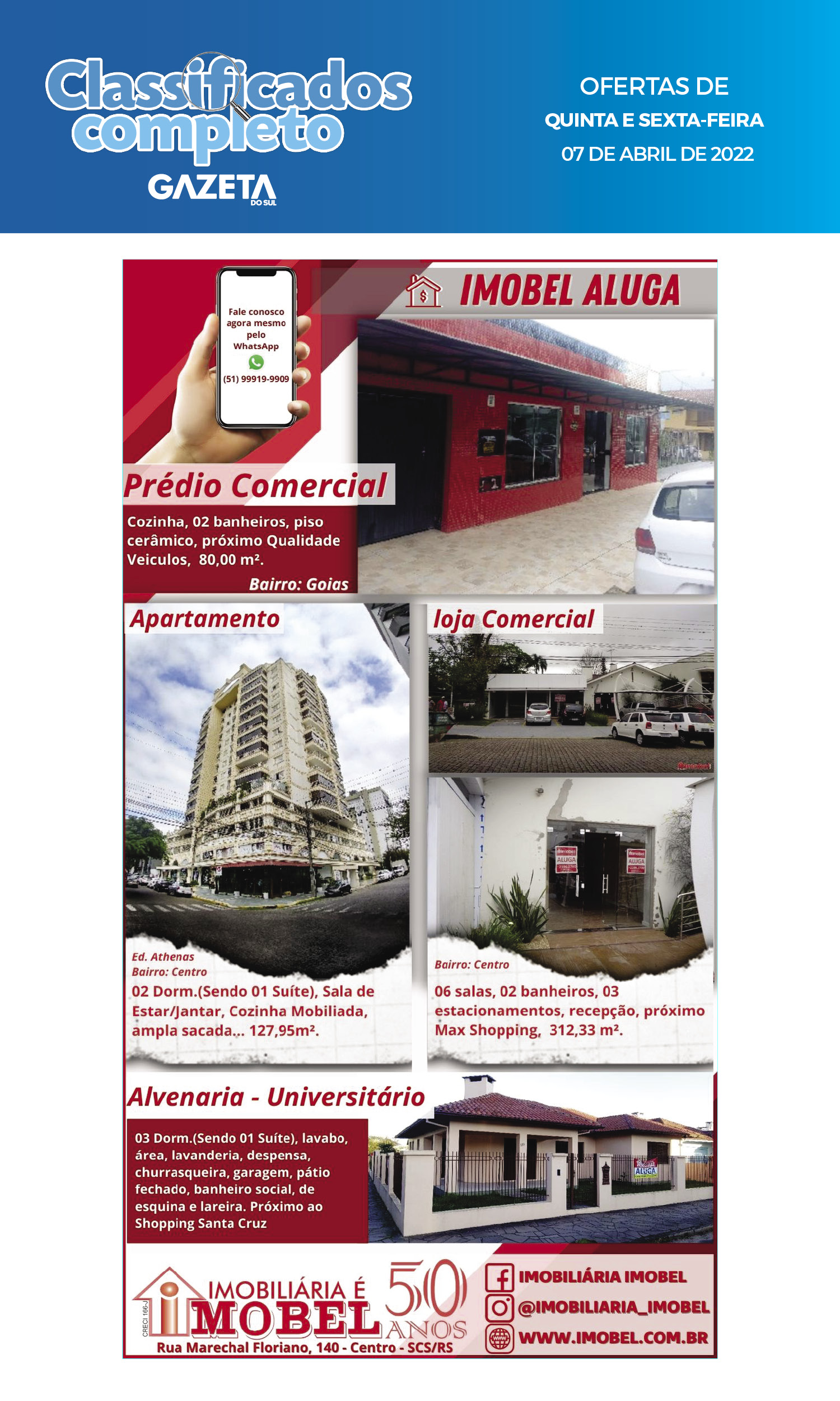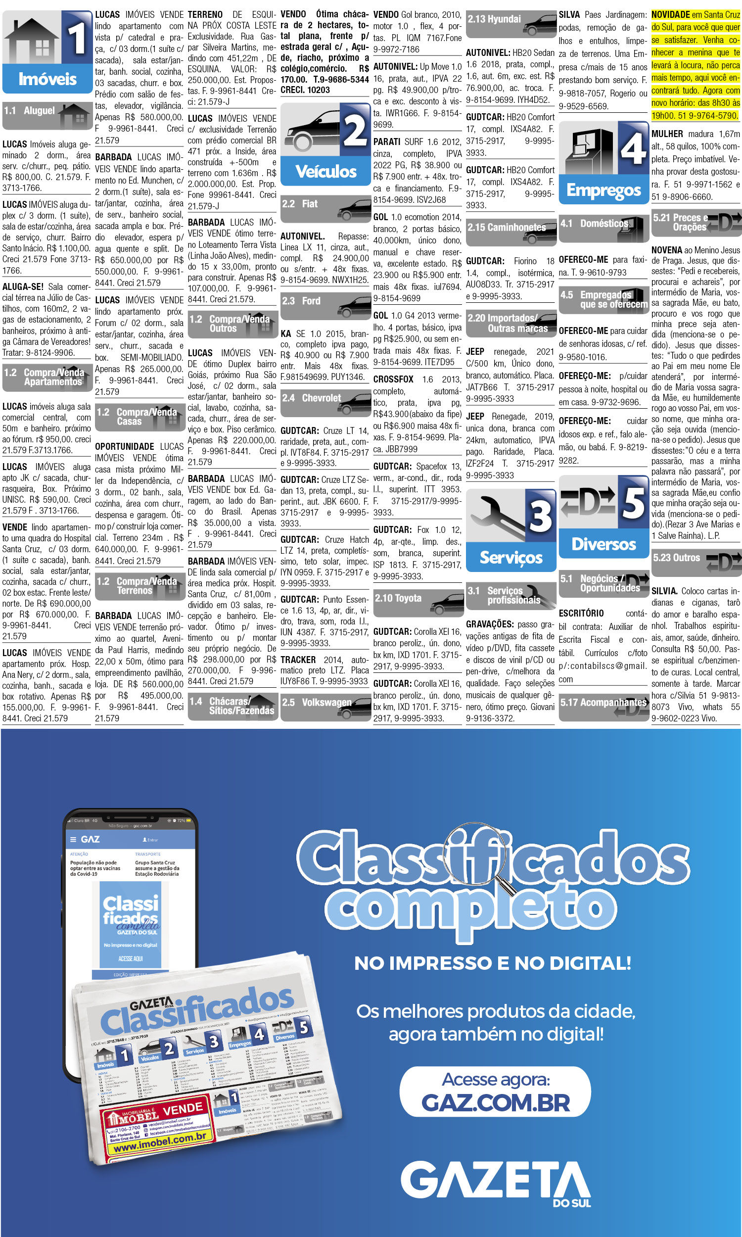 O suplemento de Classificados, que circula nas edições de terças, quintas e sábados, é um dos mais tradicionais da Gazeta do Sul, como vitrine e canal de negócios, de oferta, compra e venda em toda a região central do Rio Grande do Sul. E, para enriquecer pesquisas de produtos e serviços e possibilitar resultado ainda melhor a usuários e parceiros, nos anúncios de clientes cadastrados, o leitor tem acesso direto com link ao site do anunciante, onde poderá verificar mais detalhes sobre os itens. Confira as ofertas: