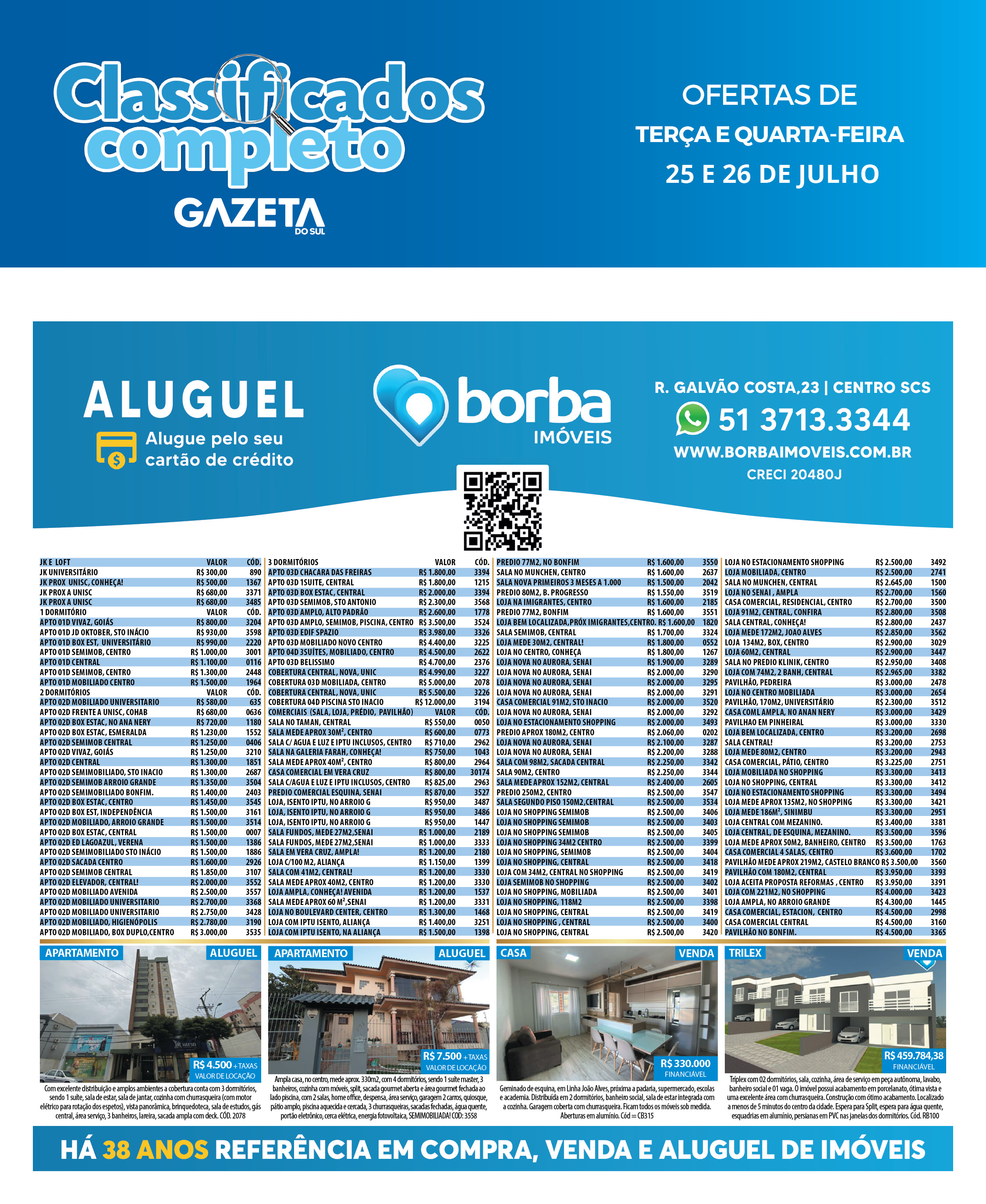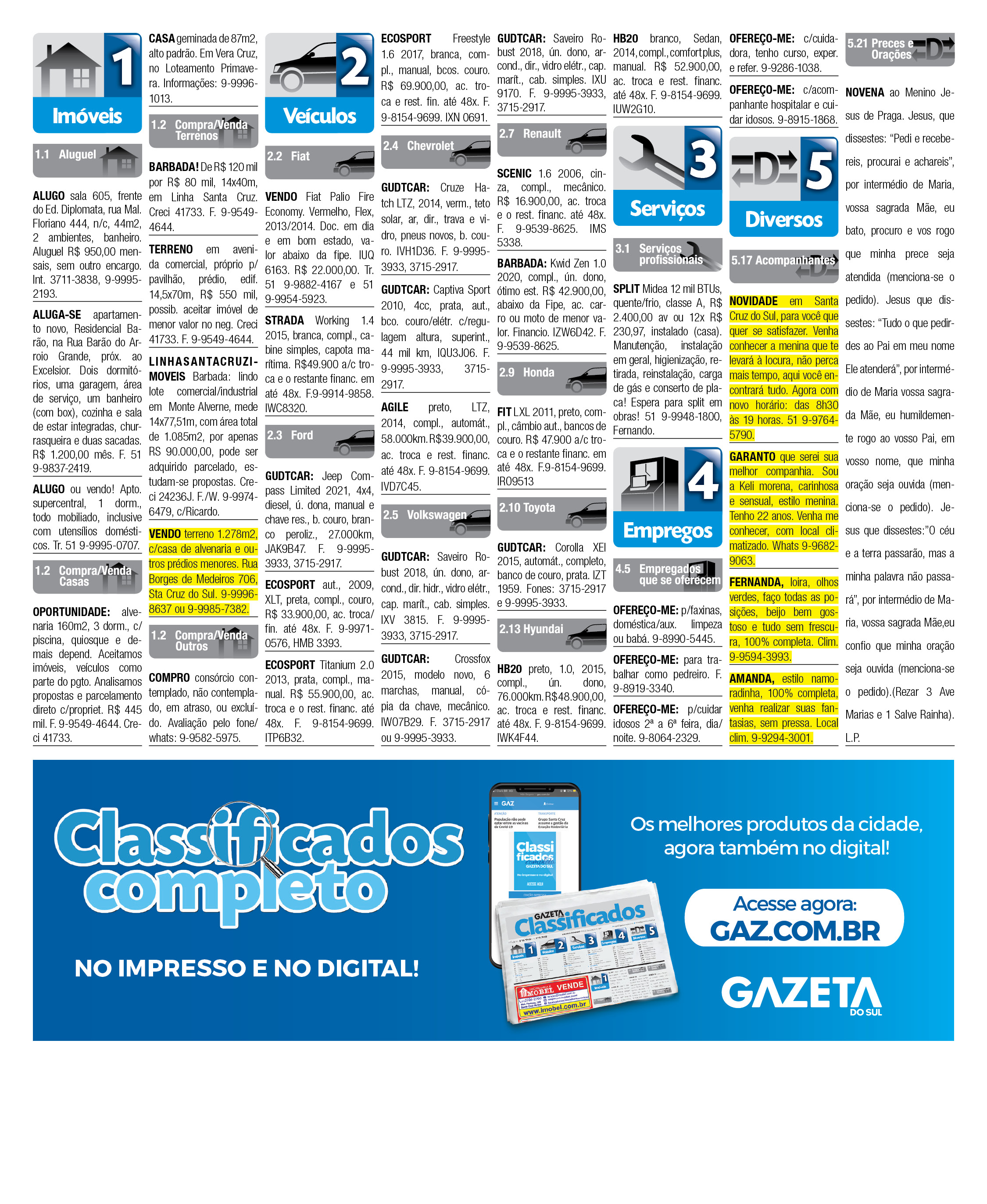 O suplemento de Classificados, que circula nas edições de terças, quintas e sábados, é um dos mais tradicionais da Gazeta do Sul, como vitrine e canal de negócios, de oferta, compra e venda em toda a região central do Rio Grande do Sul. E, para enriquecer pesquisas de produtos e serviços e possibilitar resultado ainda melhor a usuários e parceiros, nos anúncios de clientes cadastrados, o leitor tem acesso direto com link ao site do anunciante, onde poderá verificar mais detalhes sobre os itens. Confira as ofertas: